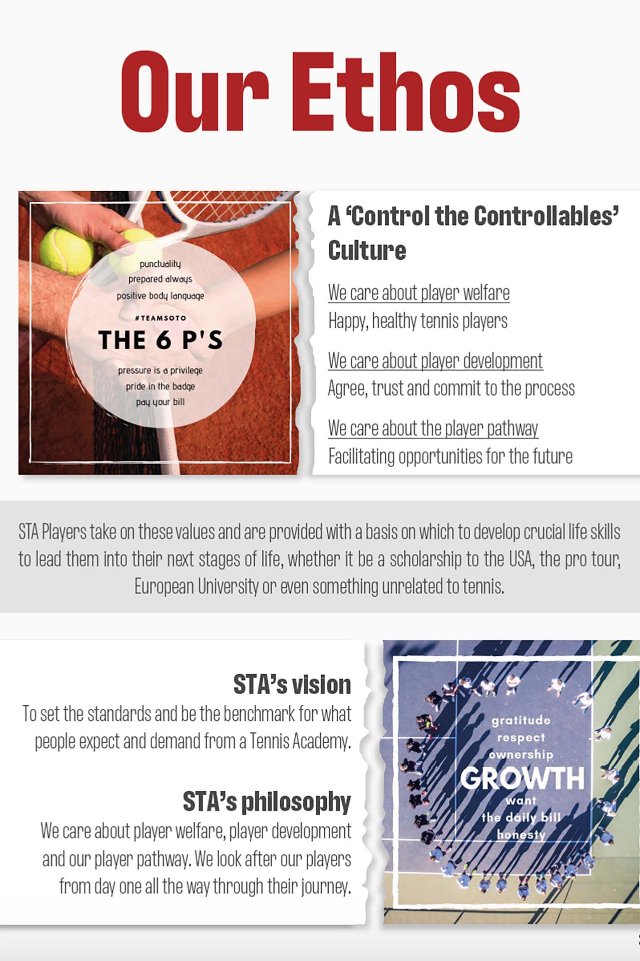 Sie bieten eine einzigartige Ausgewogenheit von Tennis- und Bildungsprogrammen, die ganjährig verfügbar sind, und wo auf europäischen roten Sandplätzen und Hartplätzen im amerikanischen Stil trainiert wird. Viele Spieler haben das Studium abgeschlossen und Stipendien an amerikanischen Universitäten erhalten. Die SotoTennis Academy arbeitet eng mit vielen Partnern zusammen, um ihren Spielern die besten Trainings-Erfahrungen zu bieten, wie beispielsweise der Sotogrande International School mit ihrer „Elite-Sportprogrammausbildung“.