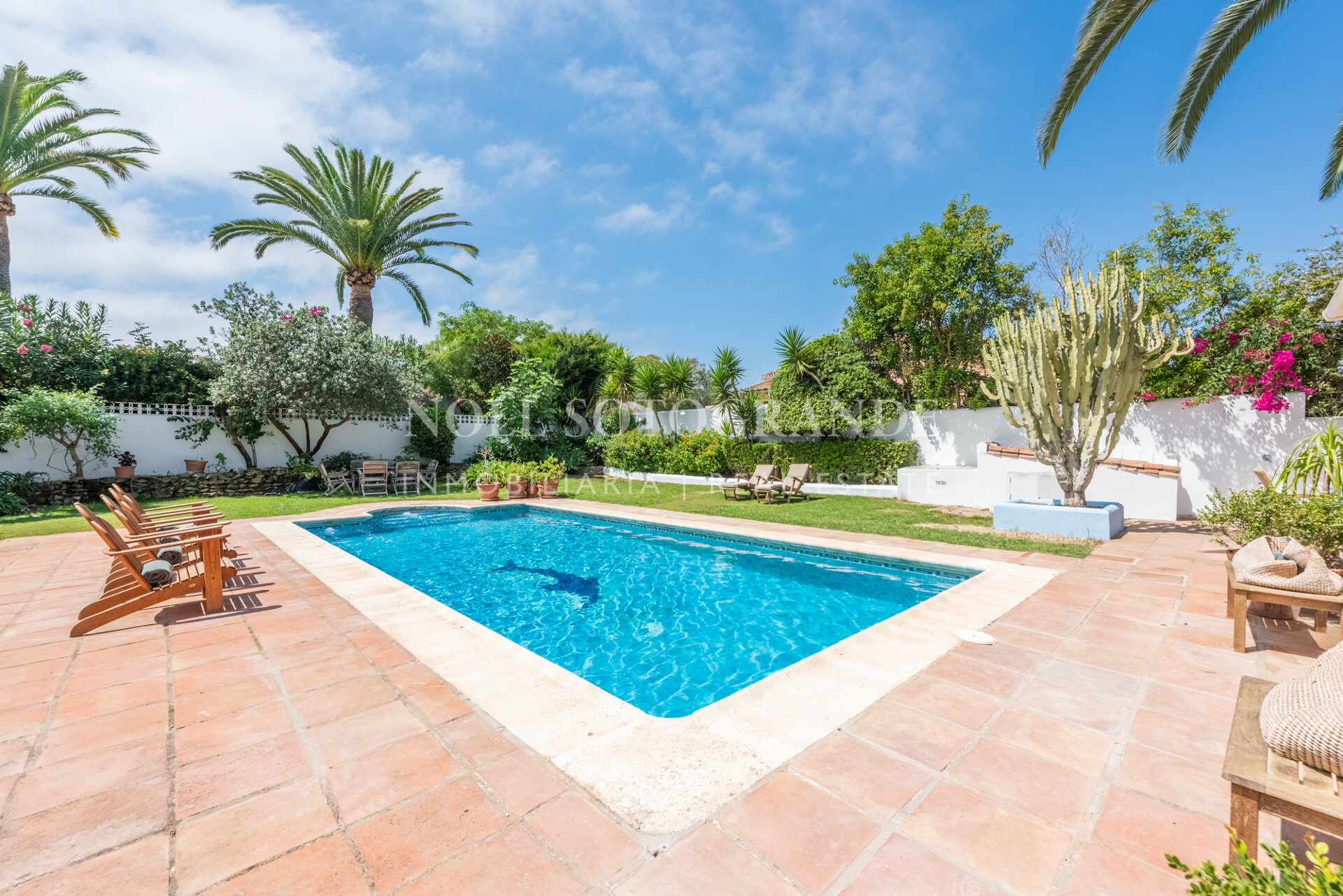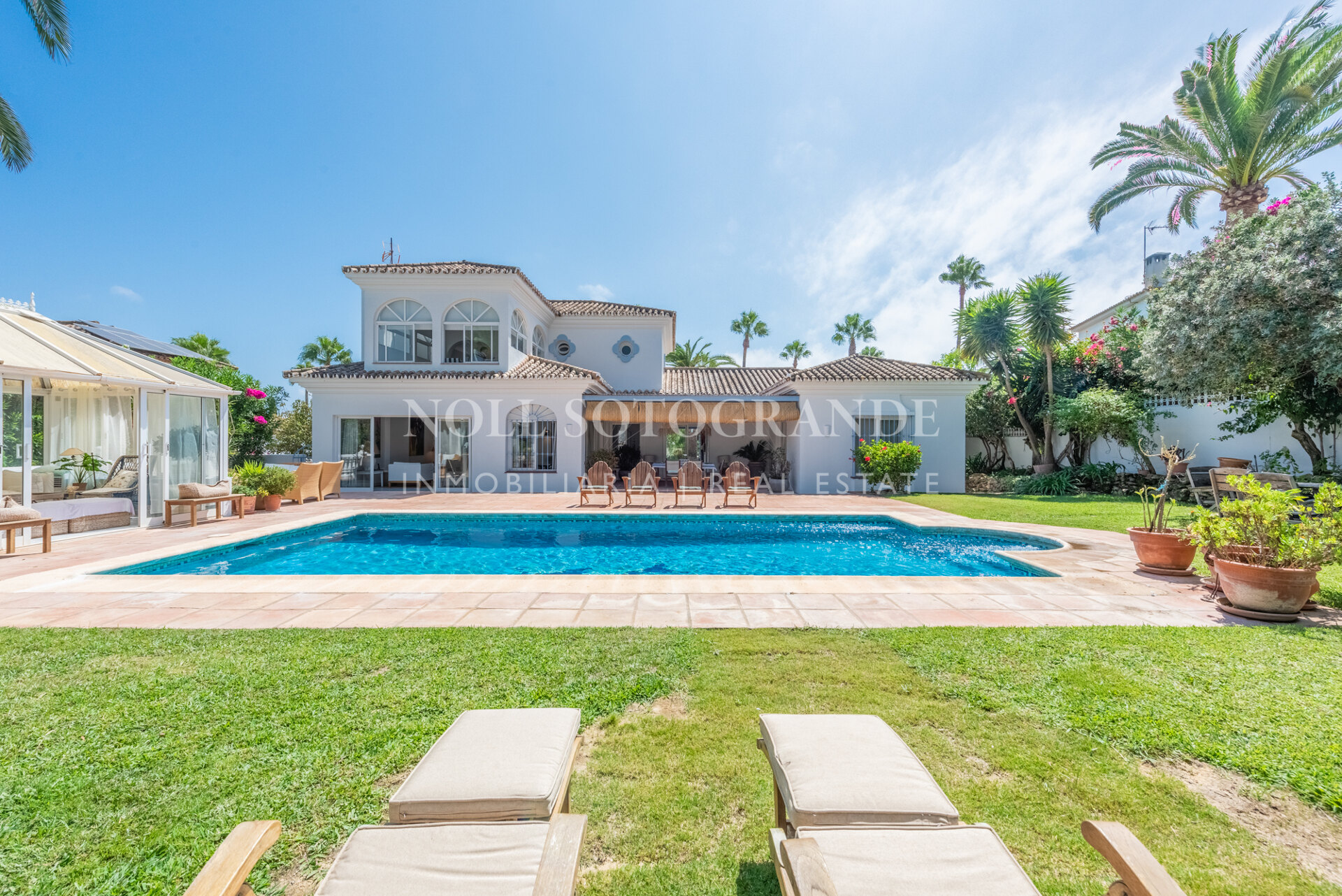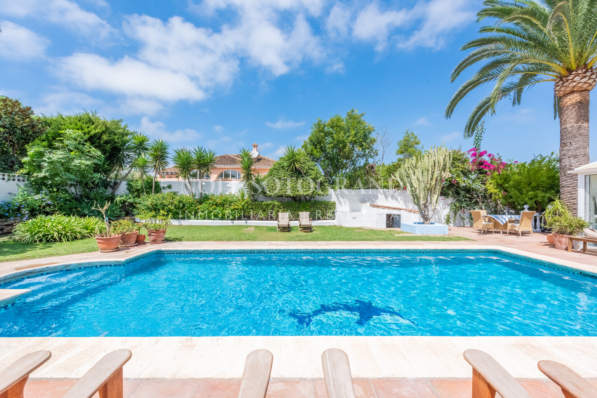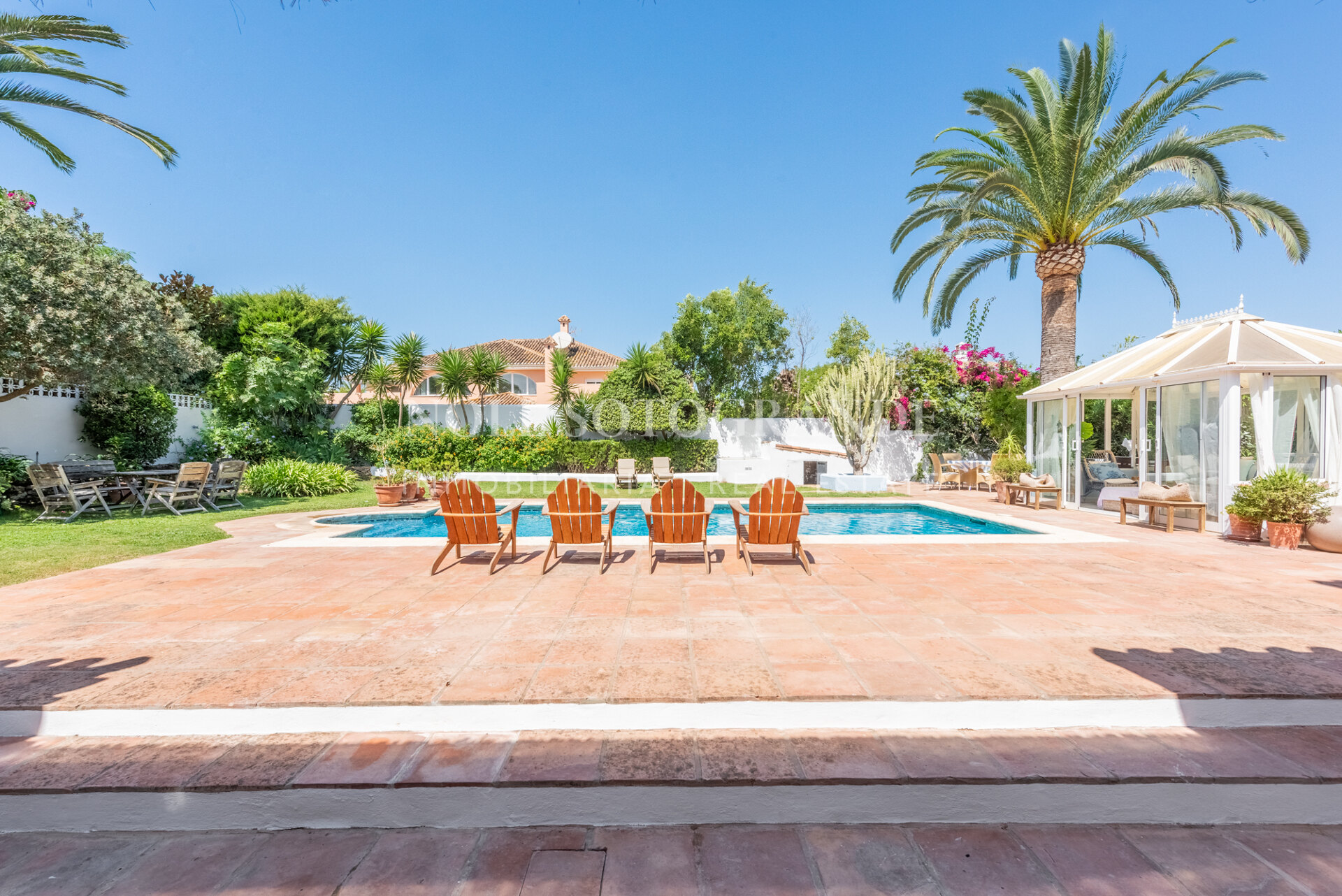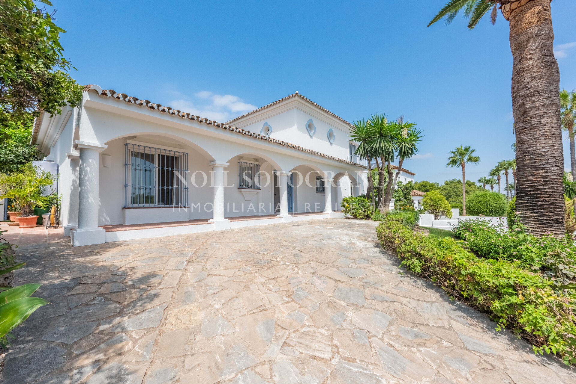 Die Villa besteht aus 6 Schlafzimmern und 4 Bädern, einschließlich des Hauptschlafzimmers im Obergeschoss, das auch über einen hellen Wohnbereich, ein Ankleidezimmer und ein Badezimmer sowie einem Arbeitszimmer verfügt. Im Erdgeschoss befinden sich drei Schlafzimmer, eine separate Küche, ein Wohnzimmer und ein Esszimmer, und über einen separaten Eingang gelangt man zu zwei weiteren unabhängigen Schlafzimmern, die jeweils über ein eigenes Bad verfügen. Darüber hinaus verfügt das Haus über einen zentralen andalusischen Innenhof und einen Schwimmbadbereich, der vom üppigen Garten umgeben ist.