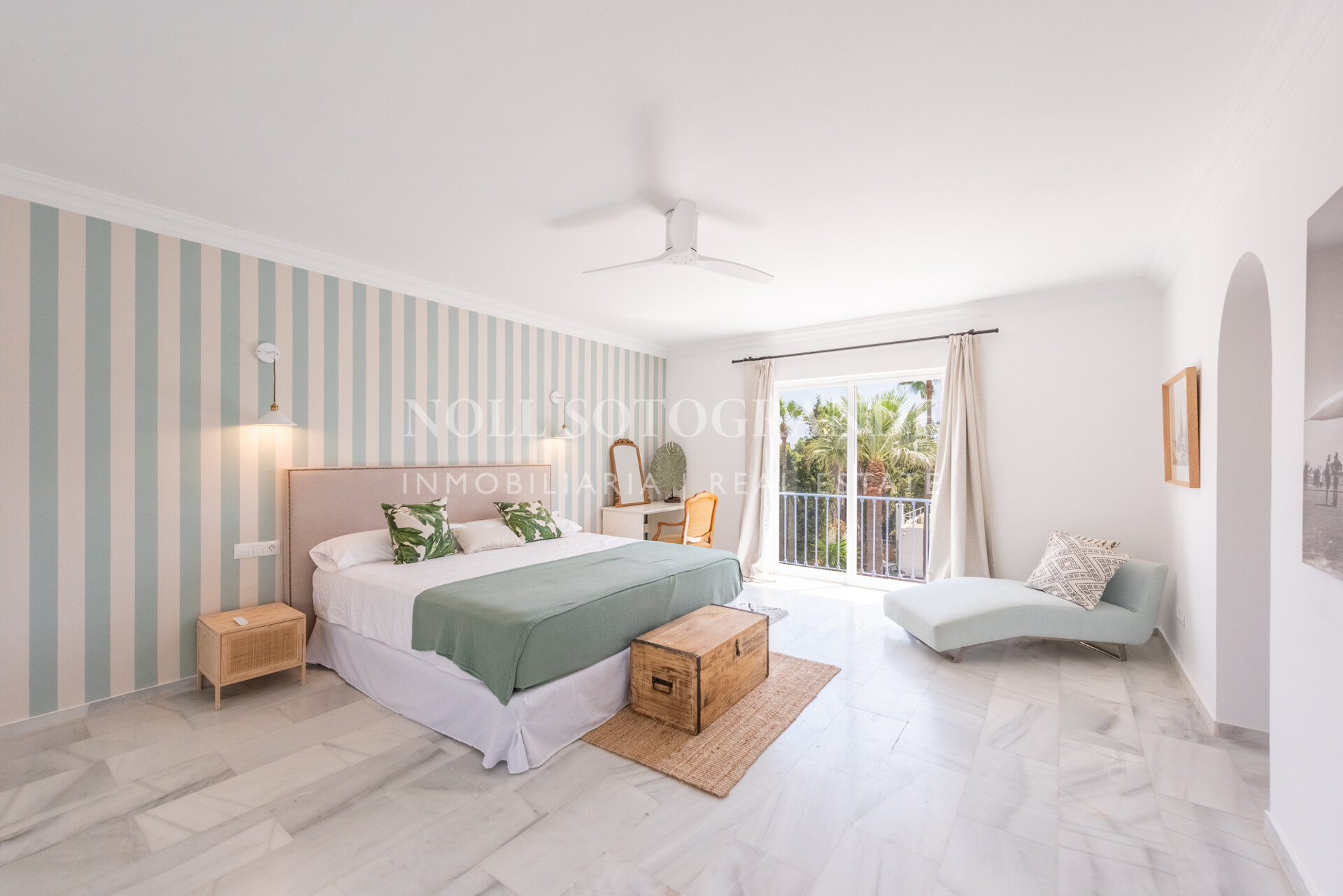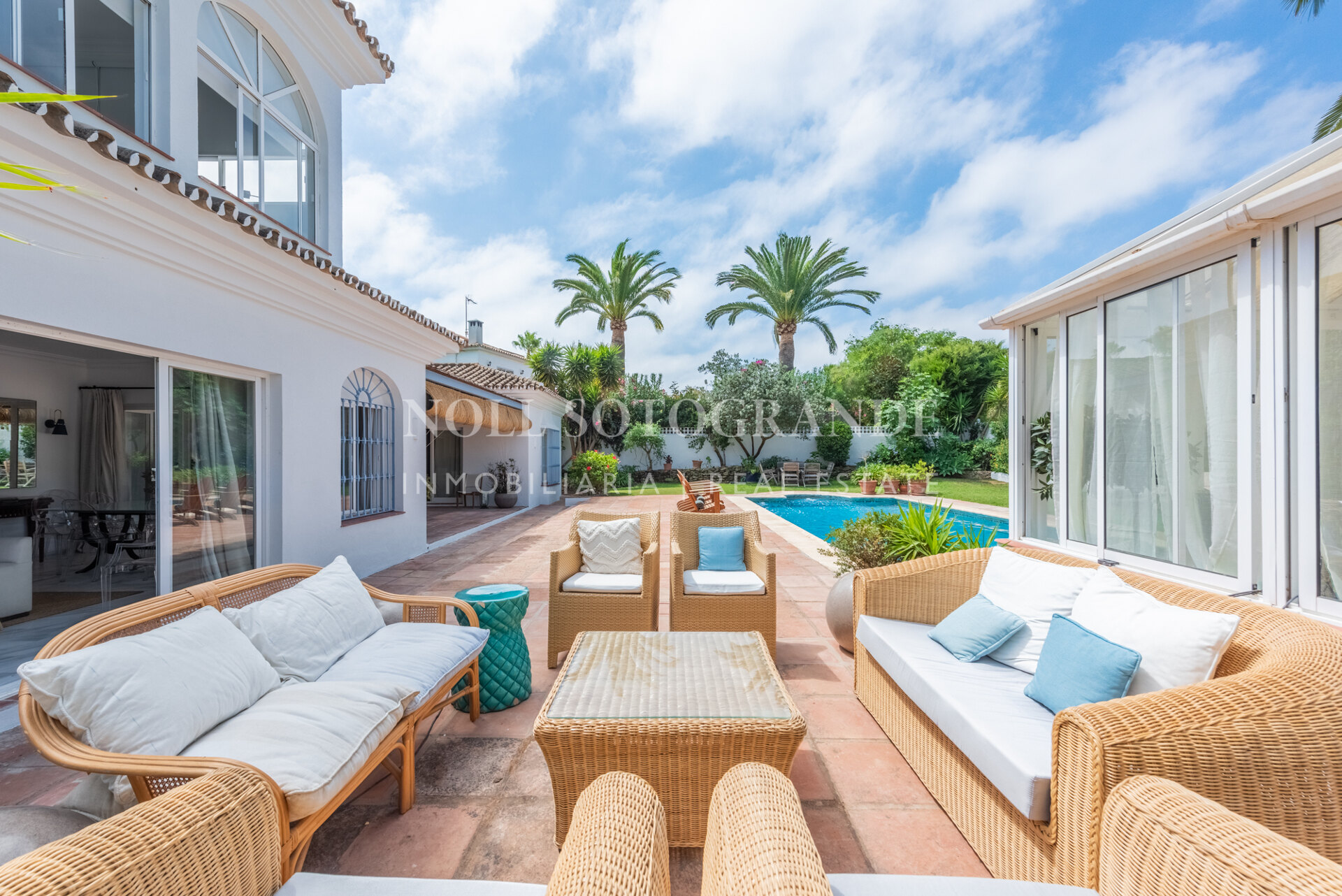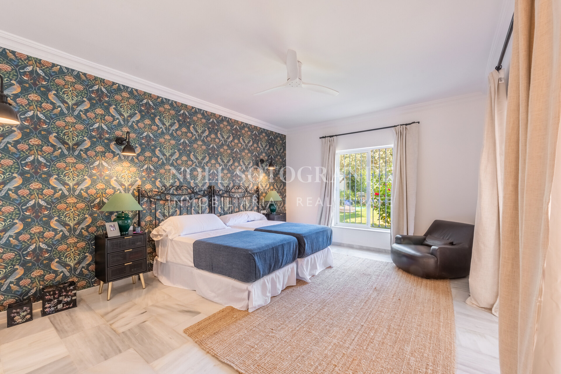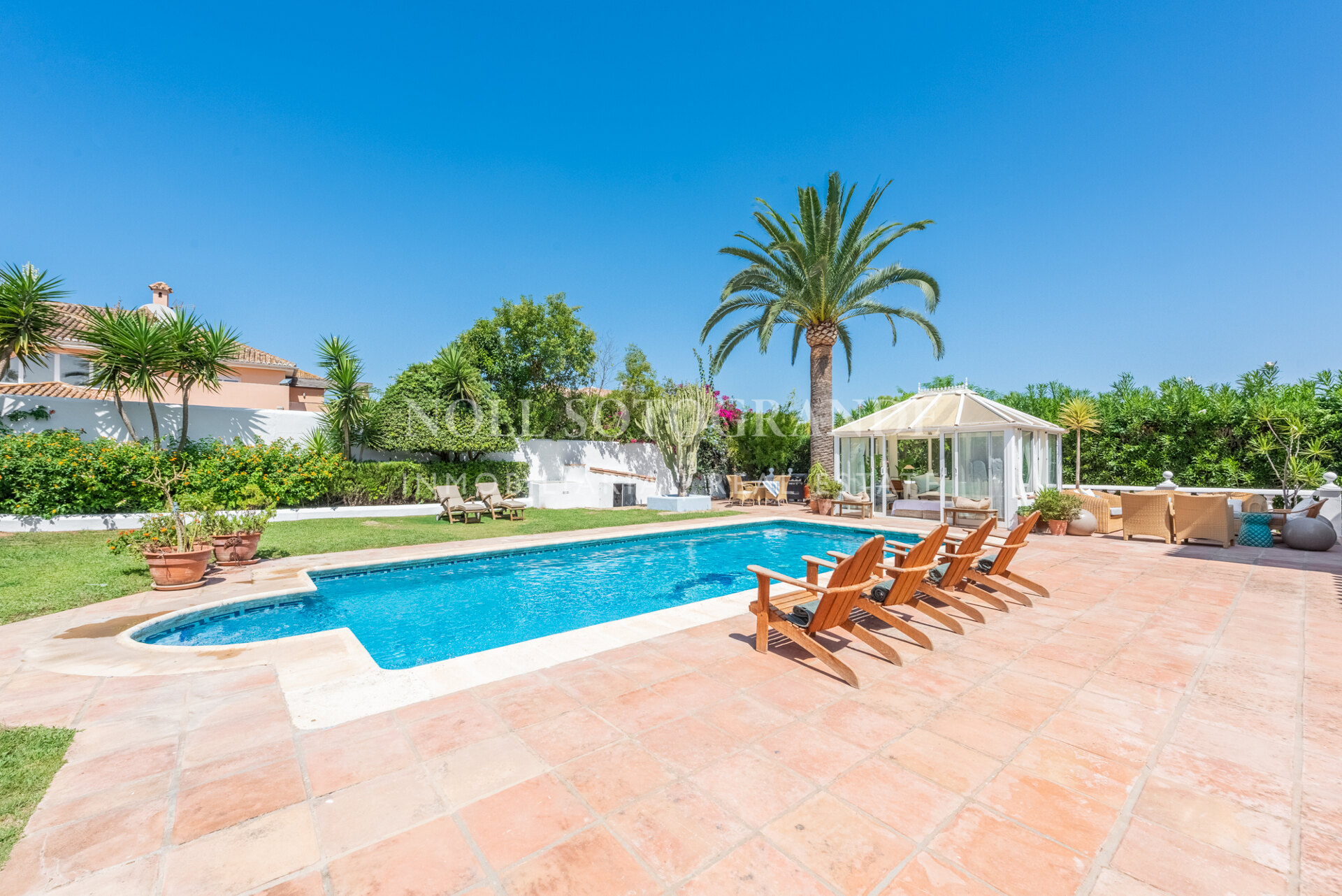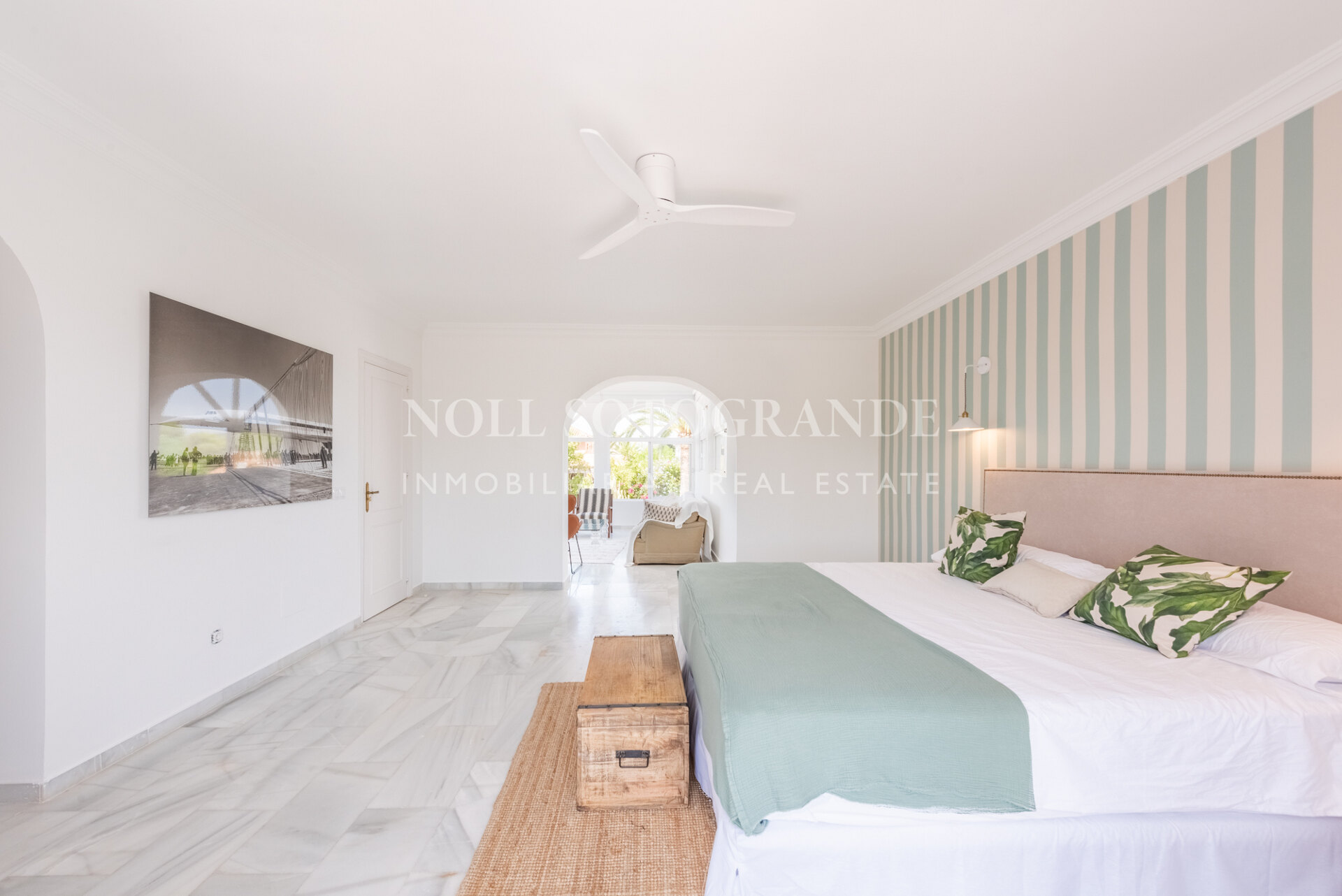 Die Villa besteht aus 6 Schlafzimmern und 4 Bädern, einschließlich des Hauptschlafzimmers im Obergeschoss, das auch über einen hellen Wohnbereich, ein Ankleidezimmer und ein Badezimmer sowie einem Arbeitszimmer verfügt. Im Erdgeschoss befinden sich drei Schlafzimmer, eine separate Küche, ein Wohnzimmer und ein Esszimmer, und über einen separaten Eingang gelangt man zu zwei weiteren unabhängigen Schlafzimmern, die jeweils über ein eigenes Bad verfügen. Darüber hinaus verfügt das Haus über einen zentralen andalusischen Innenhof und einen Schwimmbadbereich, der vom üppigen Garten umgeben ist.