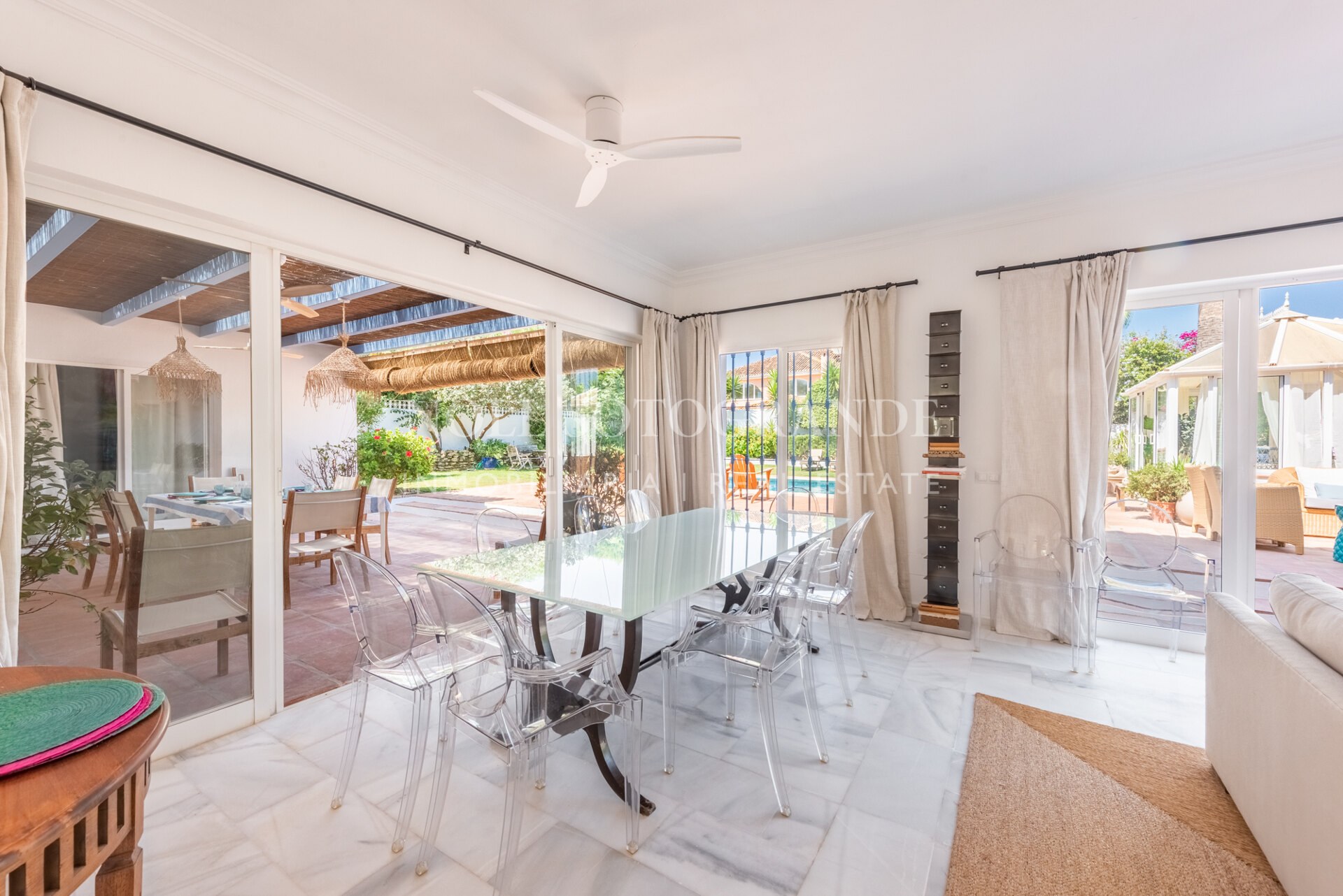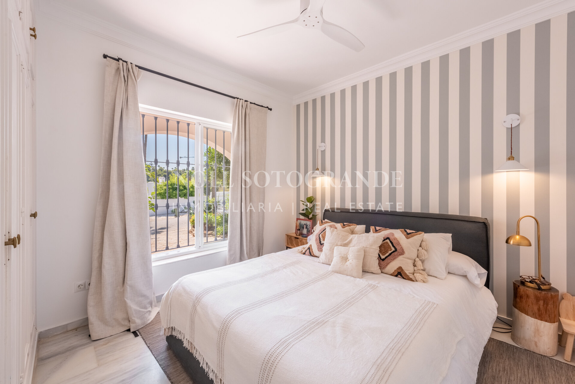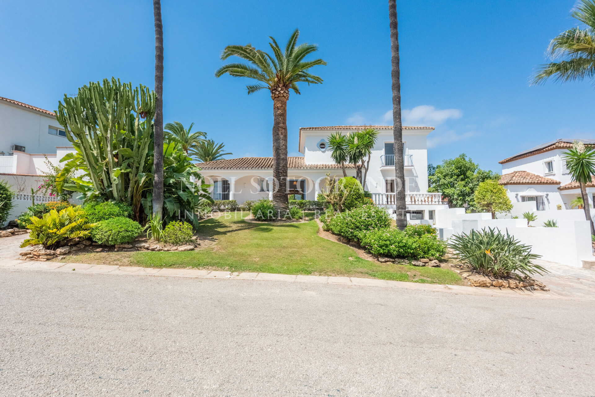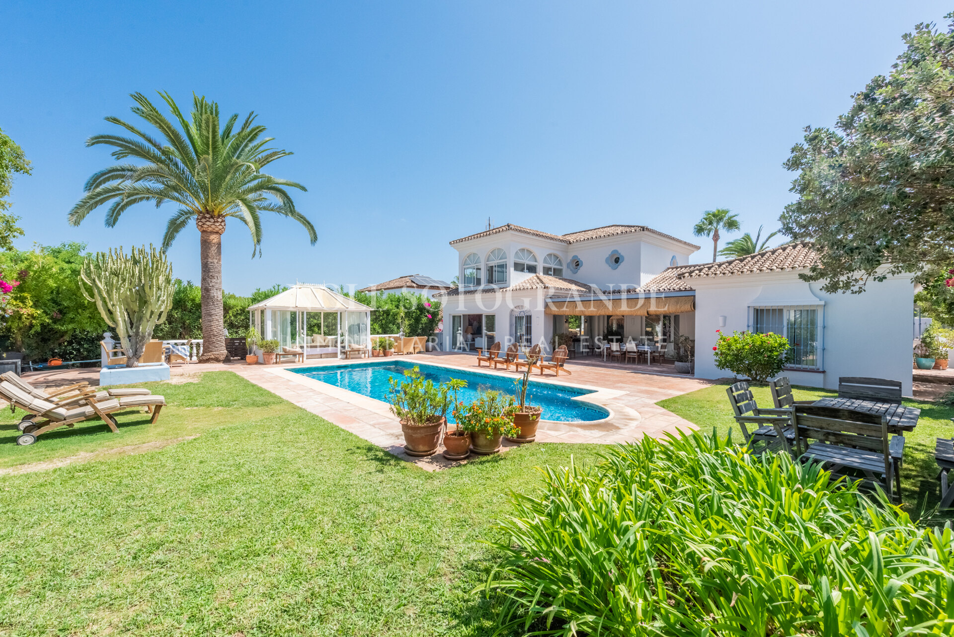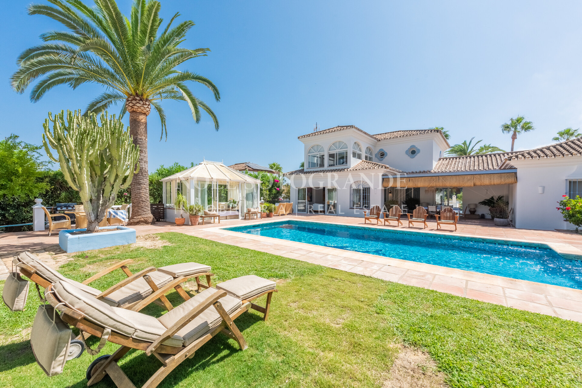 Die Villa besteht aus 6 Schlafzimmern und 4 Bädern, einschließlich des Hauptschlafzimmers im Obergeschoss, das auch über einen hellen Wohnbereich, ein Ankleidezimmer und ein Badezimmer sowie einem Arbeitszimmer verfügt. Im Erdgeschoss befinden sich drei Schlafzimmer, eine separate Küche, ein Wohnzimmer und ein Esszimmer, und über einen separaten Eingang gelangt man zu zwei weiteren unabhängigen Schlafzimmern, die jeweils über ein eigenes Bad verfügen. Darüber hinaus verfügt das Haus über einen zentralen andalusischen Innenhof und einen Schwimmbadbereich, der vom üppigen Garten umgeben ist.