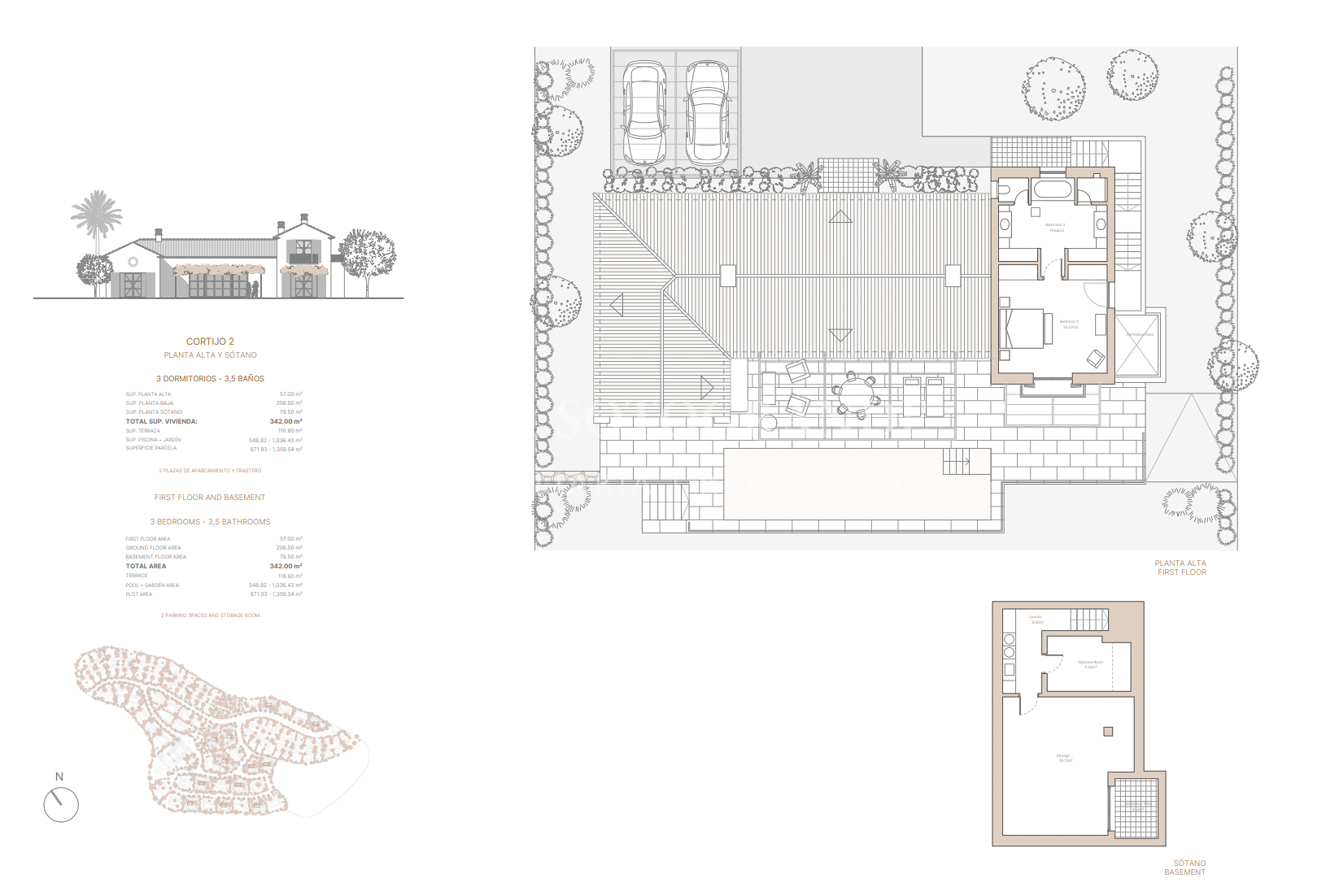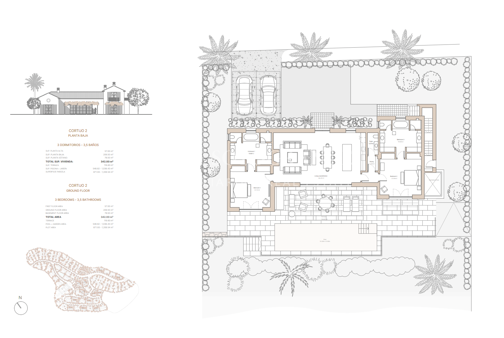 Diese Immobilie ist eine der Cortijos 2, die alle den gleichen Grundriss haben, mit 206 m2 im Erdgeschoss, 57 m2 im Obergeschoss und 78 m2 im Untergeschoss sowie einer Terrasse von 116 m2. Die Villen verfügen über Gärten von 548 m2 bis zu 1.036 m2. Die Anlage bietet exklusive Annehmlichkeiten wie ein Spa, Swimmingpools, ein Fitnessstudio und ein Restaurant vor Ort.