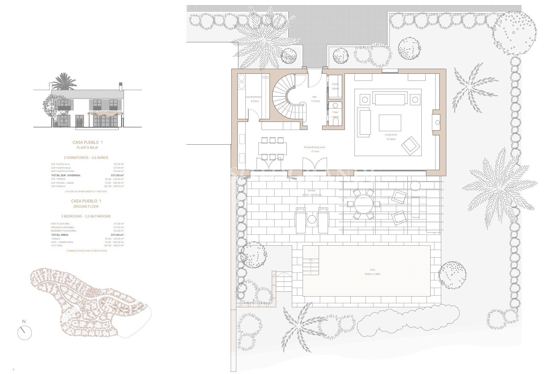 Diese luxuriöse 3-Schlafzimmer-Villa, die zur Casa Pueblo 2 gehört, zeigt eine einzigartige Architektur im mediterranen Stil. Jedes Haus bietet ein geräumiges Interieur von 365 m² bis 398 m², mit einem Erdgeschoss von 125 m², einem ersten Stock von 119 m² und einem Untergeschoss von 120 m² bis 154 m². Der Außenbereich umfasst einen Pool und eine Gartenfläche von 72 m² bis 326 m², ergänzt durch eine Terrasse und eine Pergola von 77 m² bis 128 m².