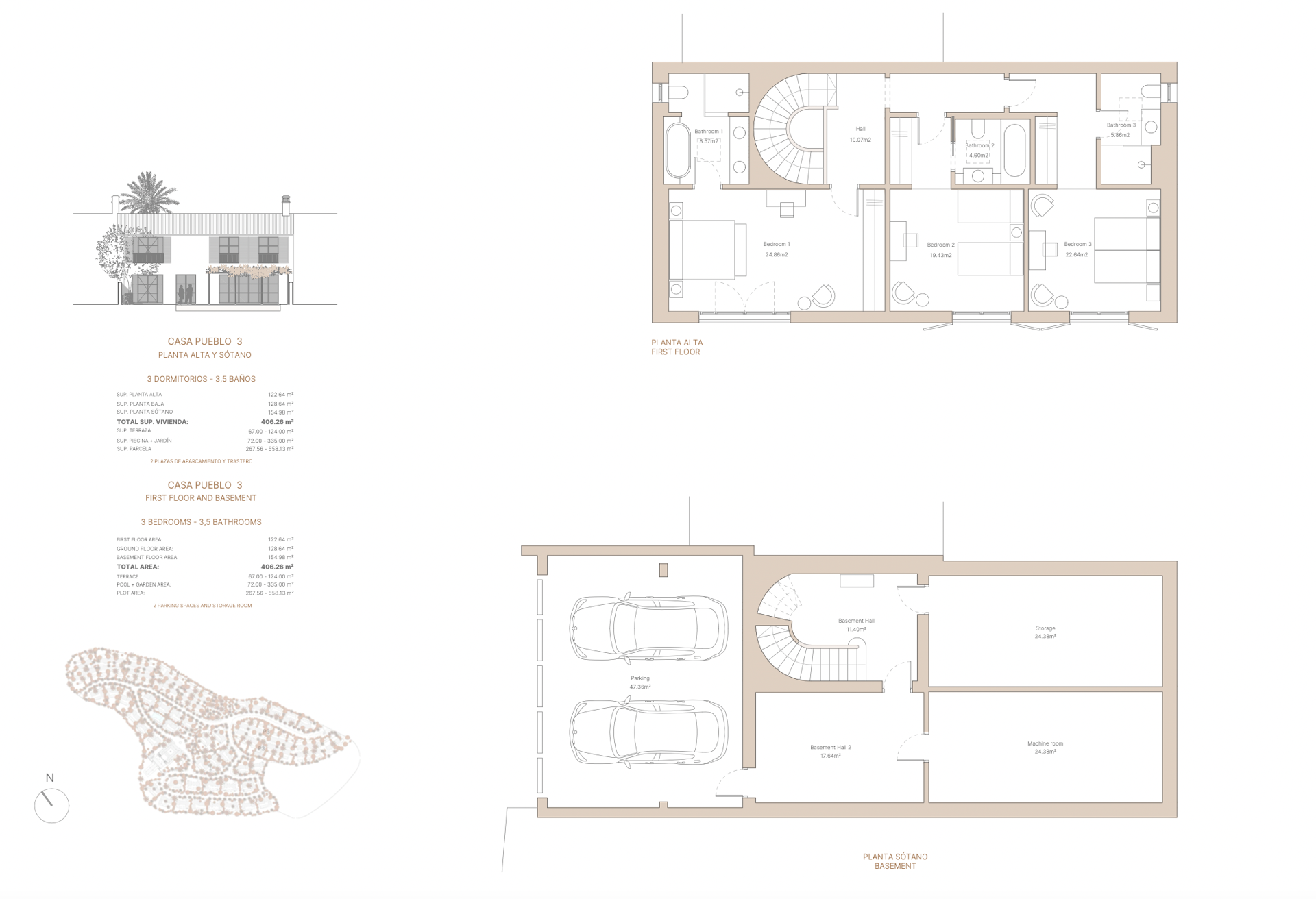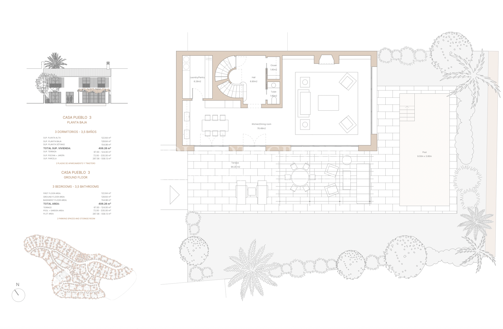 Diese luxuriöse Villa mit 3 Schlafzimmern, die zur Casa Pueblo 3 gehört, zeichnet sich durch eine einzigartige Architektur im mediterranen Stil aus. Jedes Haus bietet eine geräumige Innenfläche von 365 m² bis 398 m², mit einem Erdgeschoss von 125 m², einem ersten Stock von 119 m² und einem Untergeschoss von 120 m² bis 154 m². Der Außenbereich umfasst einen Pool und eine Gartenfläche von 72 m² bis 326 m², ergänzt durch eine Terrasse und eine Pergola von 77 m² bis 128 m².