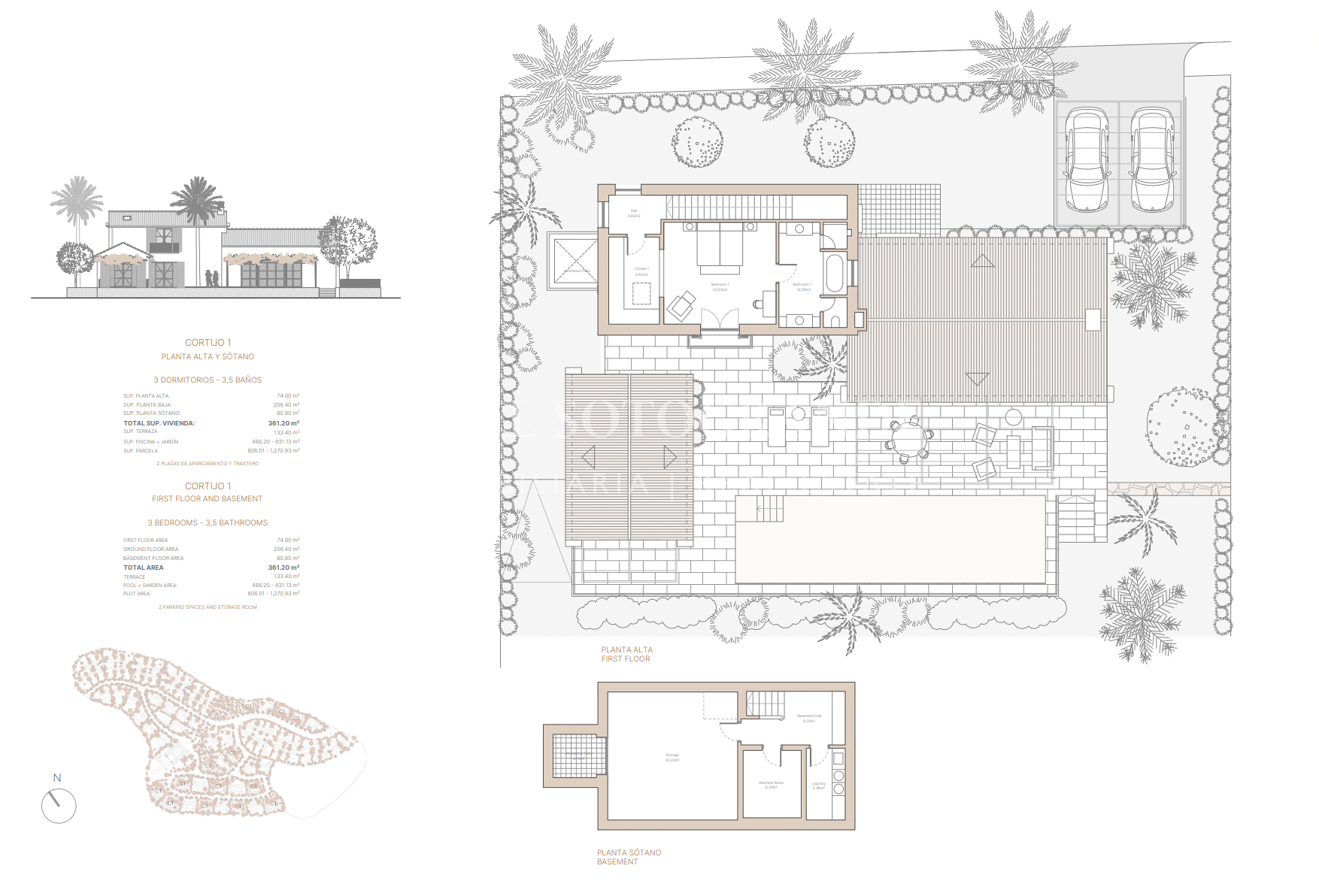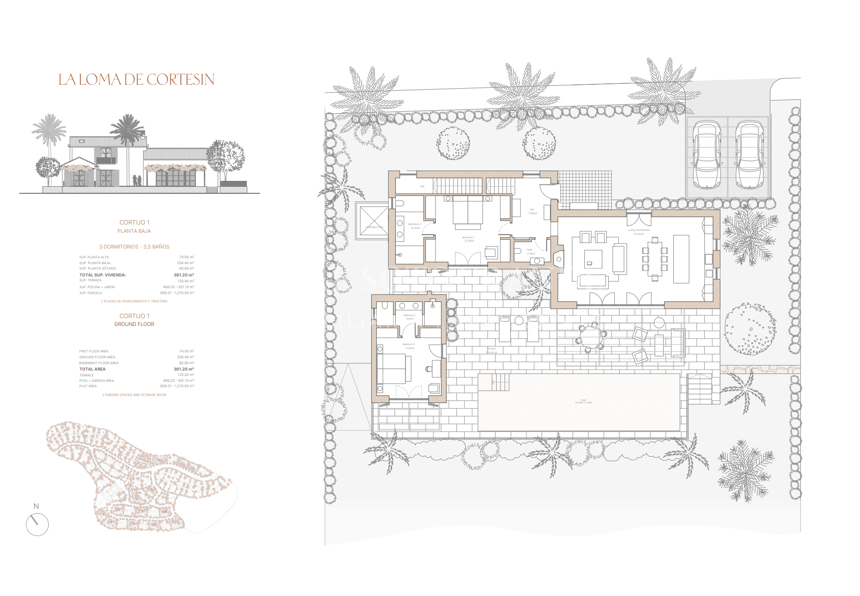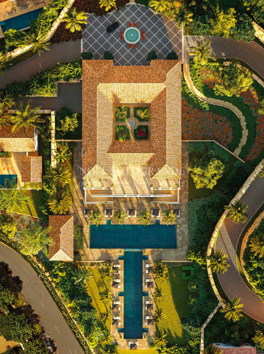 Diese luxuriöse 3-Schlafzimmer-Villa, die zur Casa Pueblo 2 gehört, zeigt eine einzigartige Architektur im mediterranen Stil. Jedes Haus bietet ein geräumiges Interieur von 365 m² bis 398 m², mit einem Erdgeschoss von 125 m², einem ersten Stock von 119 m² und einem Untergeschoss von 120 m² bis 154 m². Der Außenbereich umfasst einen Pool und eine Gartenfläche von 72 m² bis 326 m², ergänzt durch eine Terrasse und eine Pergola von 77 m² bis 128 m².