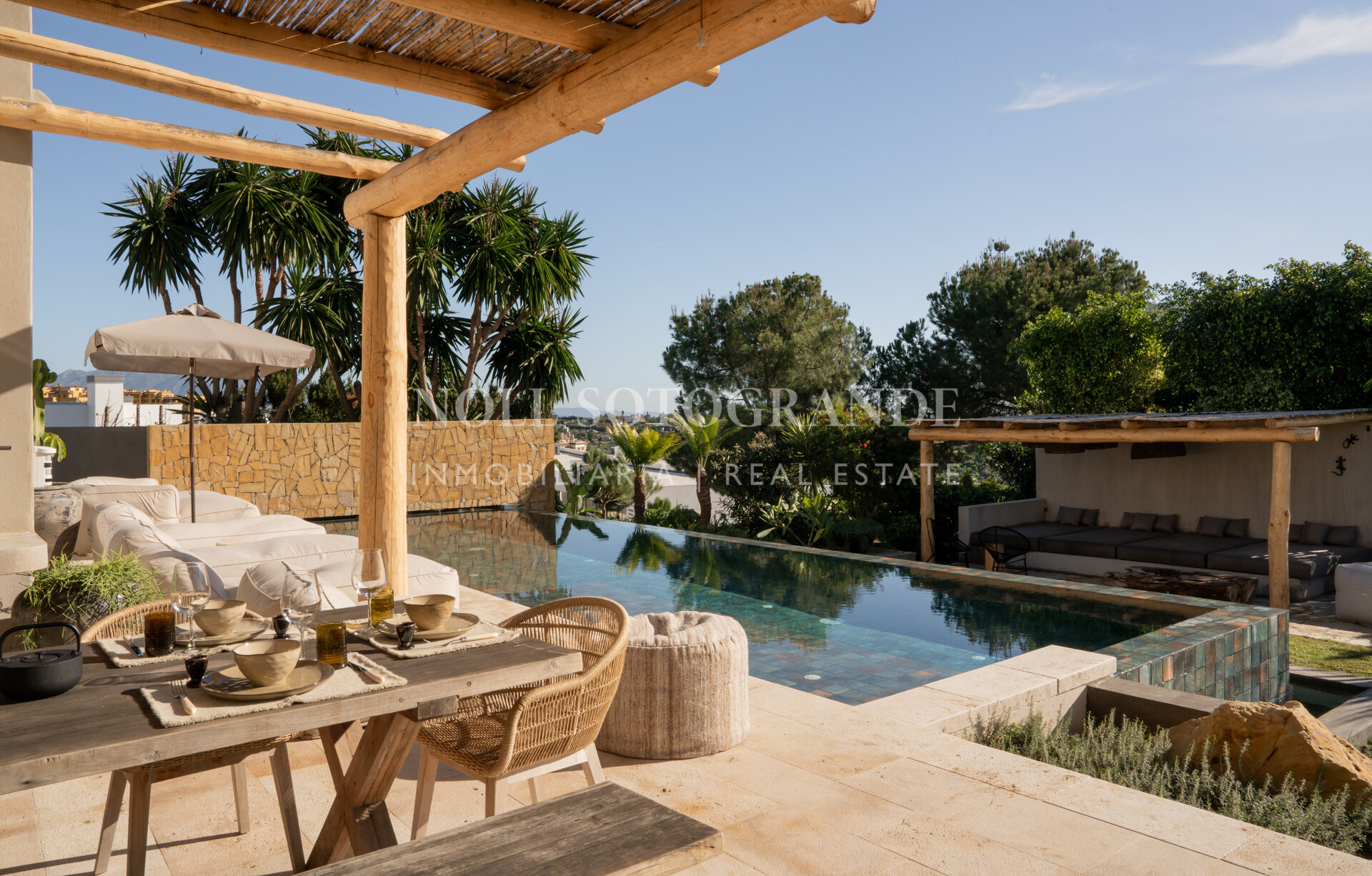 Esta propiedad, Ausrichtung Süd, verfügt über die folgenden Einrichtungen: outdoorkitchen, küche ausgestattet, annehmlichkeiten nahebei, klimaanlage, fussbodenheizung (badezimmer), komplett eingerichtet, meerblick, küche komplett ausgestattet, offener kamin, beheiztes svhwimmbad, meer/strandnähe, closetorestaurants, offene terrasse, sonnenkollektoren, offene küche, Überdachte terrasse, hervorragender zustand, grill, kürzlich renoviert, gästetoilette und panoramablick.