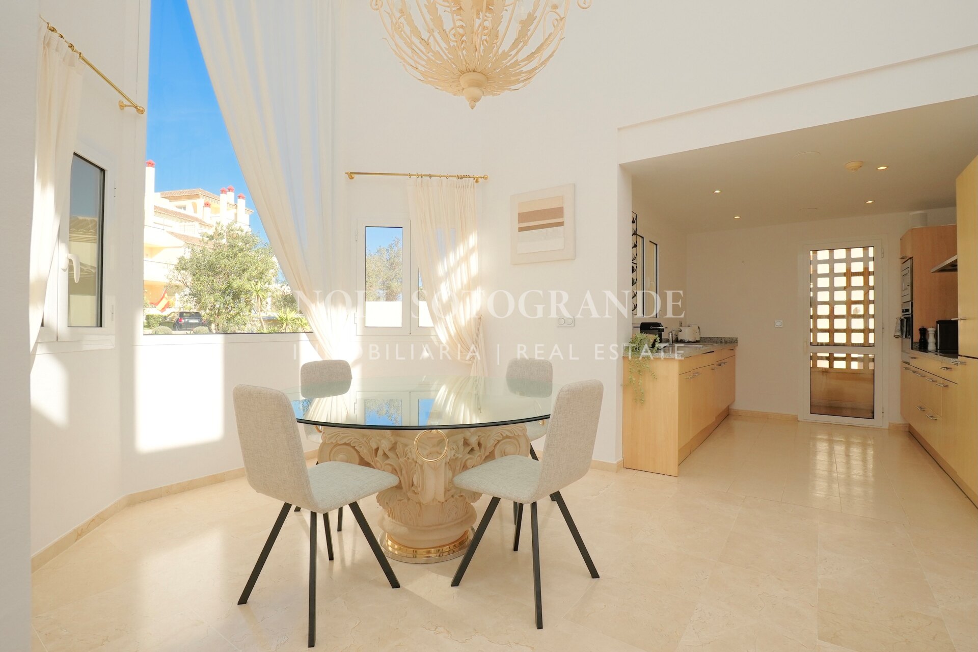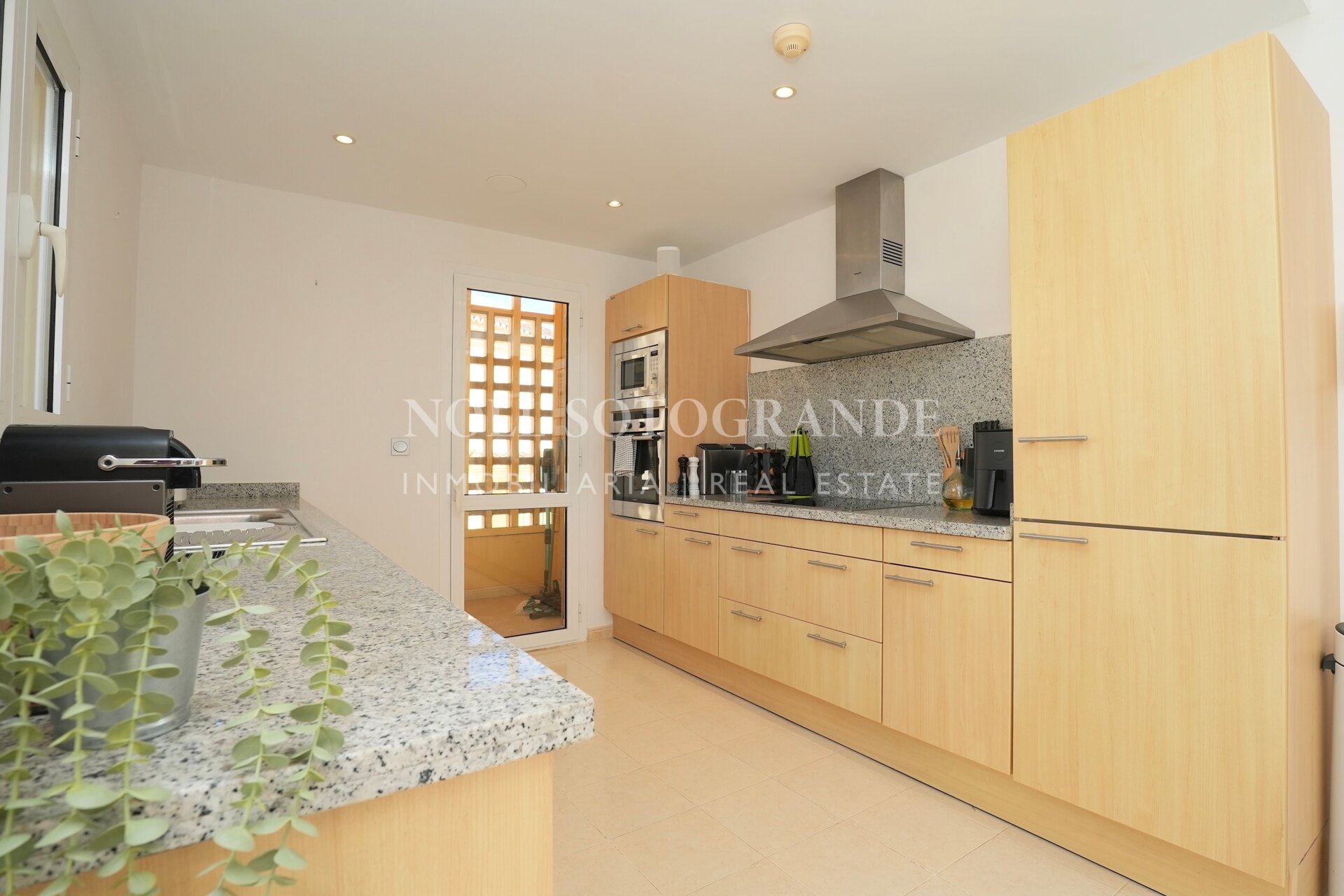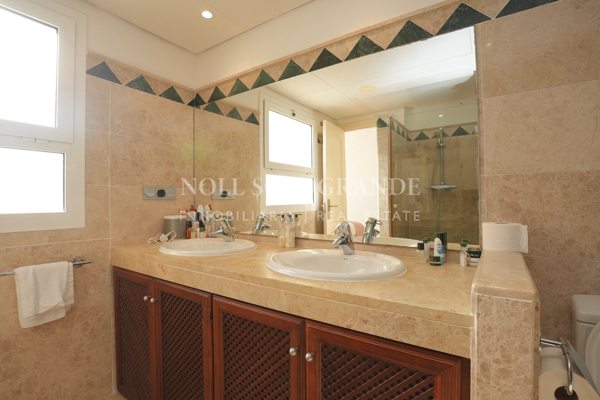 Die Immobilie verfügt über einen geräumigen Wohn-Essbereich, der mit einer offenen, voll ausgestatteten Küche verbunden ist. Alle drei Schlafzimmer sind großzügig geschnitten und verfügen jedes mit eigenem Bad (alle mit Dusche und Badewanne), das Komfort und Privatsphäre bietet. Das herausragende Solarium umfasst einen eingebauten Grillbereich, ideal für geselliges Beisammensein. Weitere Highlights sind ein Aufzug, ausreichend Stauraum, eine Garage mit Platz für zwei Autos und einen Golfbuggy. Darüber hinaus umfasst die Immobilie die vordere Zugangsterrasse und den Gartenbereich mit insgesamt über 225 m² Außenfläche, zusätzlich zur Hauptterrasse mit 74,62 m² und dem Solariumbereich mit 105,27 m².