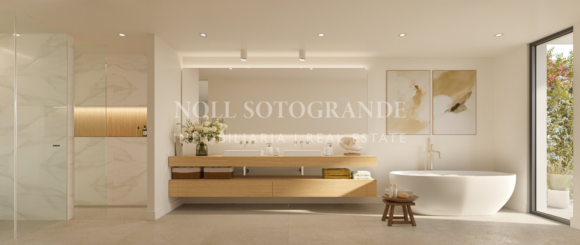 In dem prestigeträchtigen Sotogrande Alto gelegen, in der Nähe der Sotogrande International School und erstklassiger Golfplätze wie Valderrama, bietet diese Entwicklung diskreten Luxus und Komfort. Die geschlossene Wohnanlage umfasst 14 Reihenhäuser, jedes mit 4 oder 5 Schlafzimmern, zwei Etagen, einer Dachterrasse, einem privaten Pool und Garten. Diese Häuser verbinden moderne Eleganz mit Nachhaltigkeit und erzielen höchste Energieeffizienzklassen. Anpassungsoptionen umfassen einen Garten-Chill-out-Bereich mit Außenküche und bioklimatischer Pergola. Der Whirlpool auf dem Dach ist perfekt, um die schönen Sonnenuntergänge von Sotogrande zu genießen. Die Bewohner profitieren von 24-Stunden-Überwachung und Concierge-Service, die Sicherheit und Komfort gewährleisten. Erleben Sie den Charme und das Klima des südlichen Mittelmeers in dieser exklusiven Gemeinschaft.