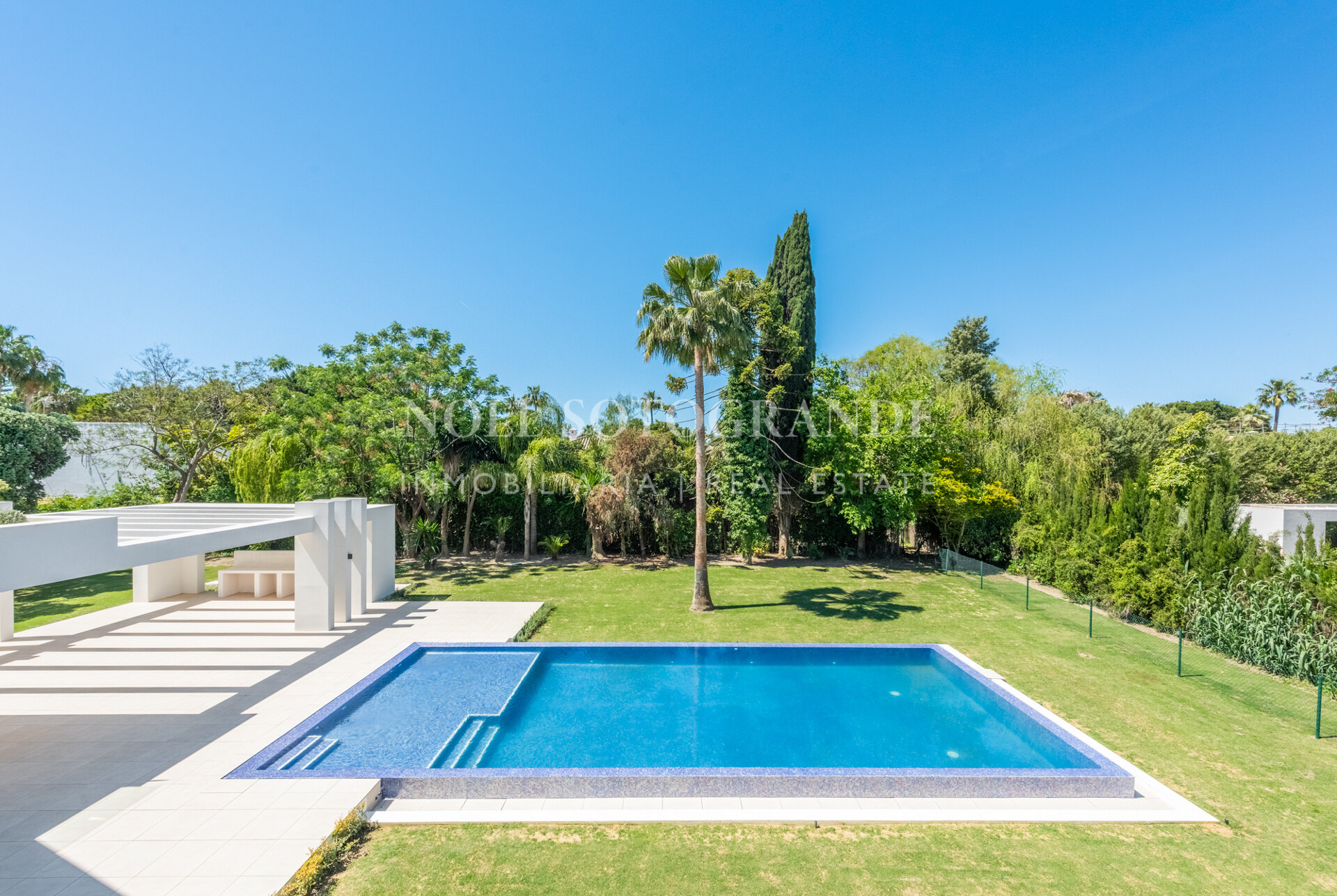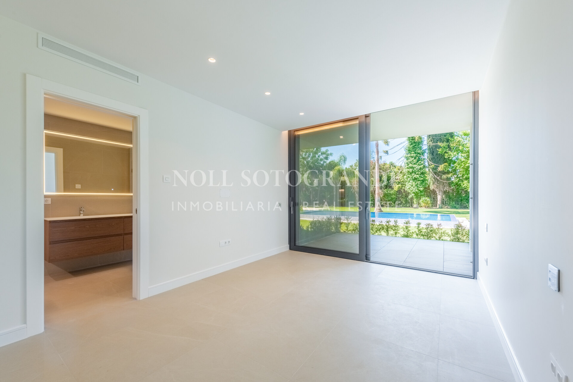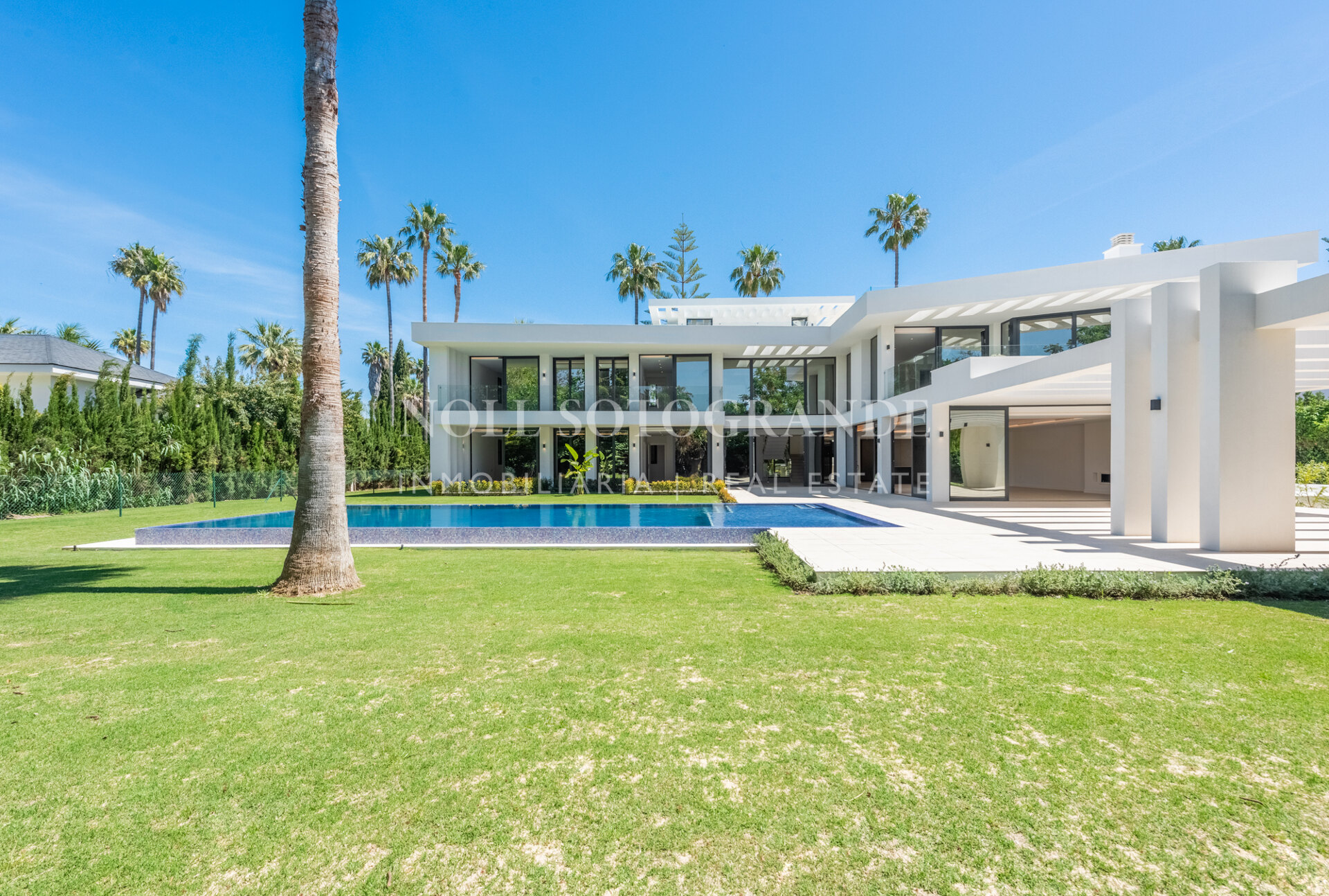Entdecken Sie modernen Luxus in dieser zeitgenössischen Villa in der prestigeträchtigen Kings & Queens Gegend von Sotogrande Costa. Diese im Jahr 2024 fertiggestellte Villa bietet großzügige Räume, ein elegantes Design und eine atemberaubende Aussicht. Mit einer bebauten Fläche von 1.077 m² auf einem 2.032 m² großen Grundstück verfügt die Villa über hochwertige Oberflächen und moderne Annehmlichkeiten. Im Inneren der Villa befinden sich fünf geräumige Schlafzimmersuiten, jede mit eigenem Bad. Zu den Wohnbereichen gehören ein Medienraum, und eine maßgeschneiderte Modulnova-Küche mit Gaggenau-Geräten. Zu den energieeffizienten Systemen des Hauses gehören eine von Hisense VRF betriebene Klimaanlage, eine Fußbodenheizung und eine hohe Energieeffizienzklasse A+++. Im Außenbereich bietet die Villa einen 14×6 m großen Infinity-Pool mit LED-Beleuchtung, der sowohl tagsüber zur Entspannung als auch abends zur Unterhaltung einlädt. Der wunderschön angelegte Garten, die großzügigen Terrassen und zusätzliche Ausstattungsmerkmale wie ein Schindler-Aufzug, eine Solaranlage und ein anpassbarer Keller machen diese Immobilie zu einem einzigartigen Fund in Sotogrande.
