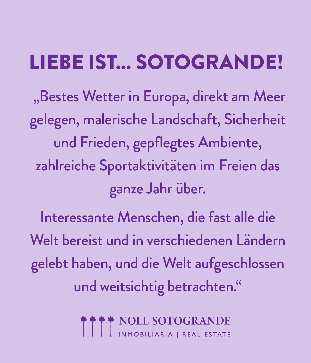 ? Ich liebe Sotogrande wegen Noll & Partners! (Noll: Danke schön! ?) Ich liebe Sotogrande, weil es alles bietet, was man sich von schönen Bars, Restaurants, maritimen Aktivitäten, Polo und einigen der besten Golfplätze der Welt wünschen kann, aber nie der Versuchung erlegen ist, sich in ein Nachtviertel im Banús-Stil zu verwandeln. Vor allem liebe ich Sotogrande, weil es familienorientiert ist. Wo sonst an der Küste könnten Sie Teenagern erlauben, abends mit ihren Freunden auszugehen, ohne Angst vor dem zu haben, was sie wohl vorhaben? G.W.
