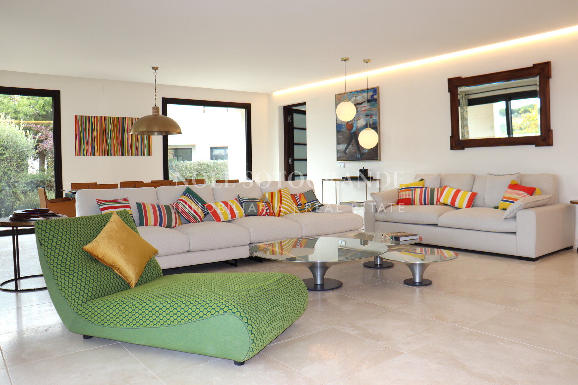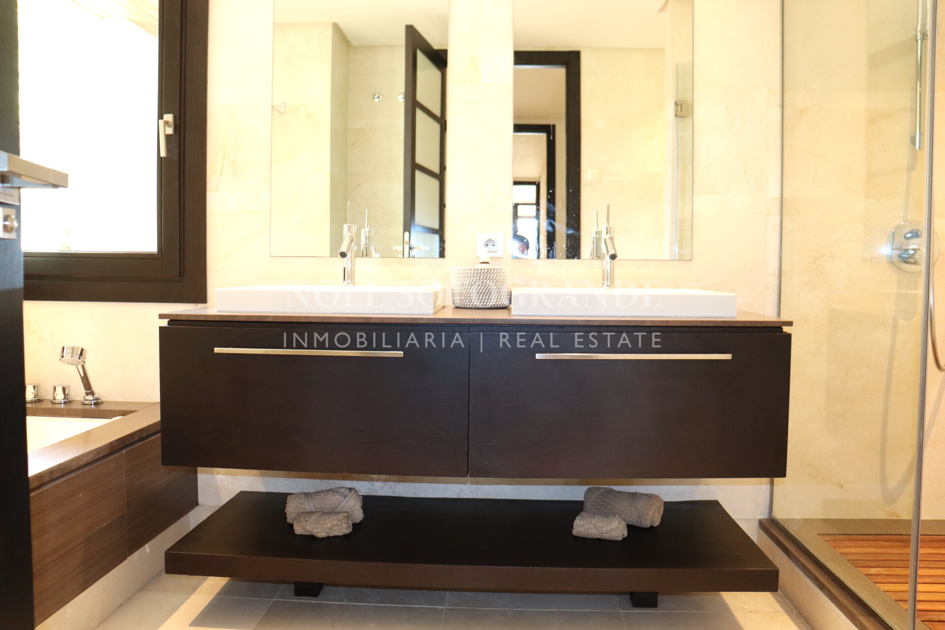 Wenn man die Wohnung durch die Eingangshalle betritt, gelangt man in das geräumige Wohn-Esszimmer mit Zugang zur Terrasse und zum Garten, sowie in die Küche. Es gibt drei Schlafzimmer, alle mit eigenem Bad und ein Gäste-WC. Die Immobilie verfügt über einen eigenen Aufzug, mit dem man in den großen Keller hinunterfahren kann, wo sich zwei Räume befinden, die für Ihre Bedürfnisse geeignet sind, sowie eine große Garage, in der problemlos 4 Autos Platz finden.