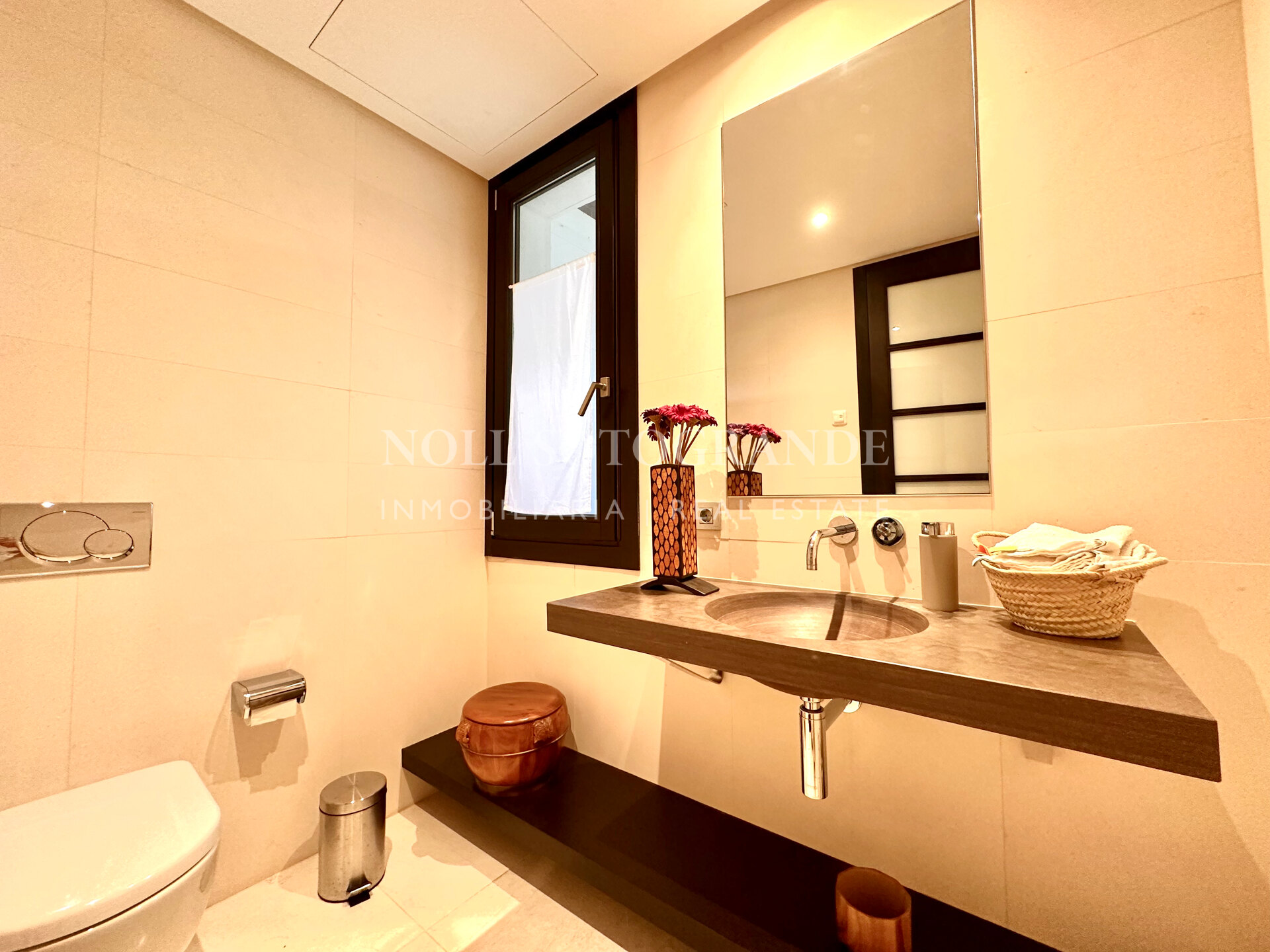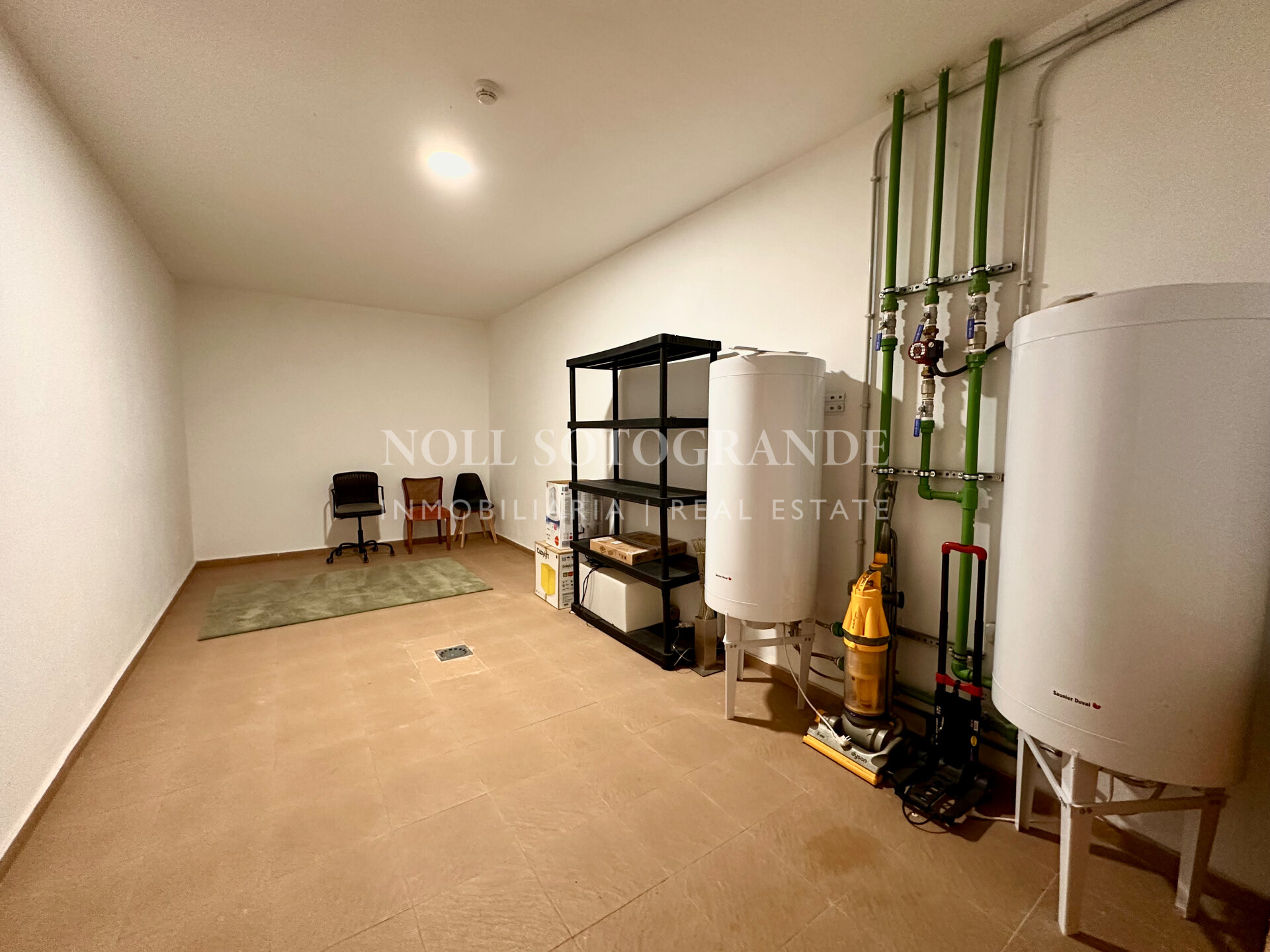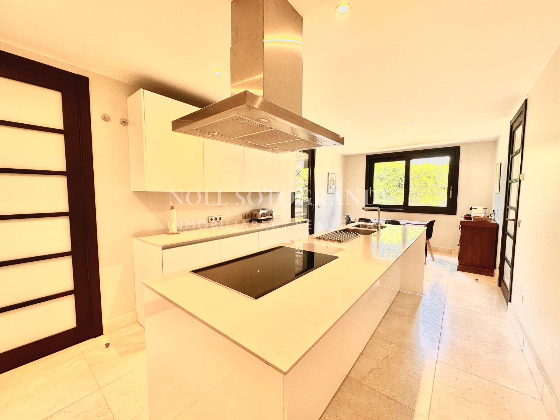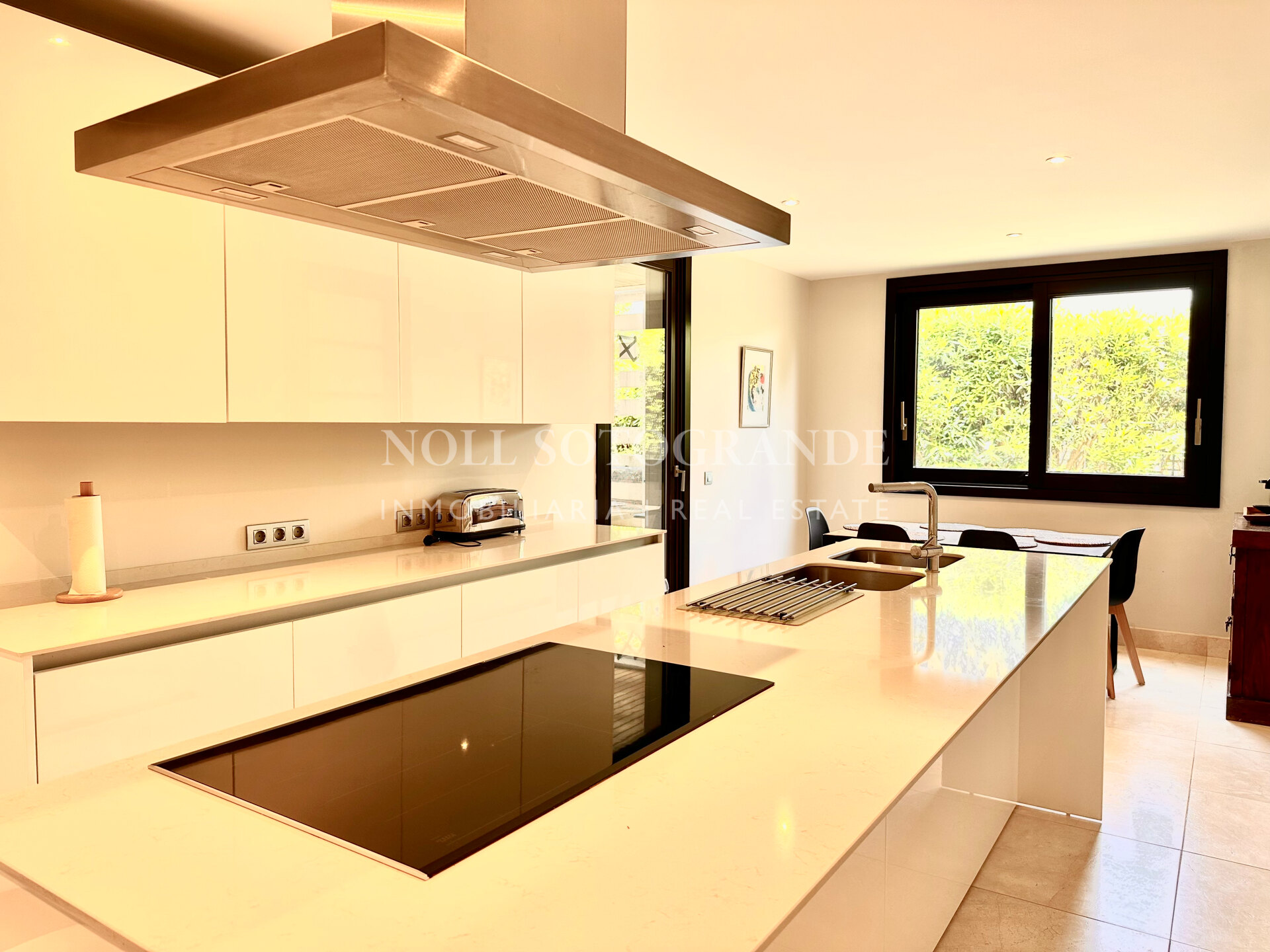Wenn man die Wohnung durch die Eingangshalle betritt, gelangt man in das geräumige Wohn-Esszimmer mit Zugang zur Terrasse und zum Garten, sowie in die Küche. Es gibt drei Schlafzimmer, alle mit eigenem Bad und ein Gäste-WC. Die Immobilie verfügt über einen eigenen Aufzug, mit dem man in den großen Keller hinunterfahren kann, wo sich zwei Räume befinden, die für Ihre Bedürfnisse geeignet sind, sowie eine große Garage, in der problemlos 4 Autos Platz finden.