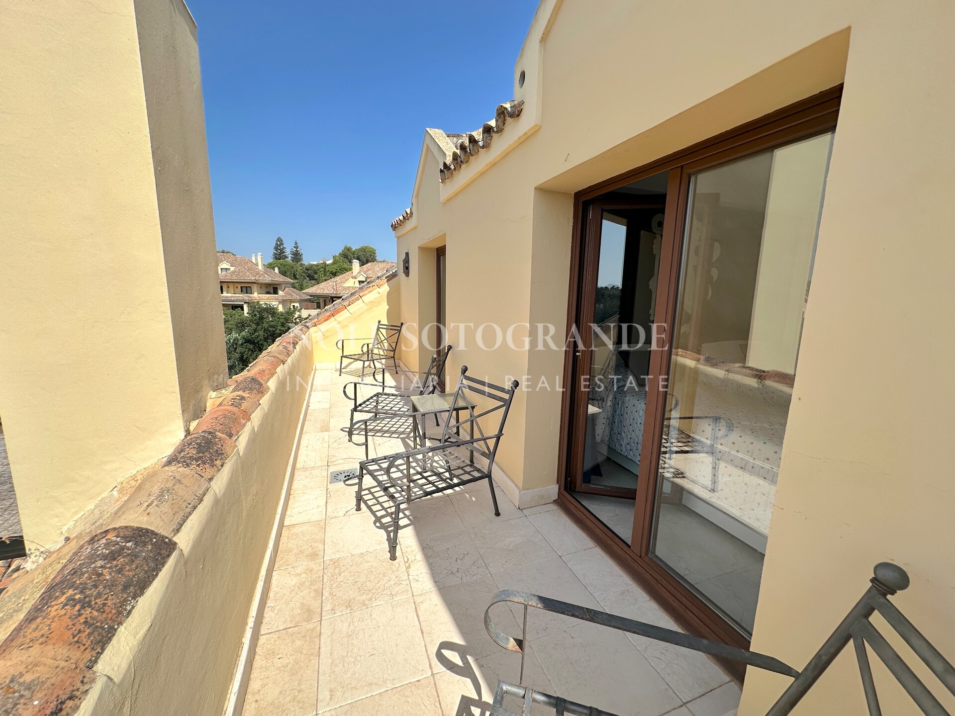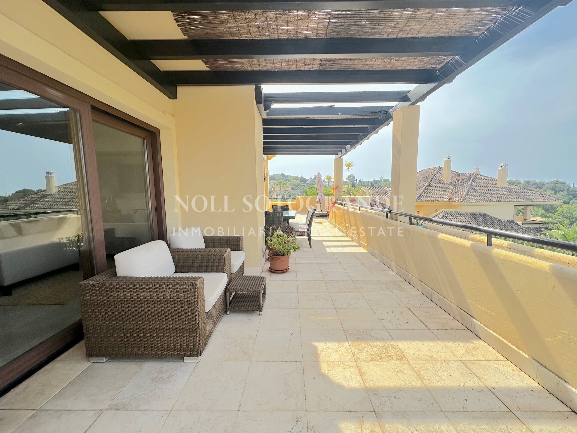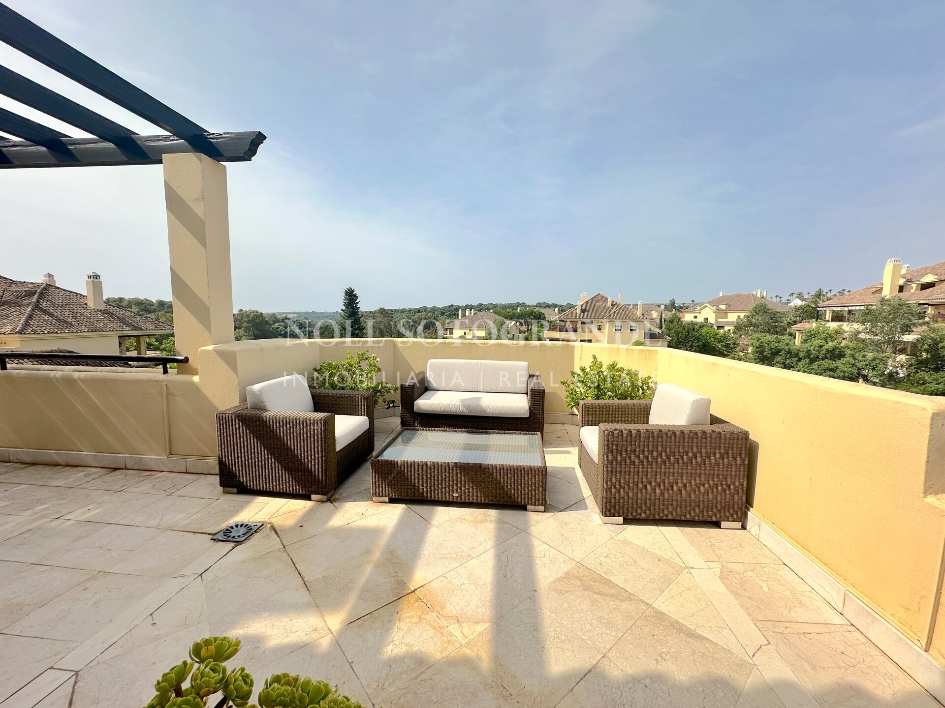 Dieses großzügige Duplex-Penthouse mit vier Schlafzimmern und vier Badezimmern im Valgrande-Komplex bietet eine außergewöhnliche Gelegenheit zur Langzeitmiete in Sotogrande Alto. Es erstreckt sich über das gesamte zweite und dritte Stockwerk und verfügt über eine großzügige Terrasse von ca. 190 m², die einen ruhigen Blick auf die Gärten und den Golfplatz bietet. Gegenüber dem renommierten Real Club de Golf Valderrama gelegen und in einer geschlossenen Wohnanlage mit 24-Stunden-Sicherheitsdienst, vereint diese Immobilie Exklusivität und Komfort auf perfekte Weise. Das Penthouse bietet 530 m² Wohnfläche, ist per Aufzug erreichbar und mit Marmorböden, Panoramafenstern und modernen Details ausgestattet. Geräumige Schlafzimmer mit eigenem Bad und klar abgegrenzte Wohnbereiche sorgen für Privatsphäre und Vielseitigkeit – ideal für Familien und Berufstätige. Für ein angenehmes Raumklima sorgen Klimaanlage und Fußbodenheizung das ganze Jahr über. Die Annehmlichkeiten der Wohnanlage unterstreichen das luxuriöse Wohngefühl: Den Bewohnern stehen Gemeinschaftspools, gepflegte Gärten, Spa, Fitnessraum und eine Golf-Übungsanlage zur Verfügung. Ein Tiefgaragenstellplatz sowie ein Abstellraum sind für Komfort und Sicherheit inbegriffen. Dieses Duplex-Penthouse eignet sich ideal für alle, die einen exklusiven, ruhigen Lebensstil in der Nähe der besten Freizeitangebote von Sotogrande suchen.