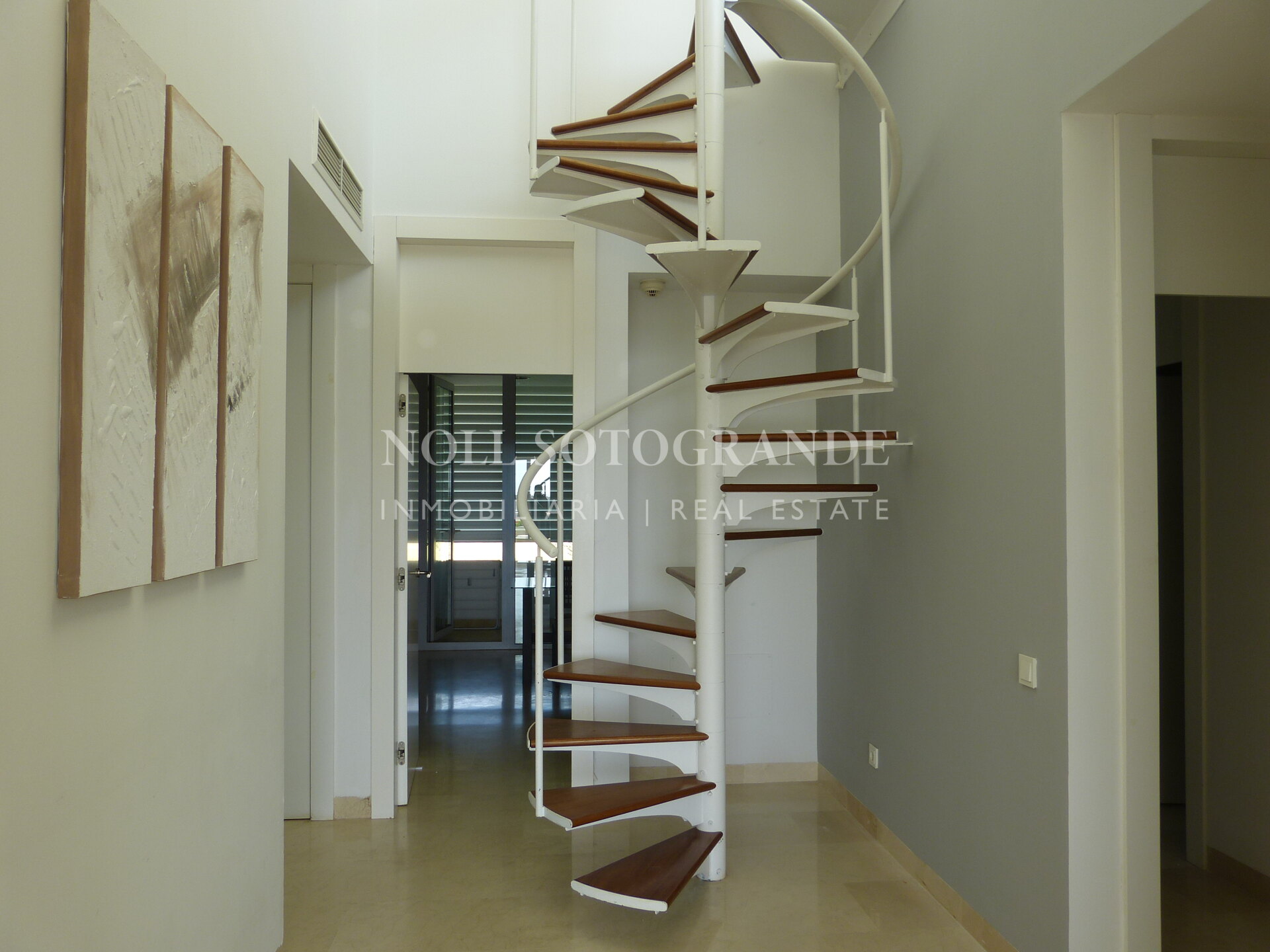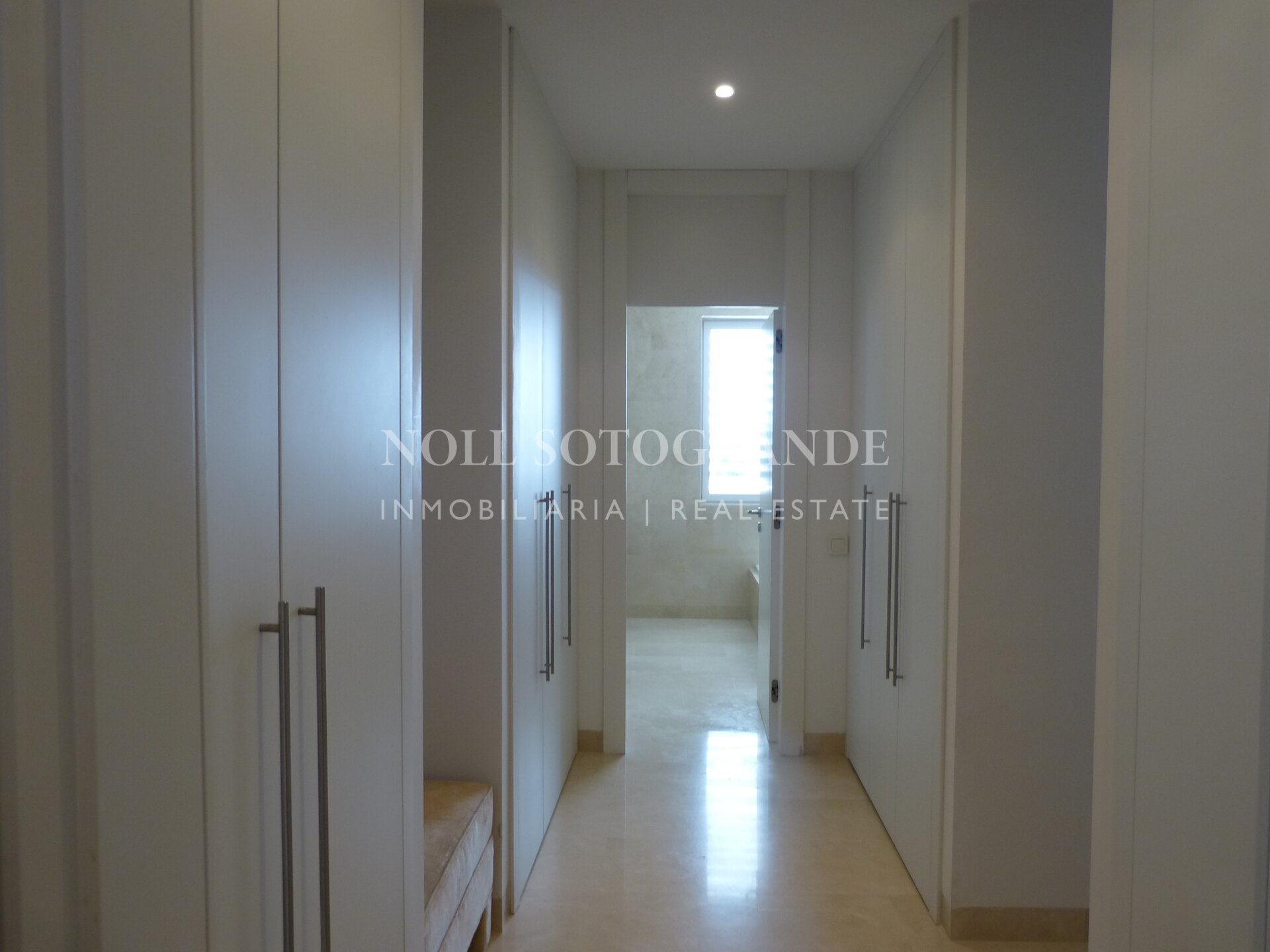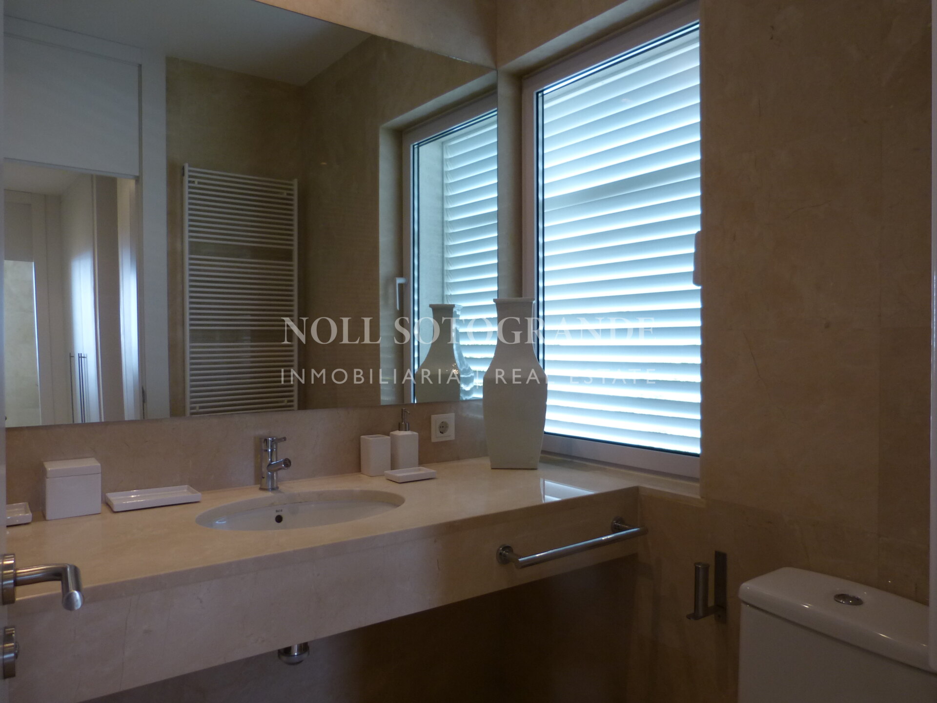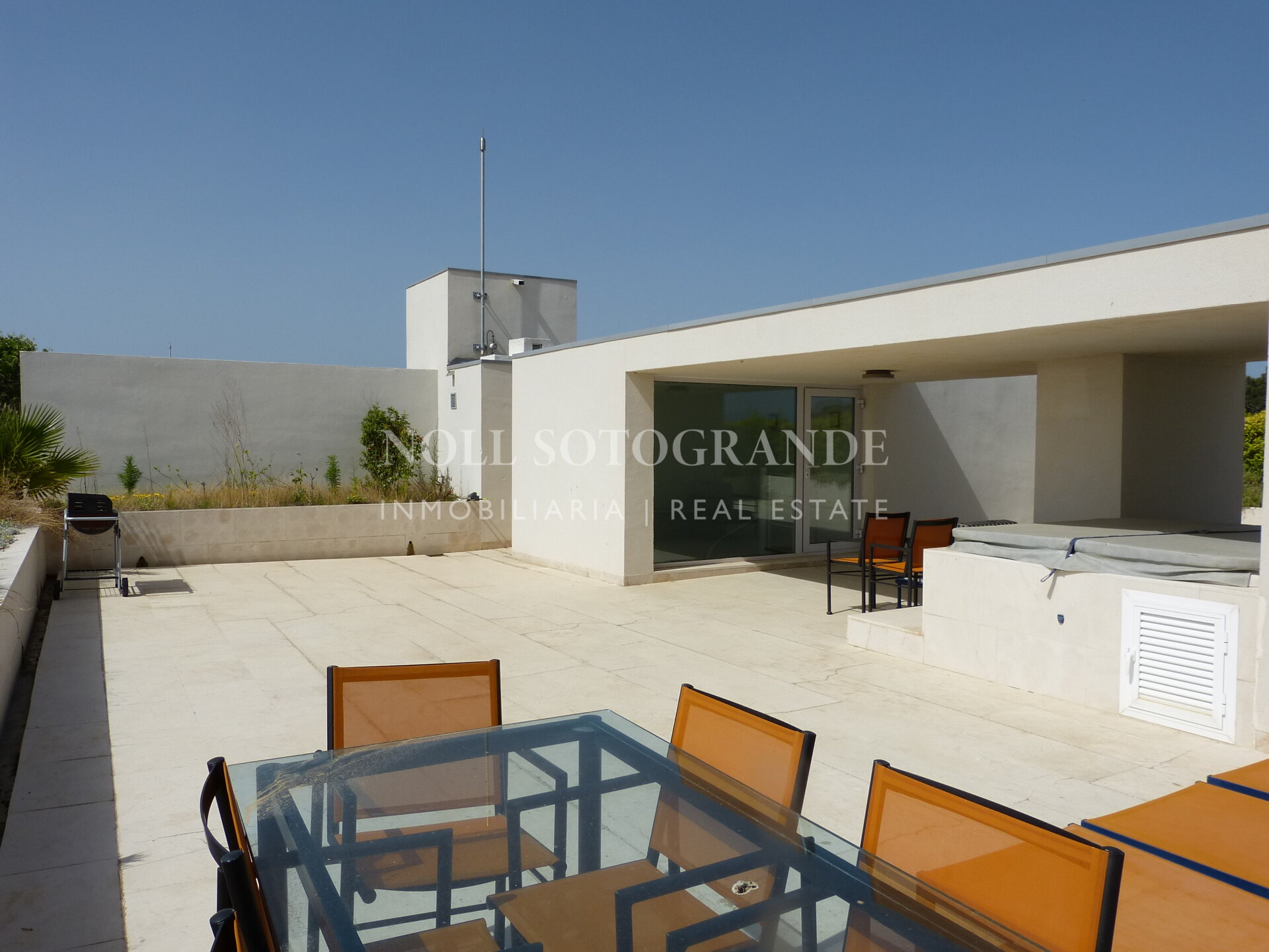 Dieses lichtdurchflutete Penthouse ist sehr gepflegt und schön eingerichtet. Die Küche ist komplett ausgestattet und neben der Küche befindet sich ein separater Hauswirtschaftsraum mit Waschmaschine, Trockner und Waschbecken. Der geräumige Wohn- und Essbereich bietet Zugang zu einer Terrasse mit Sitzbereich sowie Sonnenliegen. Das Apartment verfügt über vier Schlafzimmer mit jeweils eigenem Bad, verschiedenen Einbauschränken und einer Gästetoilette. Eine Wendeltreppe führt zur großen Dachterrasse mit Whirlpool und Blick auf das Meer. Der Apartmentkomplex verfügt über einen 24-Stunden-Sicherheitsdienst, einen Außenpool, ein Gym, Paddle-Tennisplatz, Sauna, Dampfbad und einen Spielbereich für Kinder.
