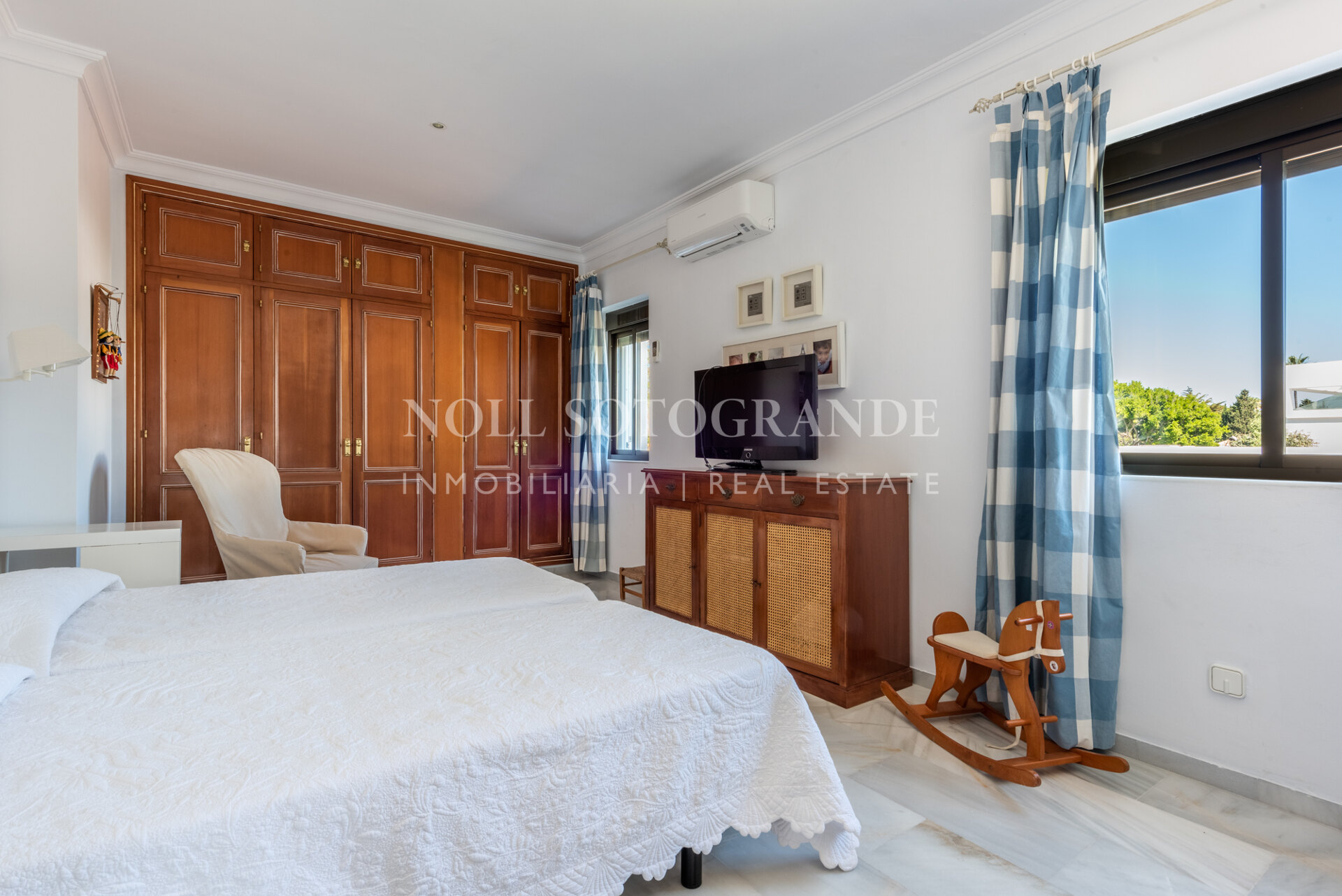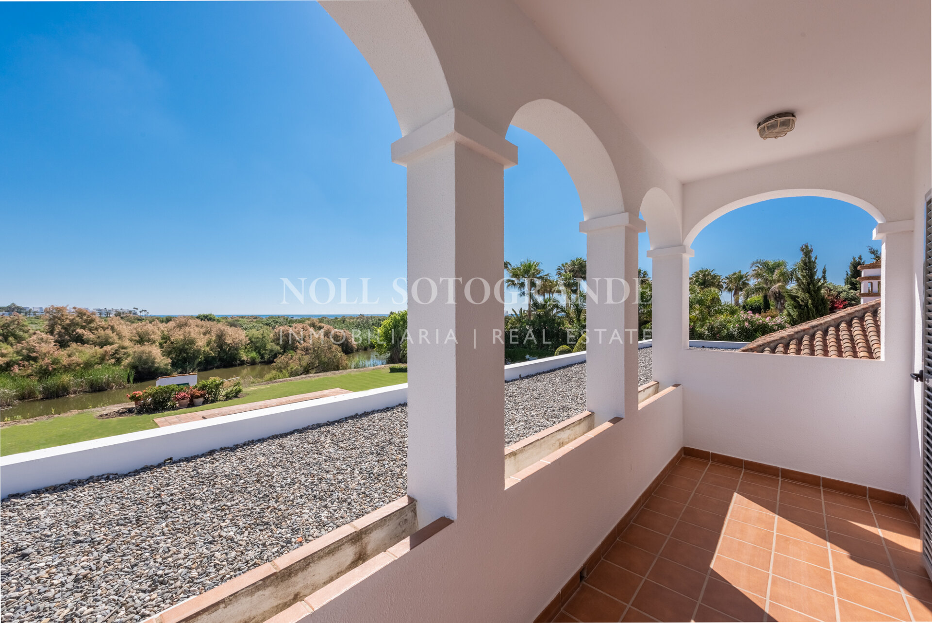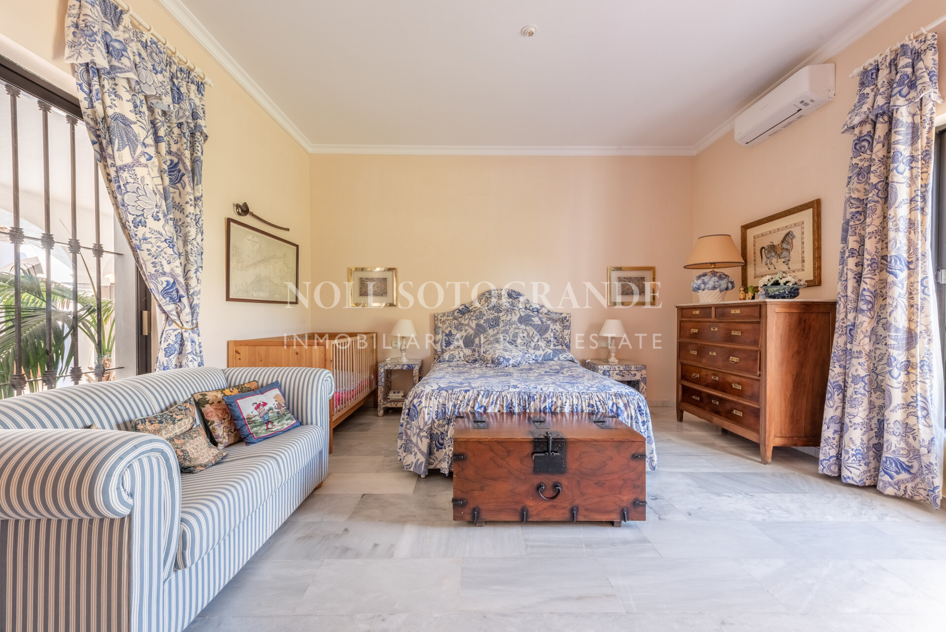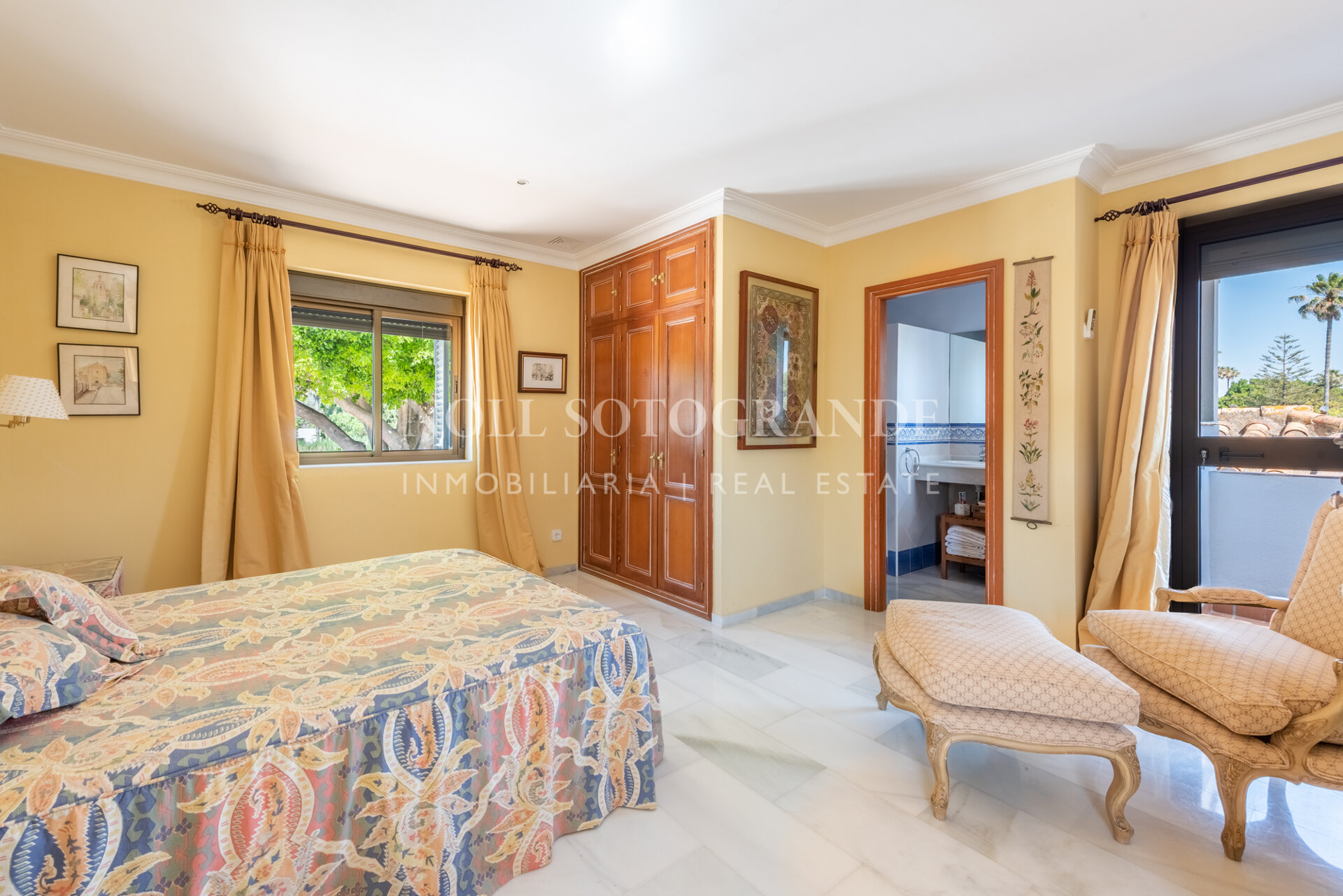 Entdecken Sie diese geräumige 8-Schlafzimmer-Villa im exklusiven Kings & Queens-Gebiet von Sotogrande Costa, die zur vorübergehenden Vermietung zur Verfügung steht. Ideal gelegen, nur wenige Schritte vom Strand entfernt und in der Nähe des renommierten Real Club de Golf Sotogrande, von Strandclubs und Padel-Einrichtungen, bietet diese Immobilie sowohl Luxus als auch Komfort. Eingebettet auf einem flachen Grundstück mit einem privaten Garten, der an das ruhige Naturschutzgebiet am Mündungsgebiet des Río Guadiaro grenzt, ist die Villa perfekt für Familien oder Gruppen, die einen friedlichen Rückzugsort suchen. Die Villa verfügt über großzügige Innenräume, darunter acht komfortable Schlafzimmer, die ausreichend Platz für Gäste bieten. Für ganzjährigen Komfort konzipiert, ist sie mit Fußbodenheizung und Klimaanlage in allen Schlafzimmern ausgestattet. Das Layout verbindet harmonisch Innen- und Außenwohnen, sodass Gäste den üppigen Garten genießen können, der sich ideal zum Entspannen oder für gesellige Zusammenkünfte eignet.