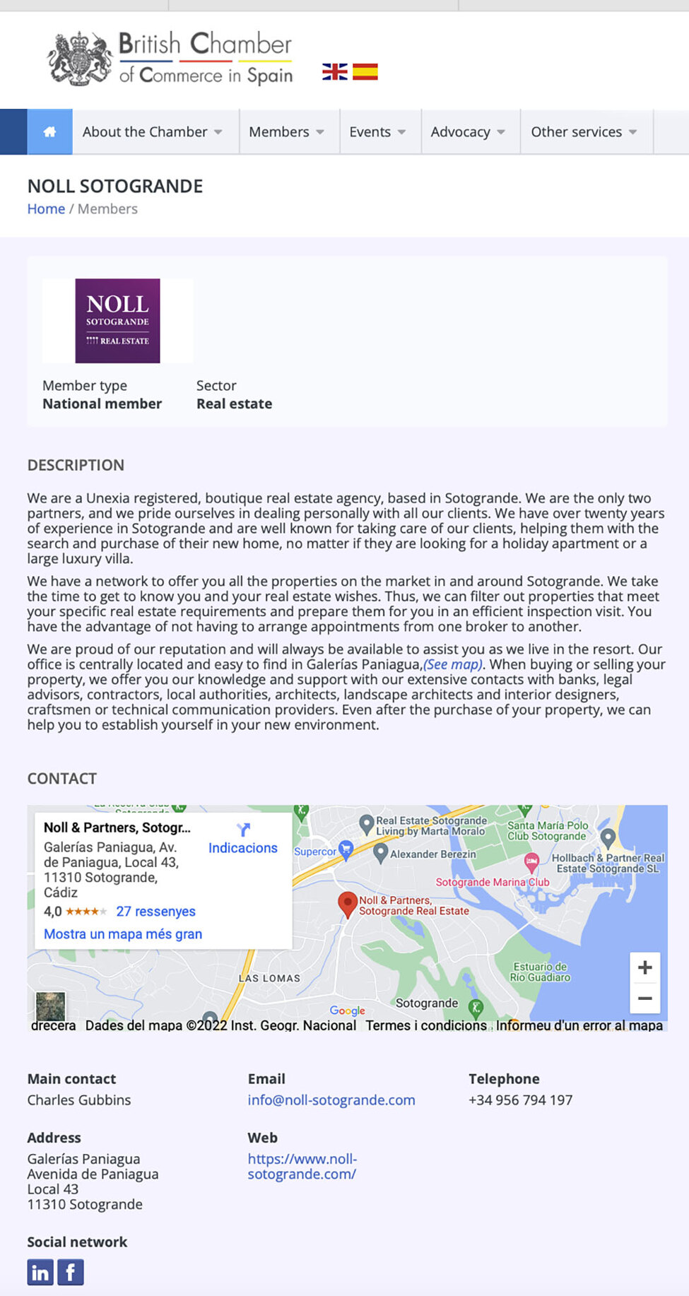Según Charlie, “Como persona que ha vivido y trabajado en muchos países diferentes, siempre he encontrado que tener una buena red es muy importante, desde una perspectiva comercial y, por supuesto, desde un punto de vista personal. Unirse a la Cámara de Comercio Británica es una muy buena fuente para conocer gente nueva, pero particularmente útil desde el punto de vista empresarial. Como empresa de bienes raíces, siempre habrá un amigo de un amigo que conoce a alguien que puede ayudar con los clientes potenciales. Estoy seguro de que Noll Sotogrande se beneficiará de ser miembro desde el primer momento. Sotogrande es cada vez más visible y, como tal, atrae a particulares y empresas. Esperamos una larga relación”.