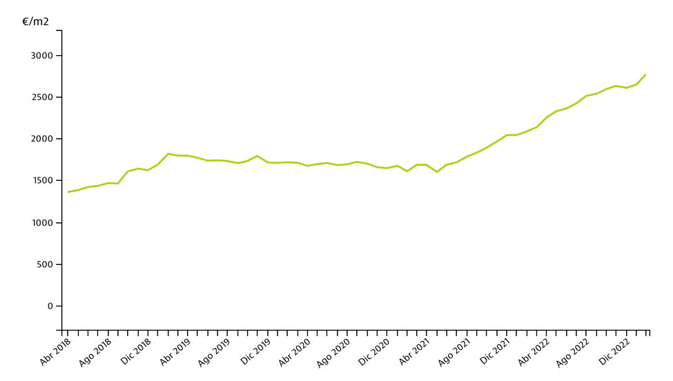 Fruto de este crecimiento, el informe de área de Idealista muestra un gran incremento de precios en los últimos 12 meses, los precios han subido más del 30% desde febrero de 2022, registrando también un aumento del 4,7% desde enero, cerrando un precio medio por m2 de 2.774€ .