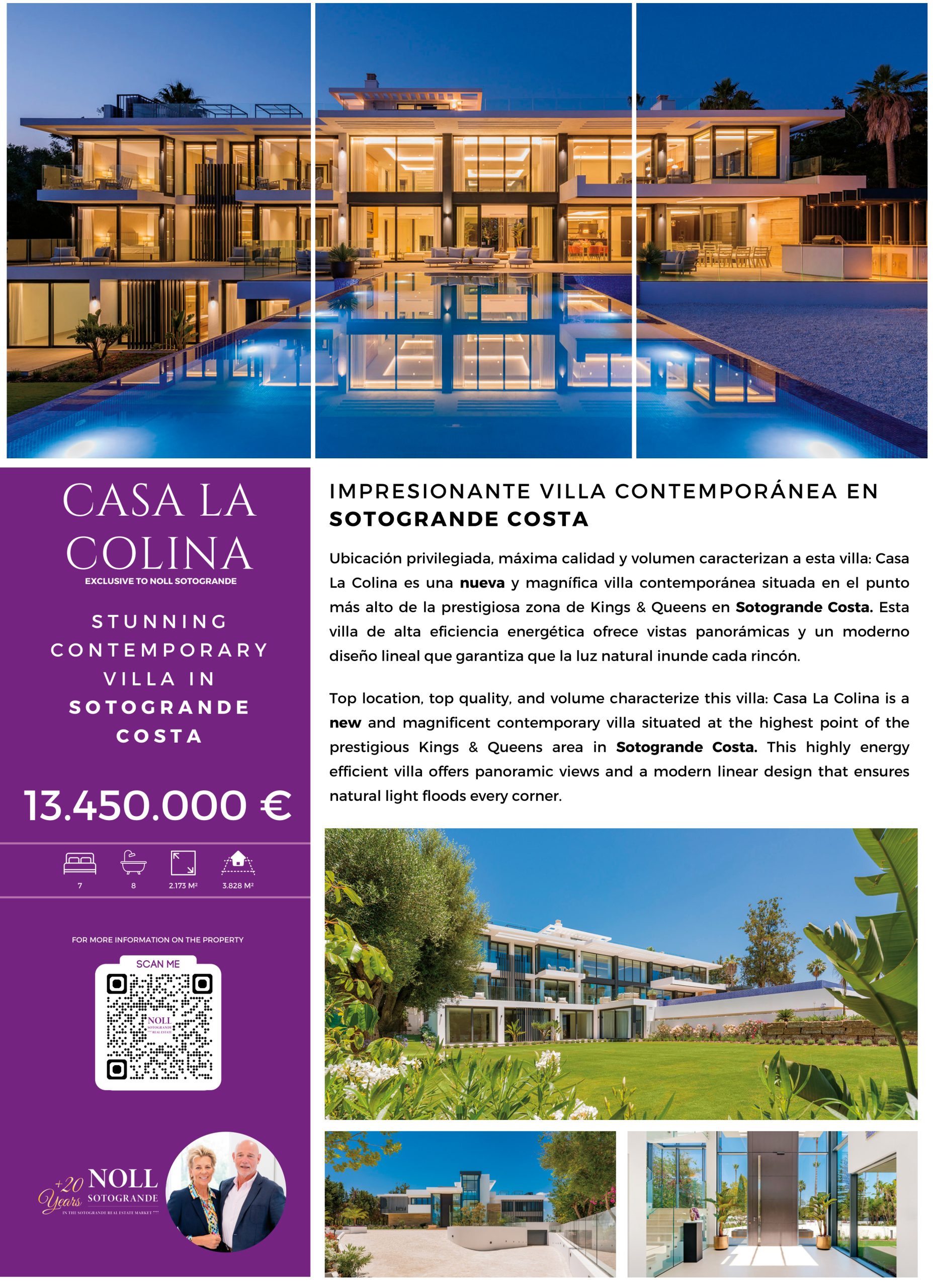 Casa La Colina, una nueva villa contemporánea, destaca por su ubicación, calidad y espacio. Situada en el punto más alto de la prestigiosa zona de Kings & Queens en Sotogrande Costa, esta magnífica propiedad tiene una superficie total construida de 2.173 m², incluyendo terrazas. Su diseño moderno y lineal permite que la luz natural inunde todos los espacios, ofreciendo impresionantes vistas.