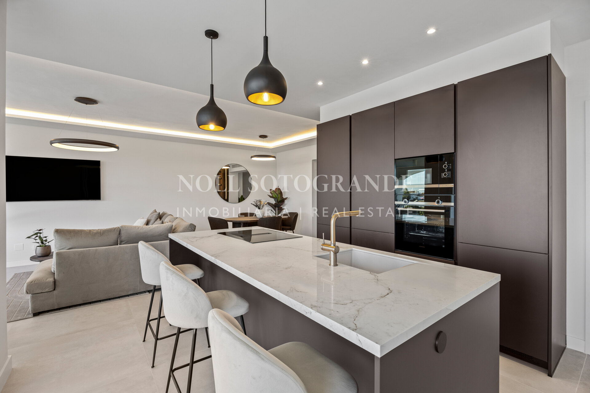 Las grandes puertas de cristal deslizantes permiten que la luz natural inunde el espacio habitable, creando una conexión perfecta entre el interior y el paisaje circundante. La cocina moderna cuenta con una elegante isla de mármol, proporcionando un excelente espacio para cocinar mientras se disfrutan de las impresionantes vistas.