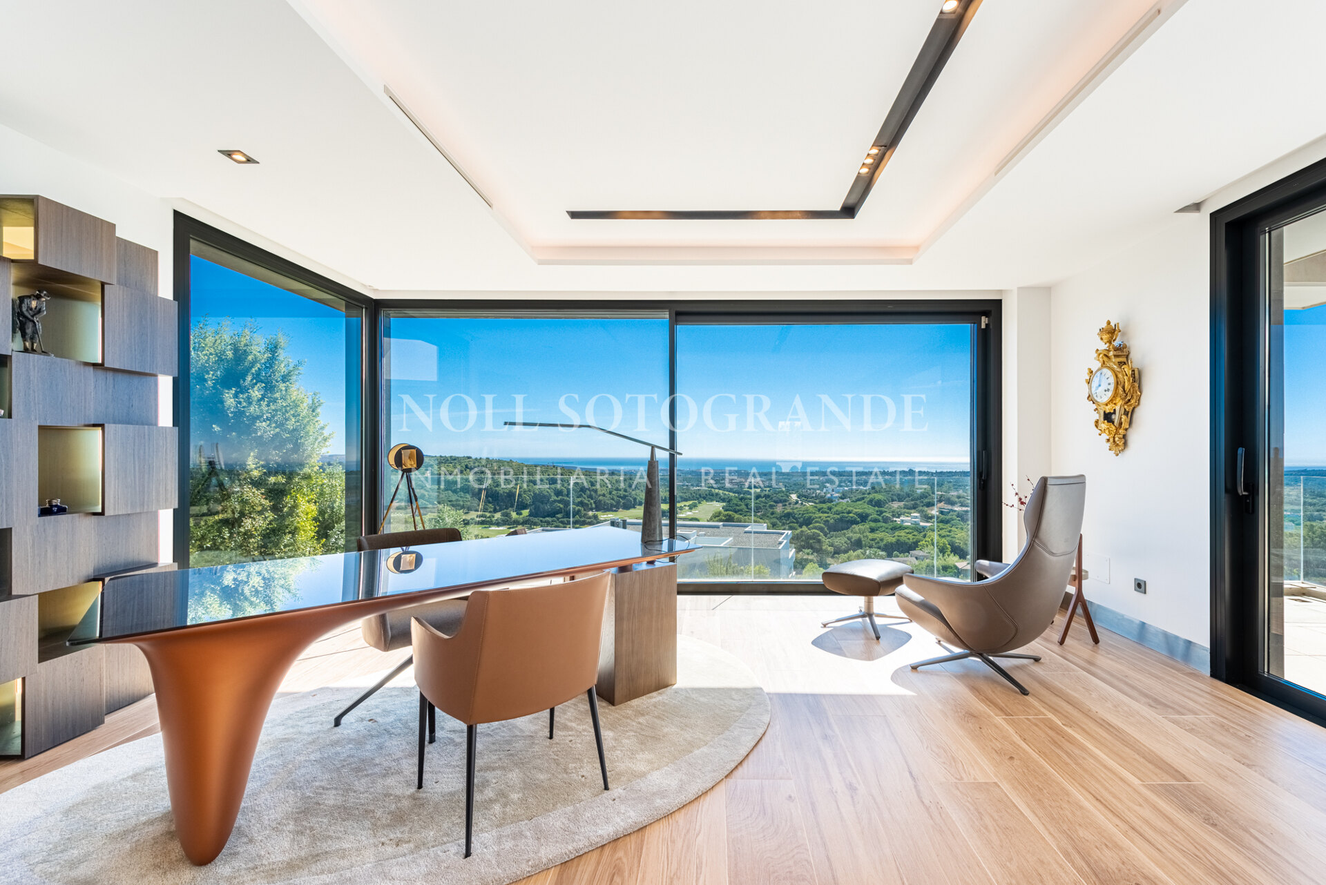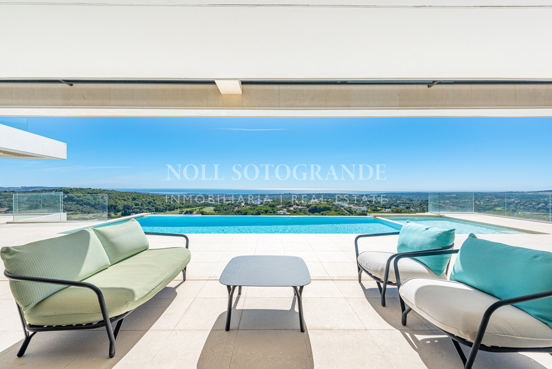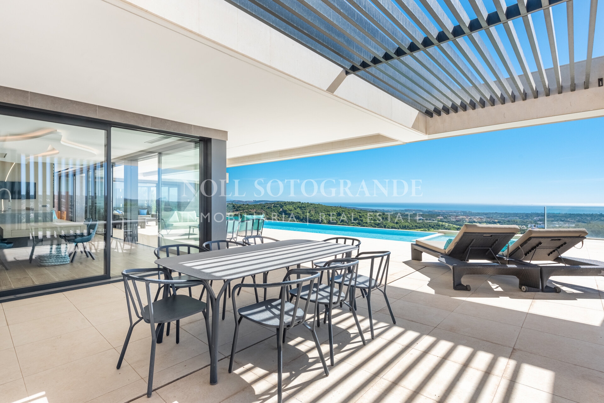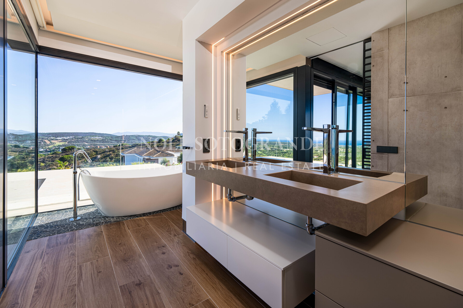 Esta villa recientemente terminada ubicada en lo alto de las laderas de La Reserva que ofrece vistas espectaculares ya está disponible para la venta. Está construida sobre una parcela en pendiente con un maravilloso jardín. Ubicada donde se pueden apreciar las mejores vistas de Sotogrande, la propiedad atraerá a la mayoría de los propietarios. La vivienda con una superficie de 841 m2 se asienta sobre una parcela de 2297 m2 y tiene la siguiente distribución: Planta alta: se ubica la villa principal en suite con su baño y vestidor, una gran terraza así como dos dormitorios más cada uno con sus baños en este piso. Planta principal: este nivel se compone del hall de entrada, escaleras a la planta superior y de bajada a la planta sótano, la sala de estar, el comedor, la cocina, un dormitorio y baño y aseo de invitados. Grandes puertas corredizas de vidrio se abren a una increíble terraza y a la piscina. Sótano: Aquí se encuentra un quinto dormitorio y baño, el sauna jacuzzi, el área de gimnasio, un espacio de entretenimiento de TV y una pequeña cocina y área de bar. Además, hay un garaje para 3 coches, una sala de máquinas, un amplio espacio de almacenamiento y dos aseos para invitados. Construida con altas especificaciones, esta propiedad es apta para sillas de ruedas con ascensor, desde la planta baja hasta todos los niveles, y una piscina de agua salada. Se puede proporcionar una especificación completa y planos para cualquier solicitante interesado.