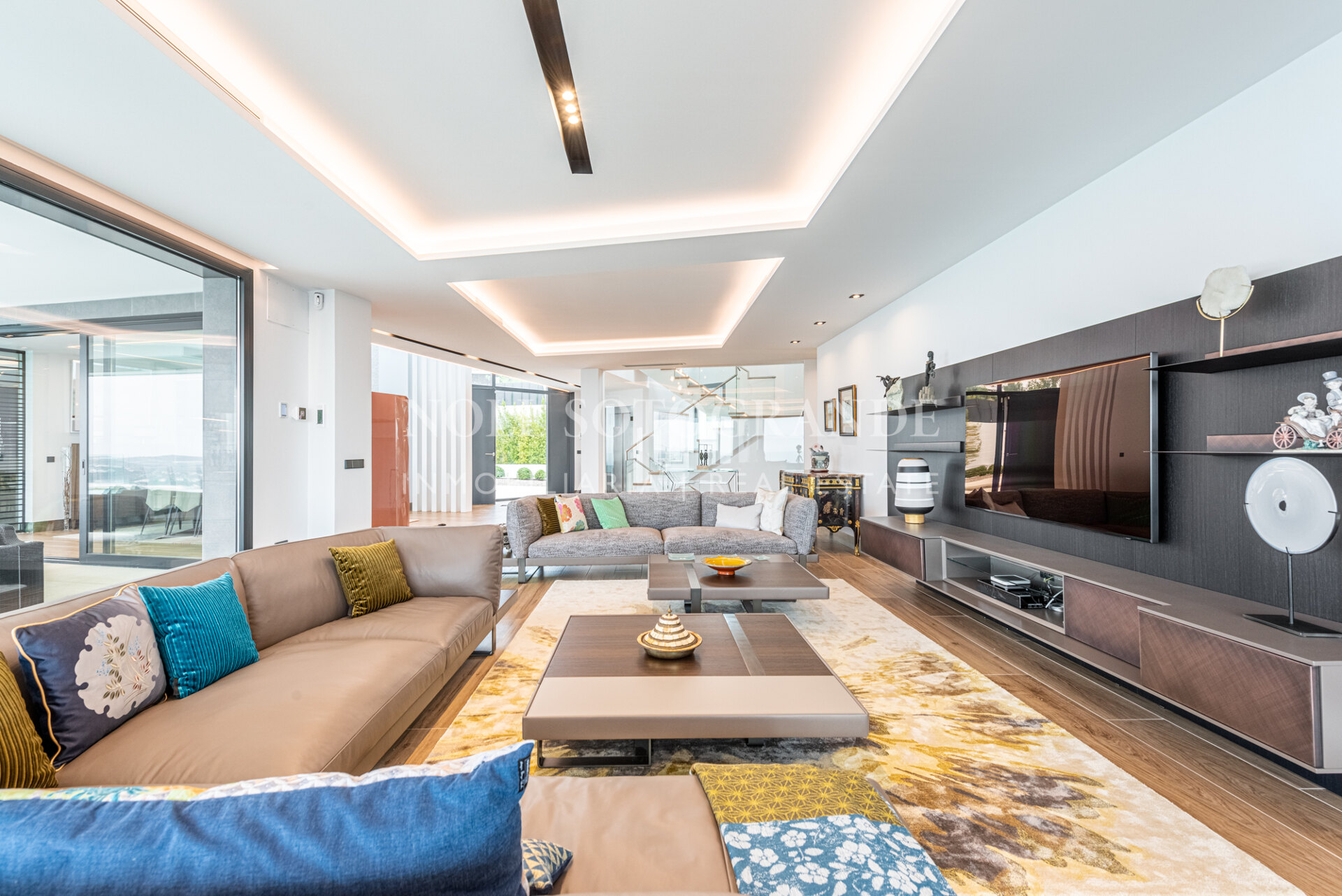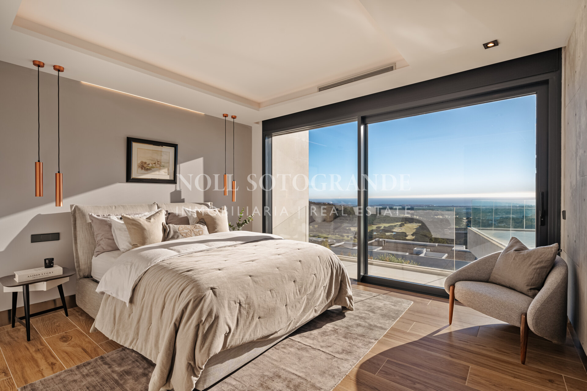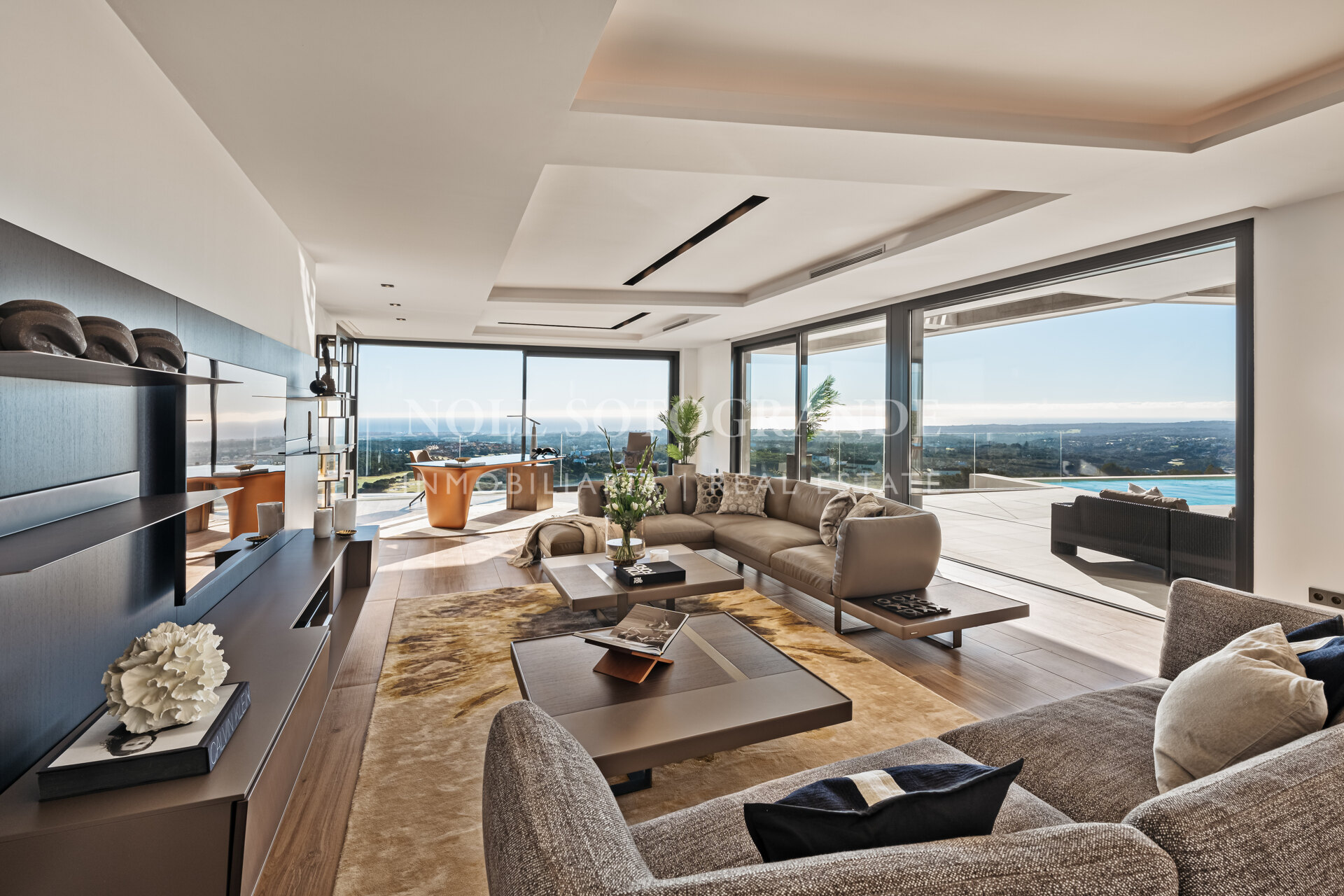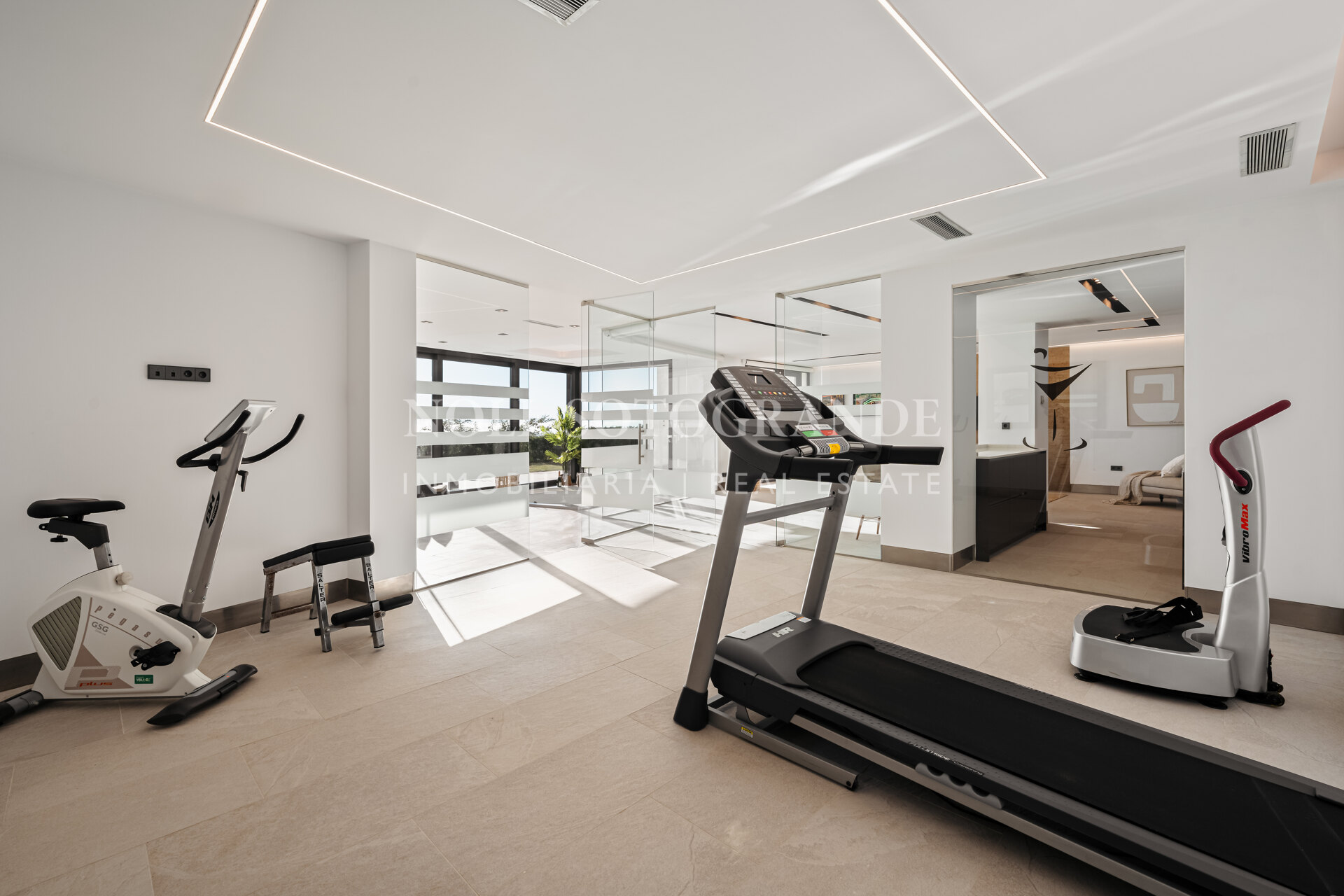 Esta villa recientemente terminada ubicada en lo alto de las laderas de La Reserva que ofrece vistas espectaculares ya está disponible para la venta. Está construida sobre una parcela en pendiente con un maravilloso jardín. Ubicada donde se pueden apreciar las mejores vistas de Sotogrande, la propiedad atraerá a la mayoría de los propietarios. La vivienda con una superficie de 841 m2 se asienta sobre una parcela de 2297 m2 y tiene la siguiente distribución: Planta alta: se ubica la villa principal en suite con su baño y vestidor, una gran terraza así como dos dormitorios más cada uno con sus baños en este piso. Planta principal: este nivel se compone del hall de entrada, escaleras a la planta superior y de bajada a la planta sótano, la sala de estar, el comedor, la cocina, un dormitorio y baño y aseo de invitados. Grandes puertas corredizas de vidrio se abren a una increíble terraza y a la piscina. Sótano: Aquí se encuentra un quinto dormitorio y baño, el sauna jacuzzi, el área de gimnasio, un espacio de entretenimiento de TV y una pequeña cocina y área de bar. Además, hay un garaje para 3 coches, una sala de máquinas, un amplio espacio de almacenamiento y dos aseos para invitados. Construida con altas especificaciones, esta propiedad es apta para sillas de ruedas con ascensor, desde la planta baja hasta todos los niveles, y una piscina de agua salada. Se puede proporcionar una especificación completa y planos para cualquier solicitante interesado.