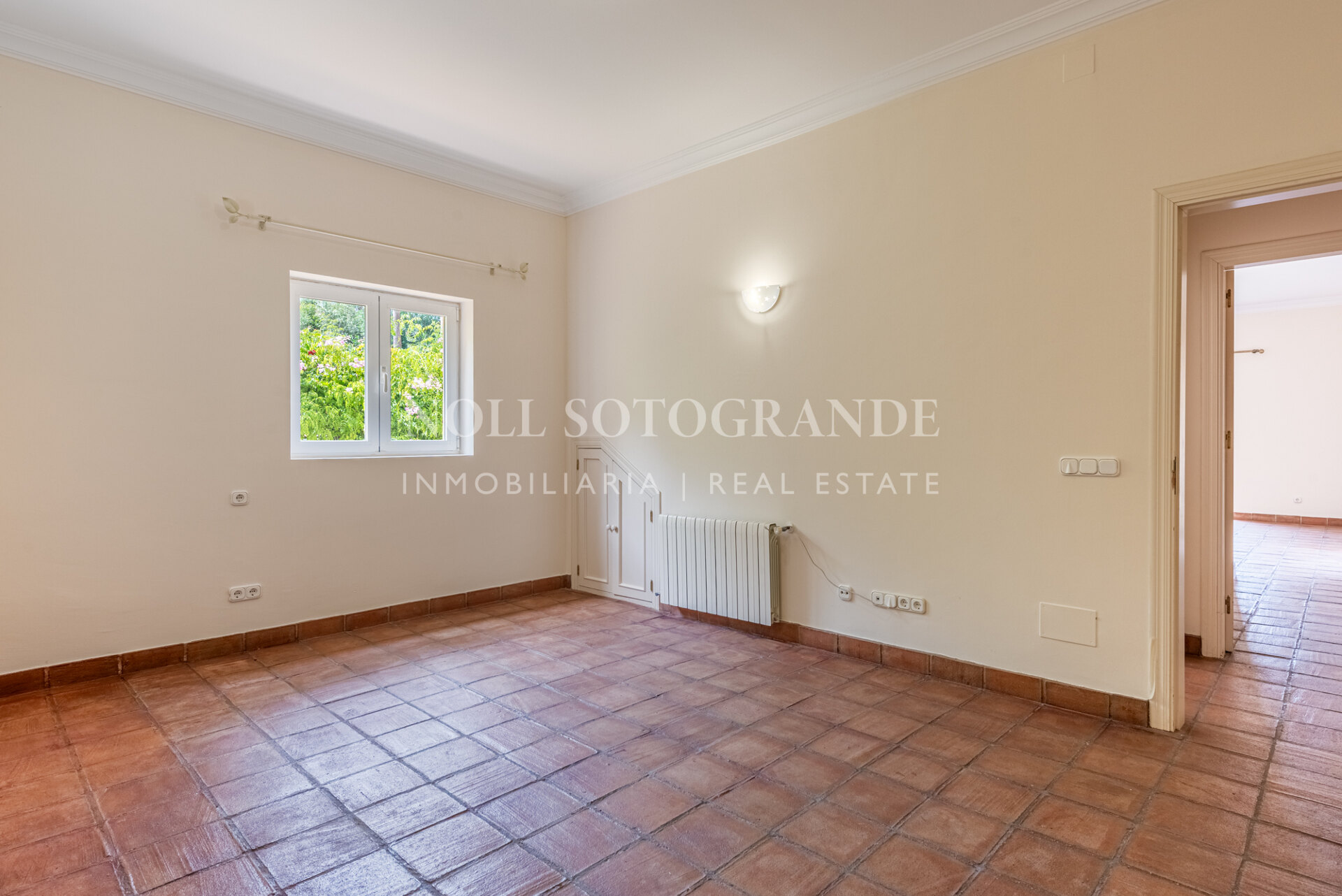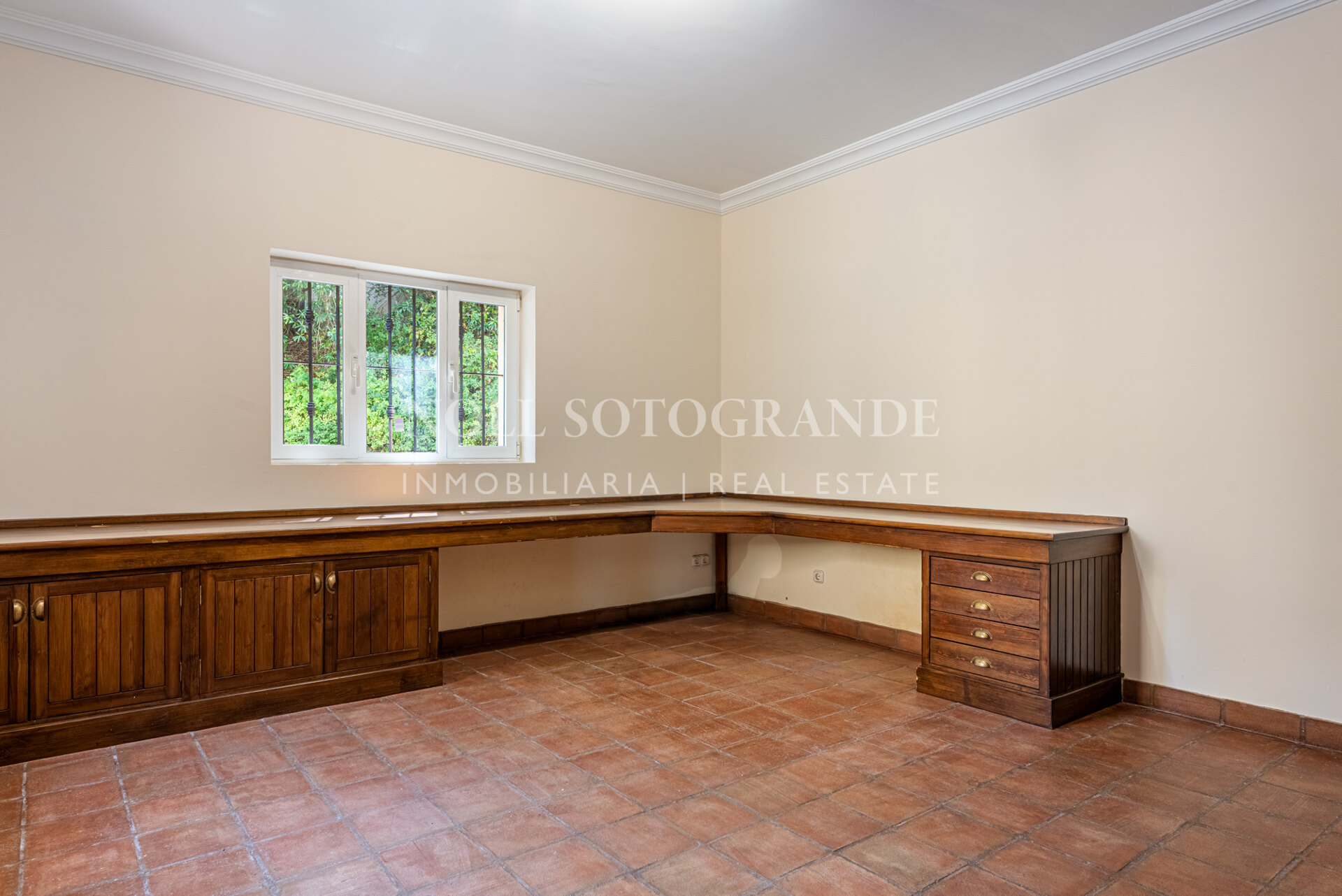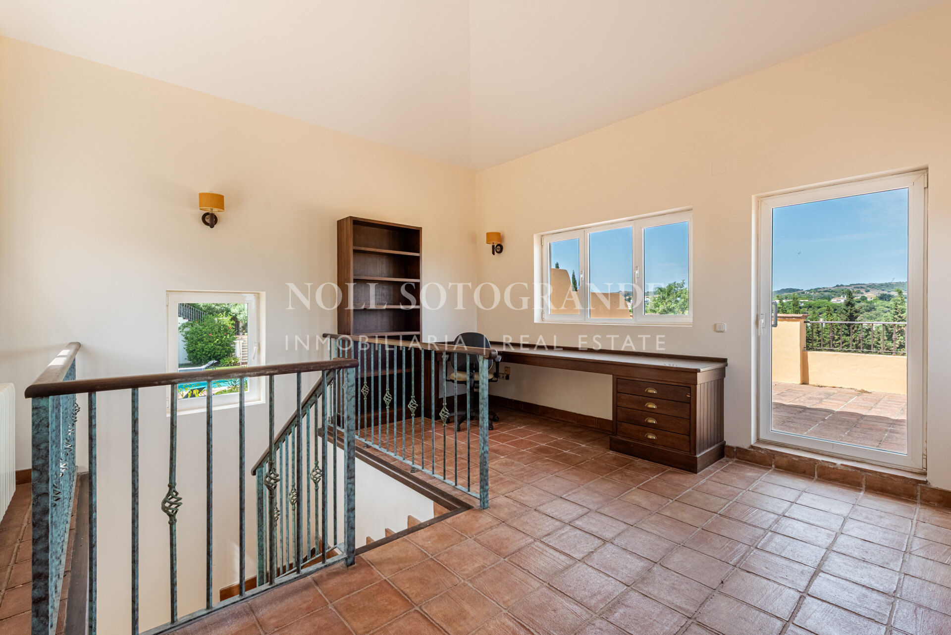 En la planta superior, la suite principal cuenta con baño privado, vestidor, balcón Julieta y acceso a una terraza con vistas panorámicas. Los dormitorios y baños adicionales ofrecen mucho espacio para la familia y los invitados. Una oficina con su propia terraza y una generosa distribución en ambas alas realzan la sensación de espacio. Las zonas exteriores de la villa están diseñadas para el descanso y el entretenimiento, con una terraza de 205 m², un jardín maduro y una piscina con vistas al entorno natural. El amplio sótano tiene capacidad para 6-8 coches y puede convertirse en un gimnasio, una sala de cine o una zona para el personal, lo que aumenta la versatilidad de la propiedad. Los suelos de terracota, los armarios empotrados y la calefacción central completan esta casa familiar en una tranquila ubicación en Sotogrande Alto.