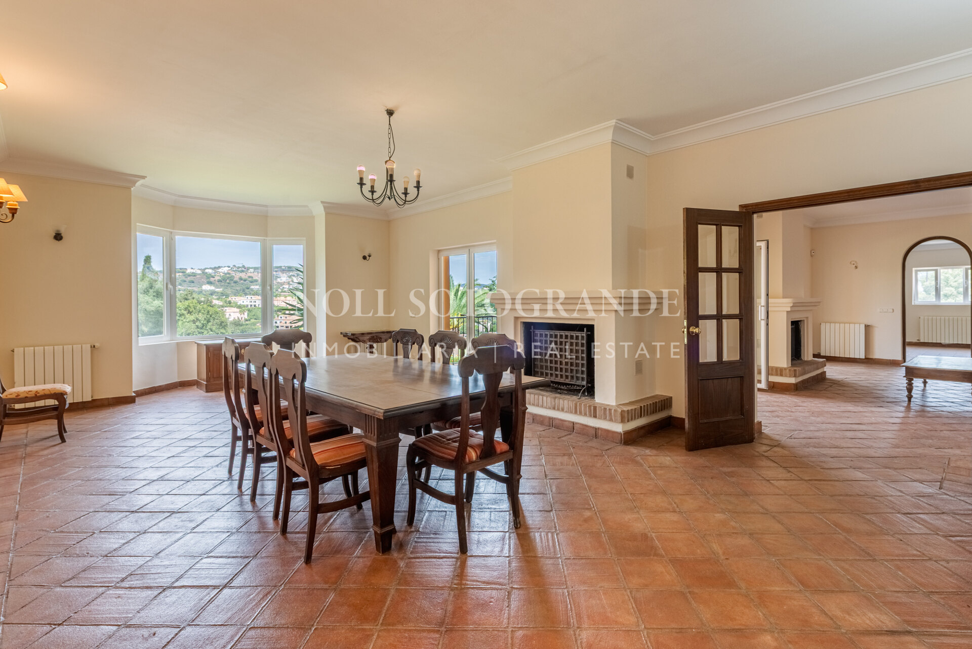 La propiedad combina el confort familiar con un amplio potencial de personalización. En el interior, la villa cuenta con ocho habitaciones en total, seis dormitorios y cinco baños. La acogedora entrada da paso a un amplio salón con chimenea y acceso a la terraza, mientras que el comedor independiente, también con su propia chimenea, ofrece un ambiente cálido para las reuniones. La cocina, totalmente equipada, cuenta con electrodomésticos integrados y un lavadero.