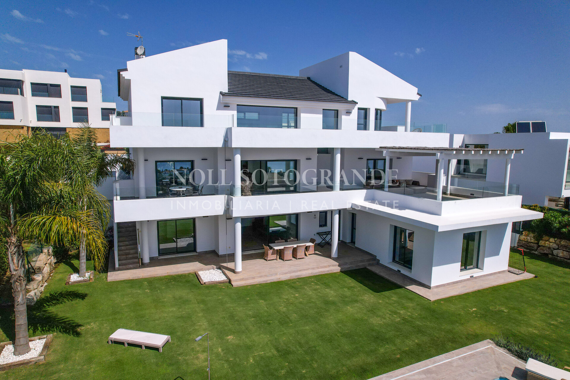 The 500 m2 villa was completed in July 2020. It is of modern design, well-furnished in an elegant style throughout. Large patio doors lead out to spacious covered terraces of an additional 150m2, designed to take full advantage of the spectacular panorama whilst dining al fresco. Every floor benefits from natural light and large glass doors and windows provide beautiful views from all areas of the house.