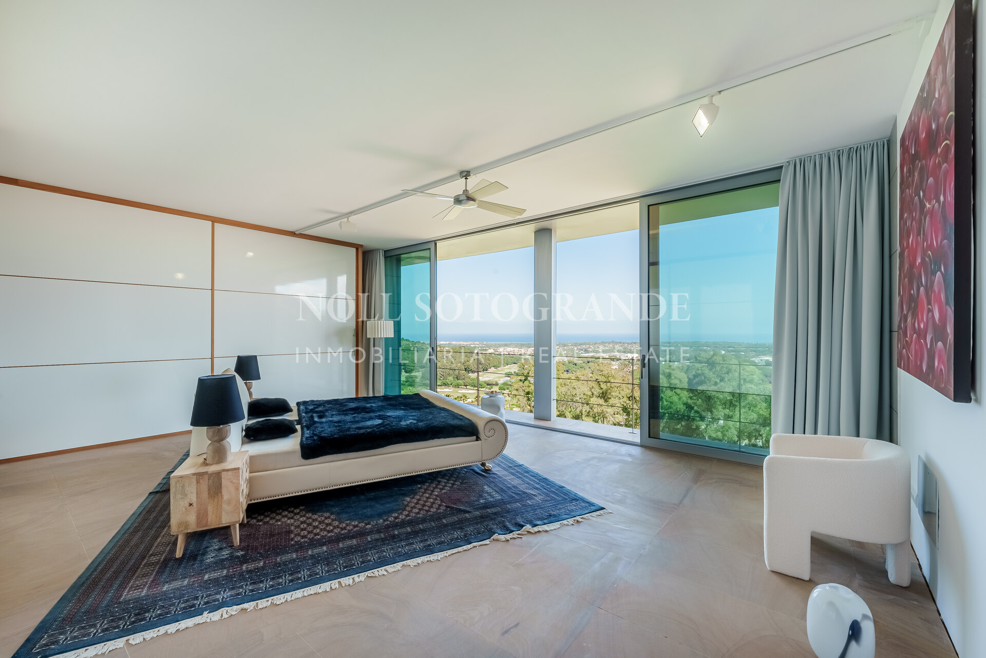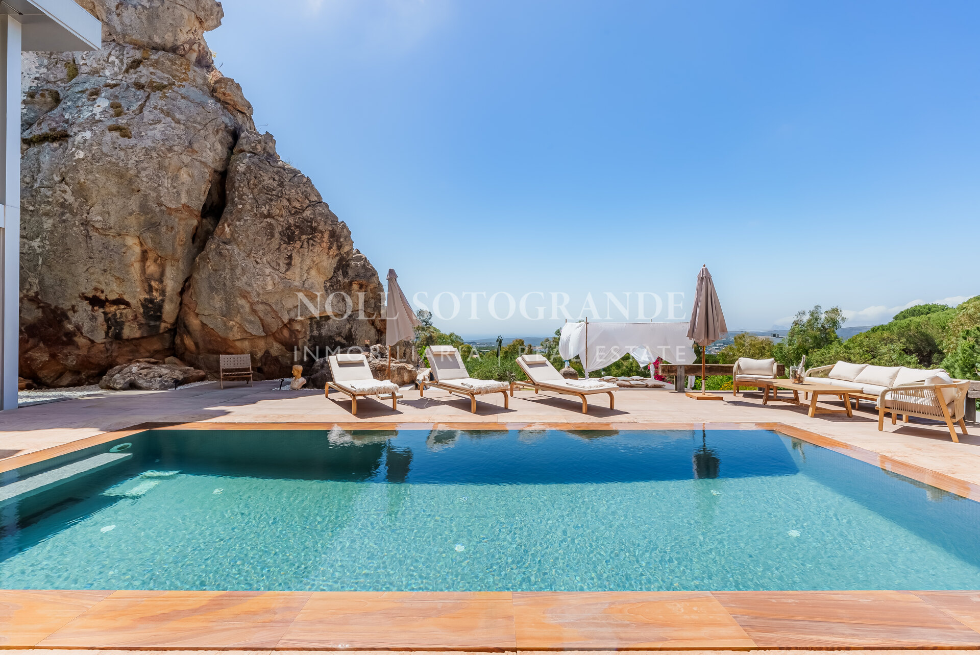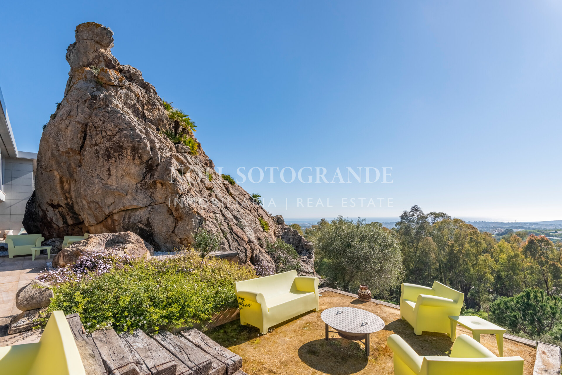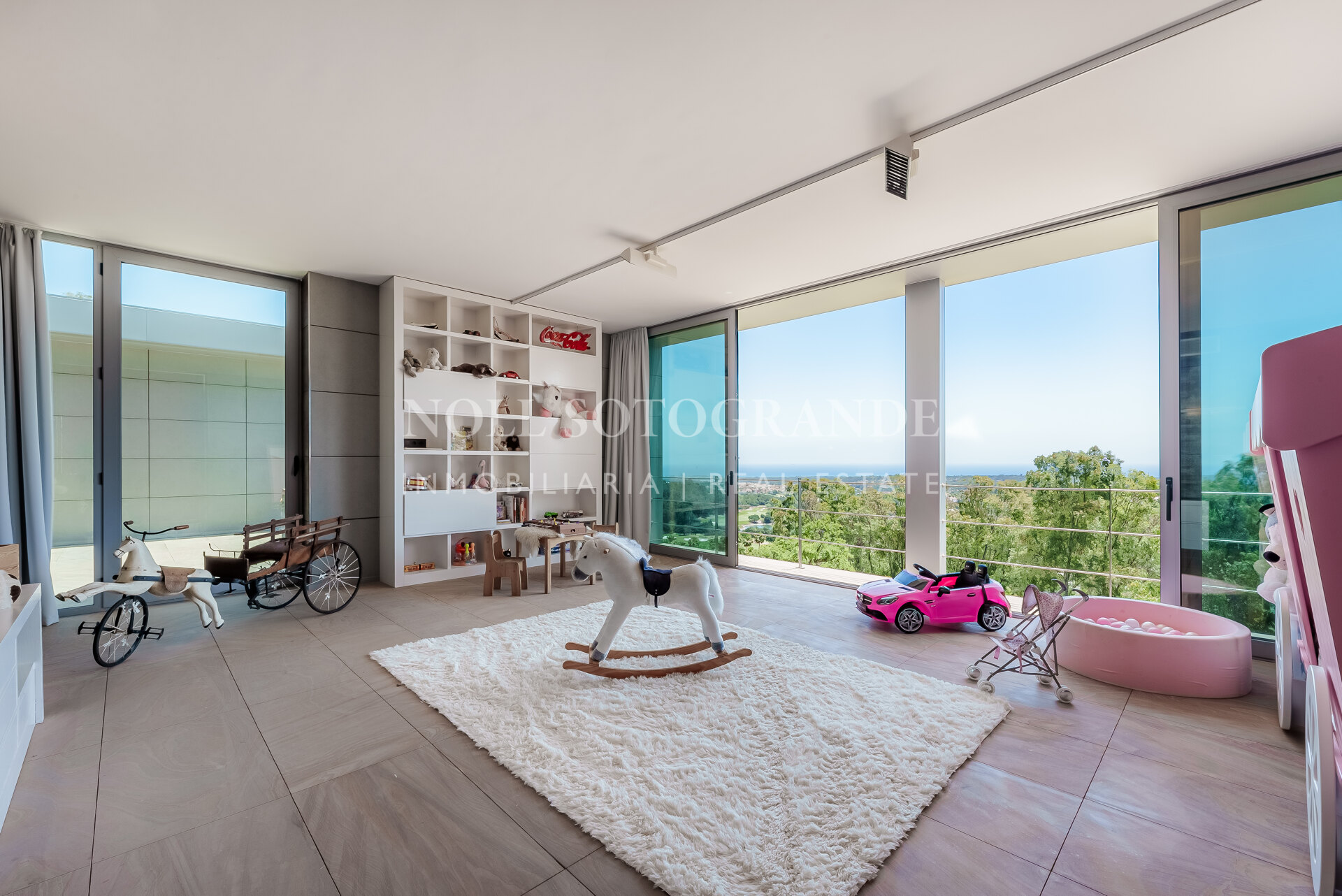 Villa Bond further provides an outdoor pool, staff accommodations, and a spacious multi-car garage. A fun and secure playground for children lies on the side at the entrance to the property. Equipped with underfloor heating throughout and a solar energy system for hot water, the villa ensures comfort and sustainability, as well as Fibre Optic Internet connection. The unobstructed view of Sotogrande, the sea, the African coast and the Atlas Mountains from almost every room, combined with the originality of the villa design, make this holiday property an experience in a class of its own.