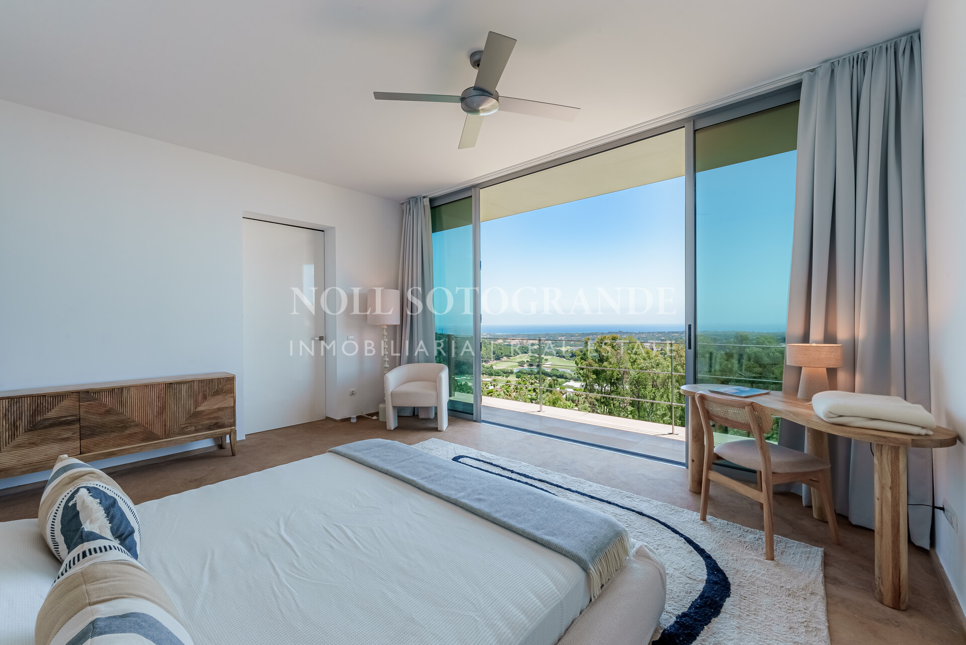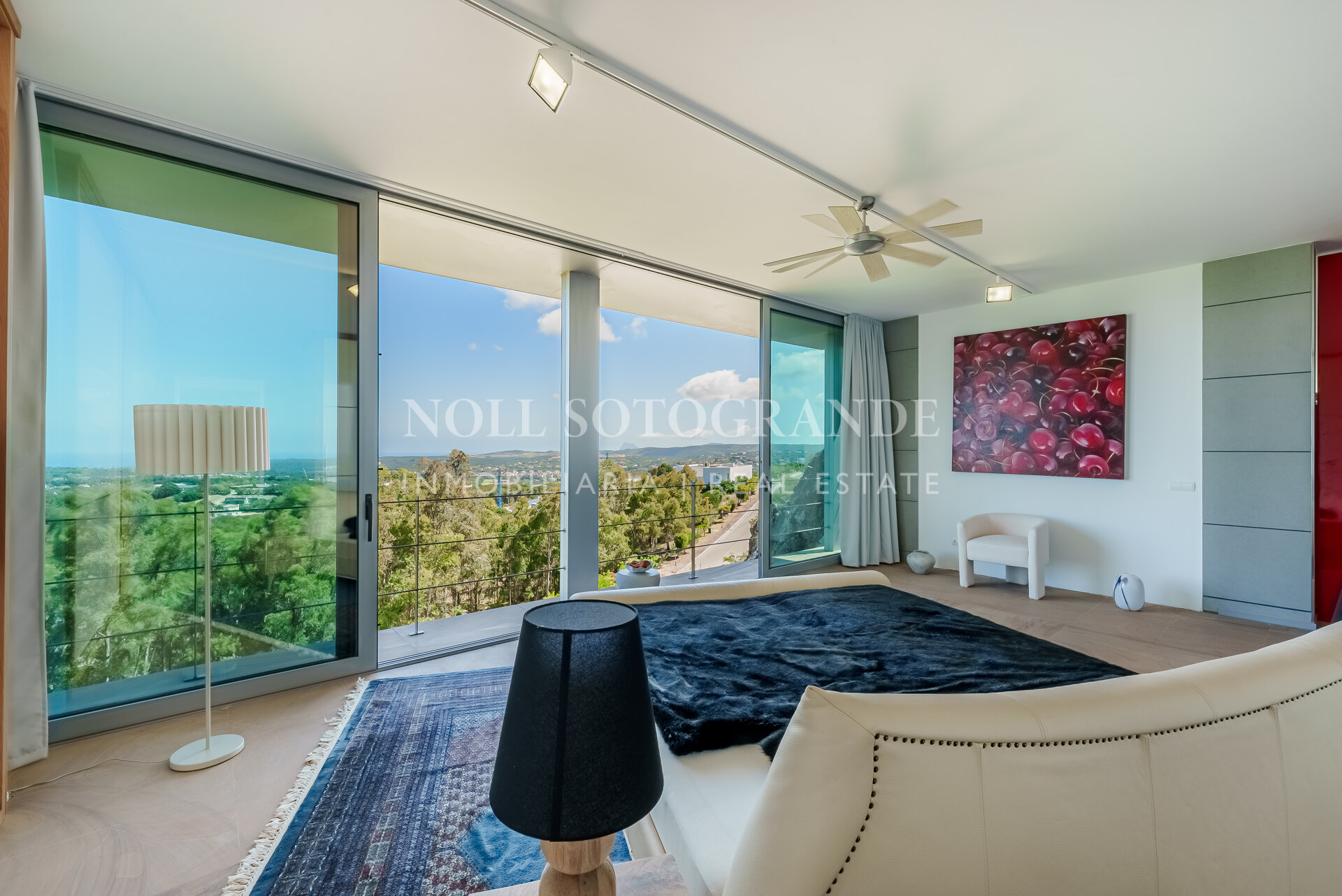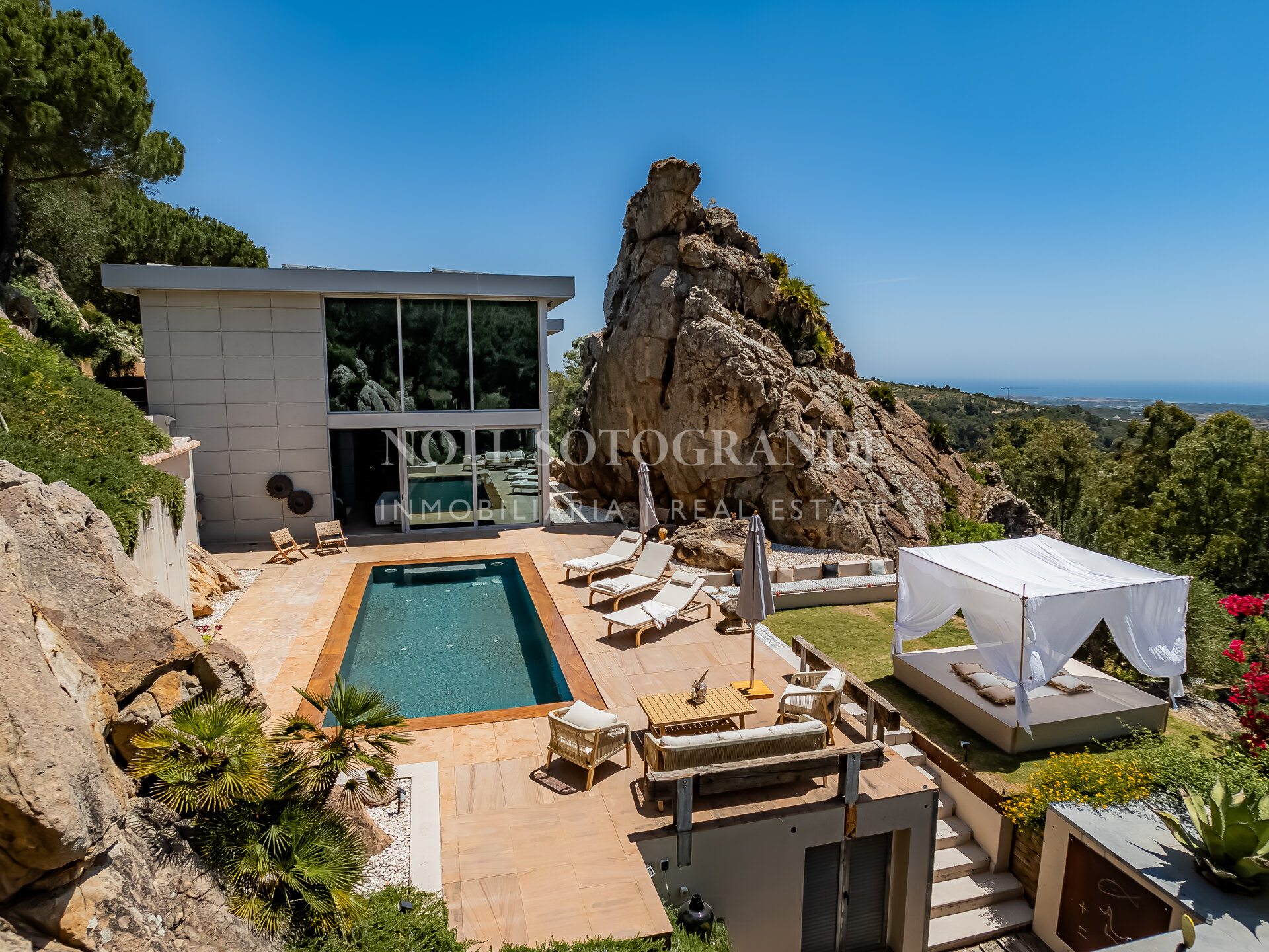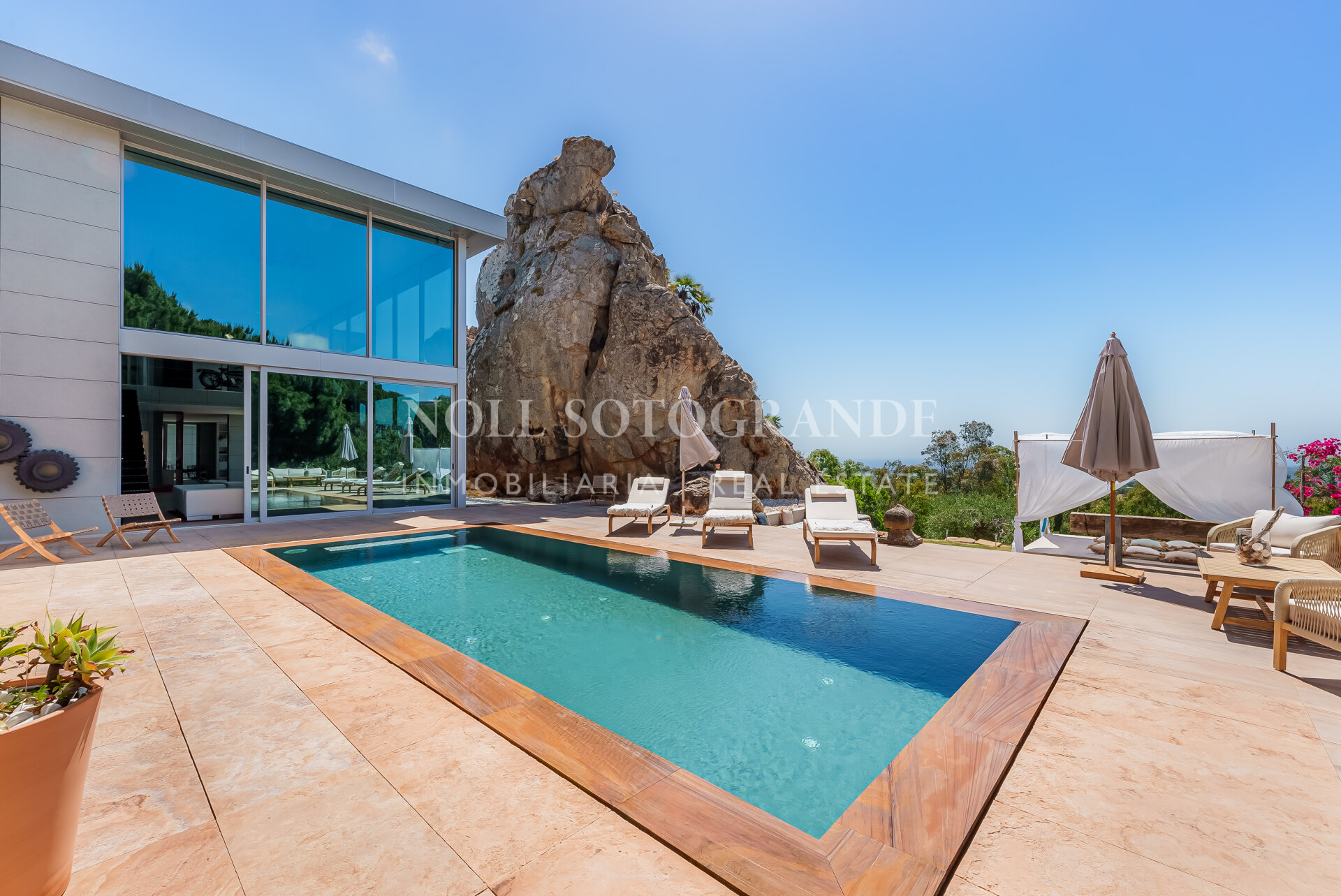 Villa Bond further provides an outdoor pool, staff accommodations, and a spacious multi-car garage. A fun and secure playground for children lies on the side at the entrance to the property. Equipped with underfloor heating throughout and a solar energy system for hot water, the villa ensures comfort and sustainability, as well as Fibre Optic Internet connection. The unobstructed view of Sotogrande, the sea, the African coast and the Atlas Mountains from almost every room, combined with the originality of the villa design, make this holiday property an experience in a class of its own.