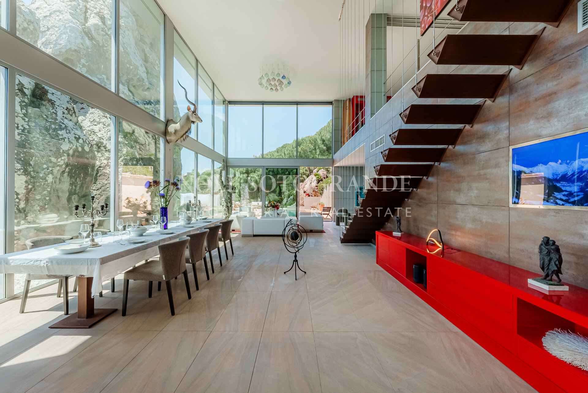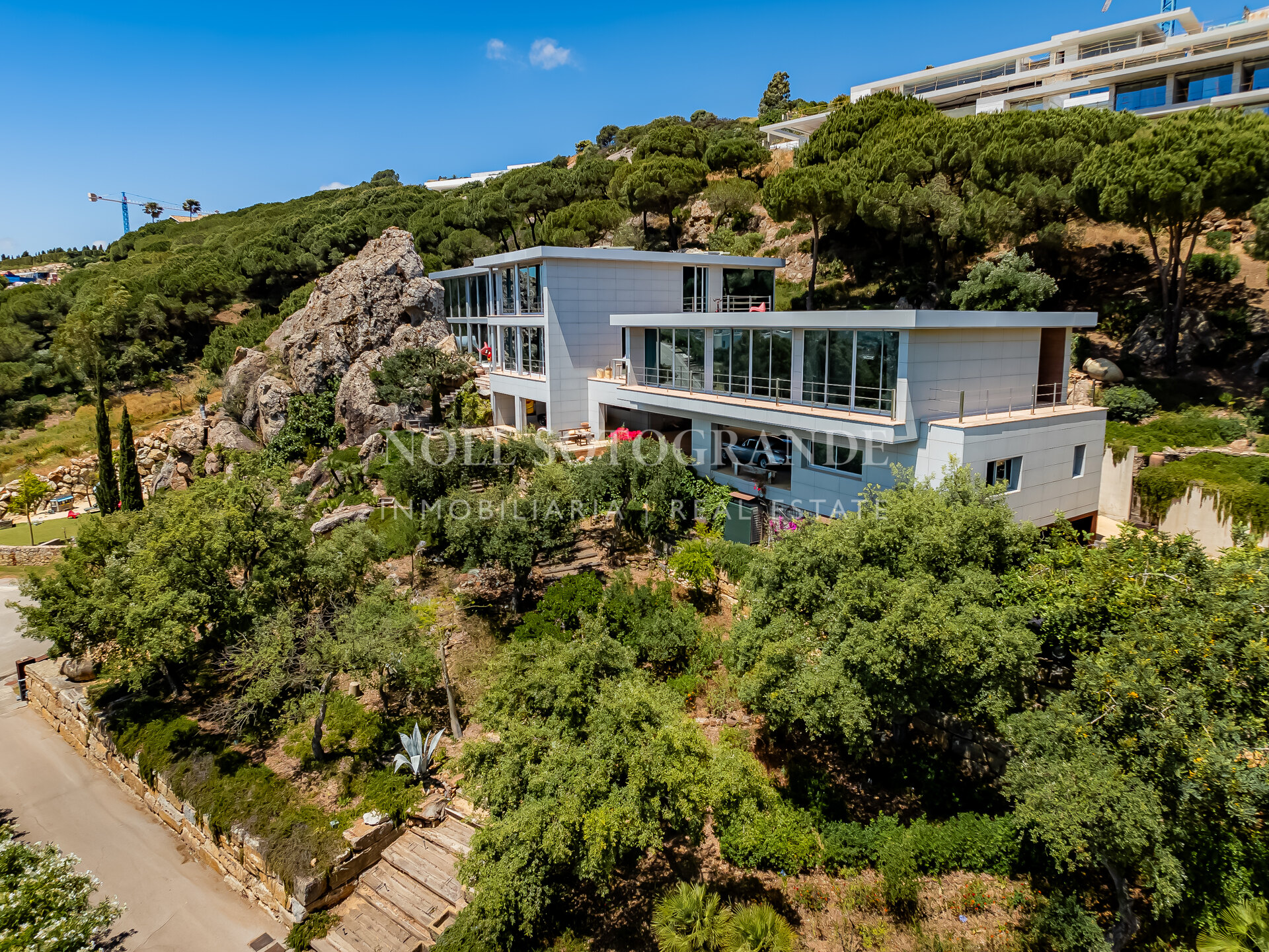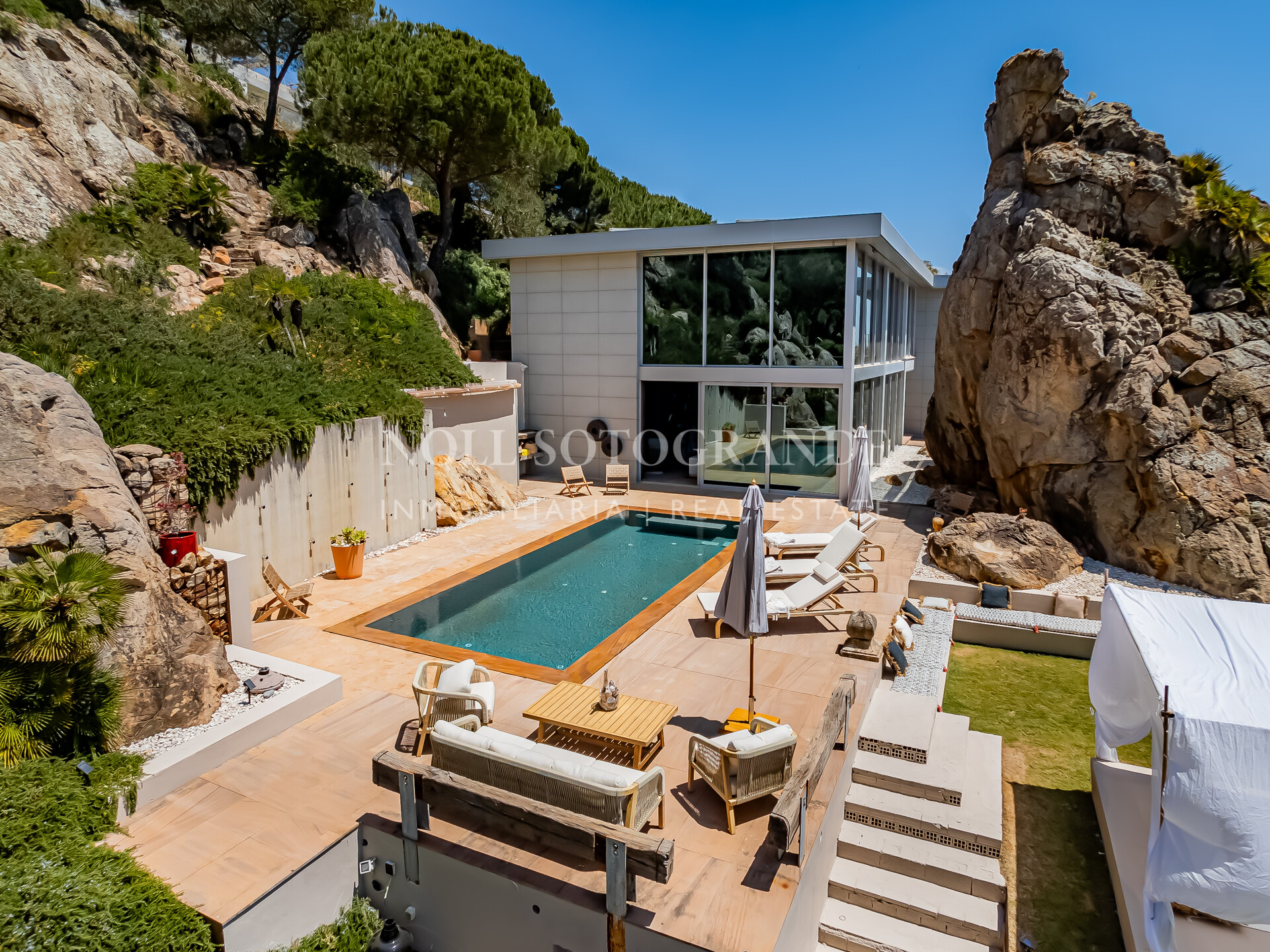 This exceptional property, situated on an expansive 6000m² plot, is much more than just a four-bedroom, five-bathroom villa spanning three levels and covering 778m². It offers breathtaking views and embodies architectural brilliance, exuding security, strength, and originality. The modern façade, the prominent rock feature, and interiors bathed in natural light contribute to the villa’s spectacular ambiance.