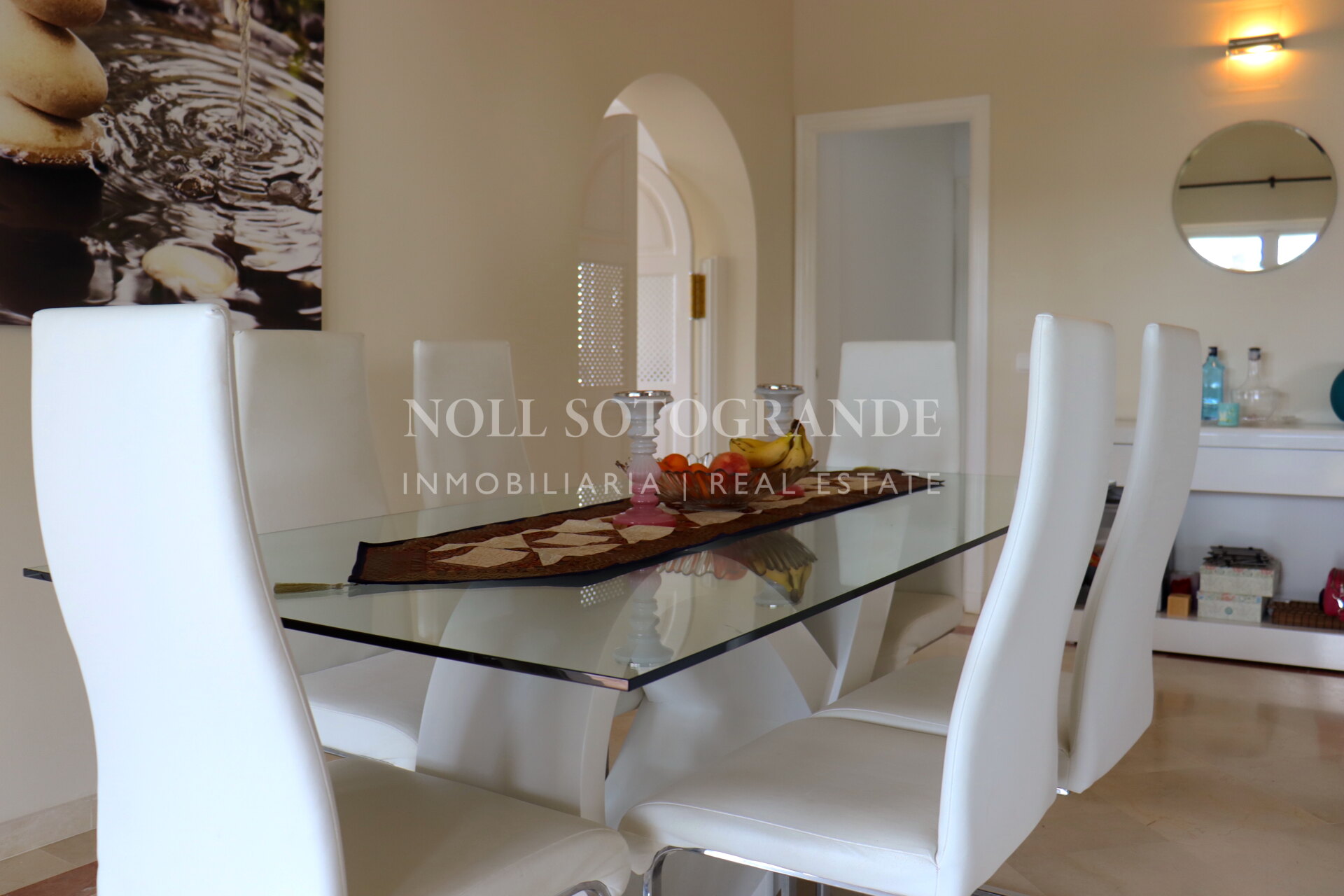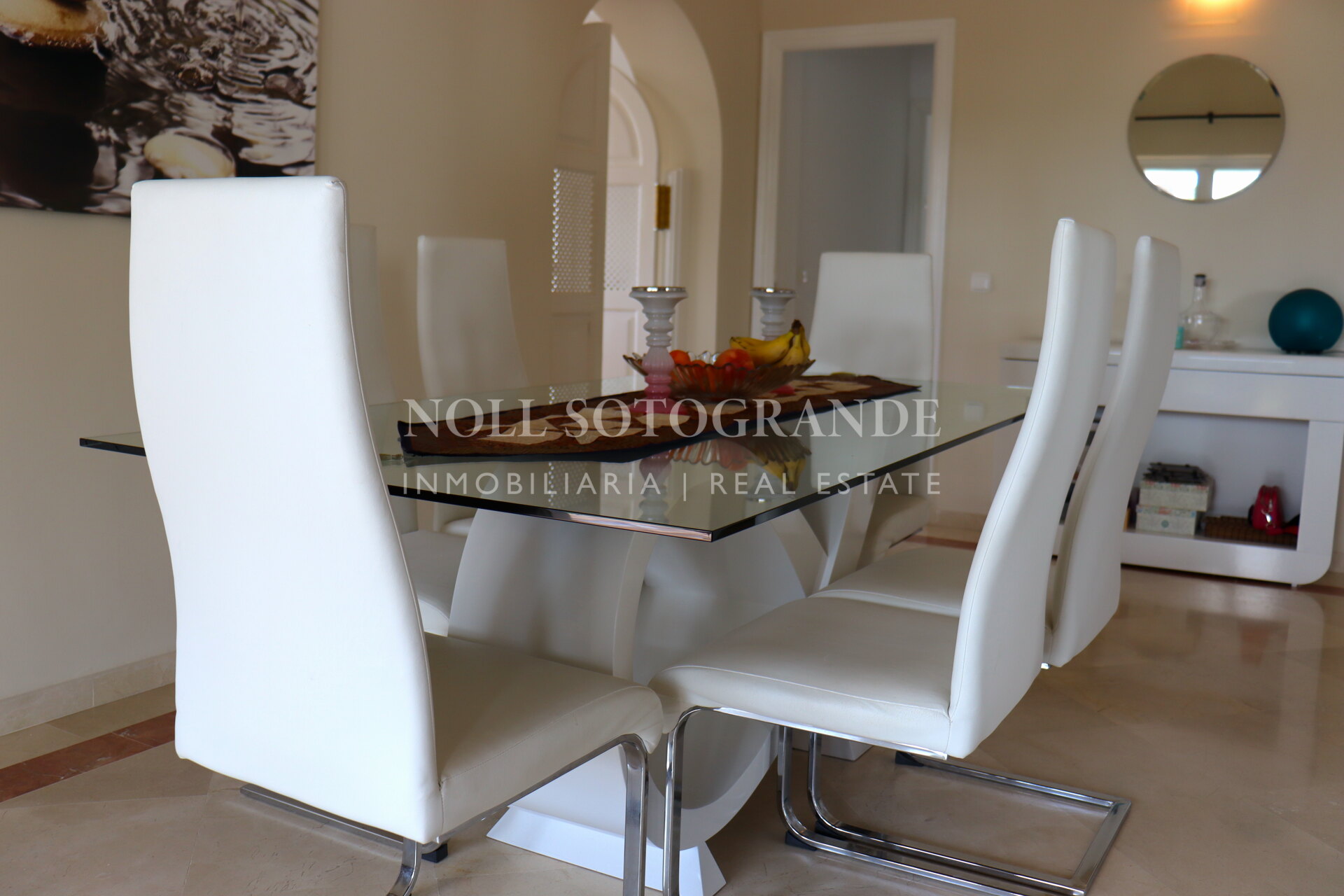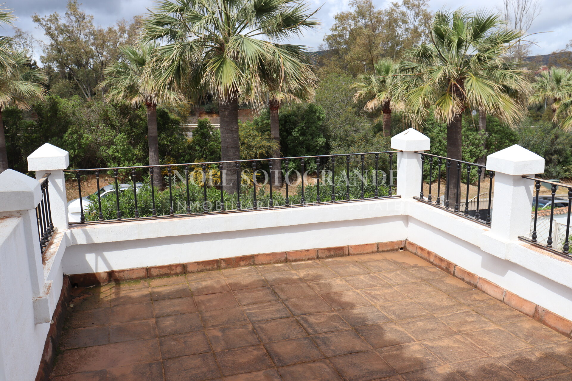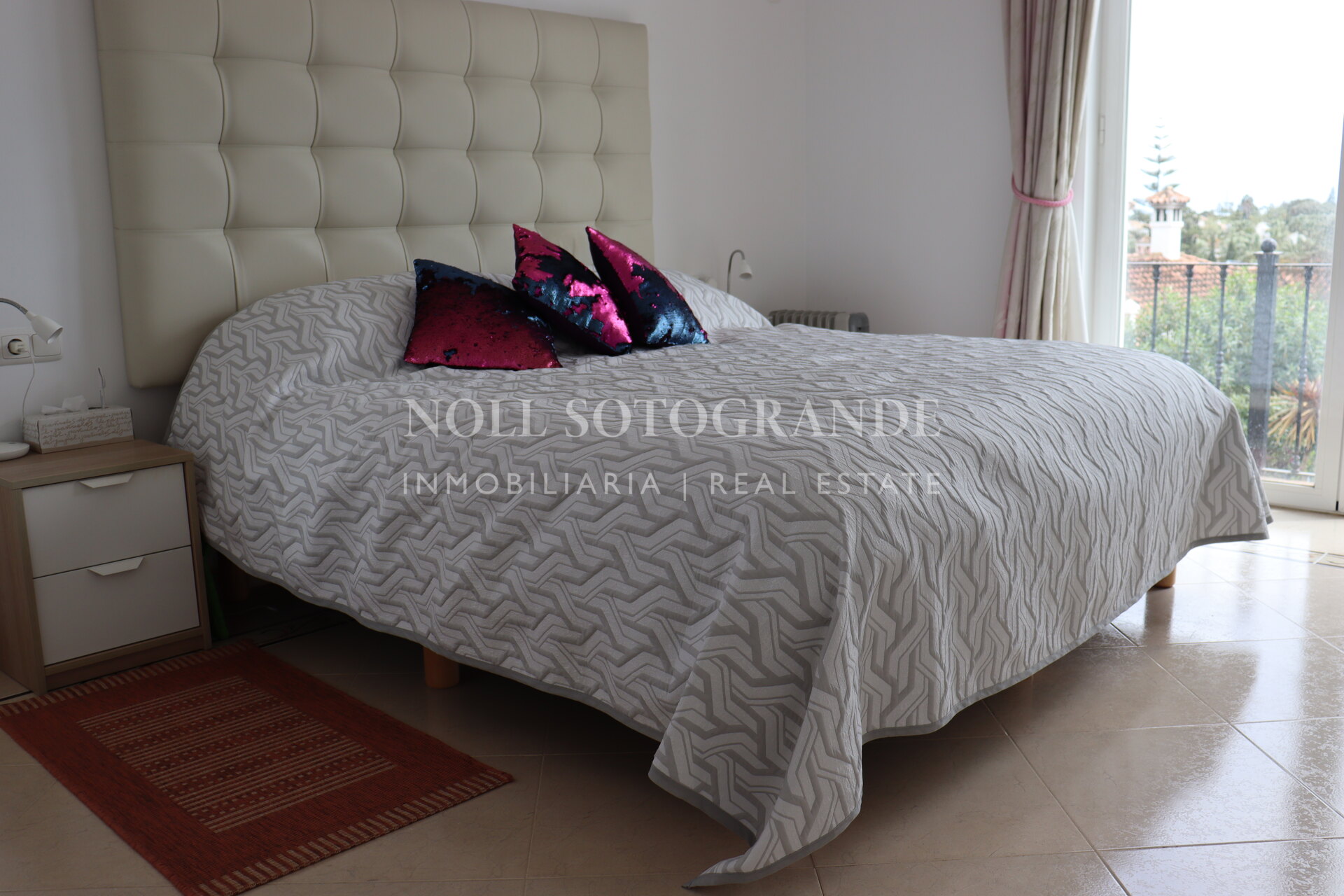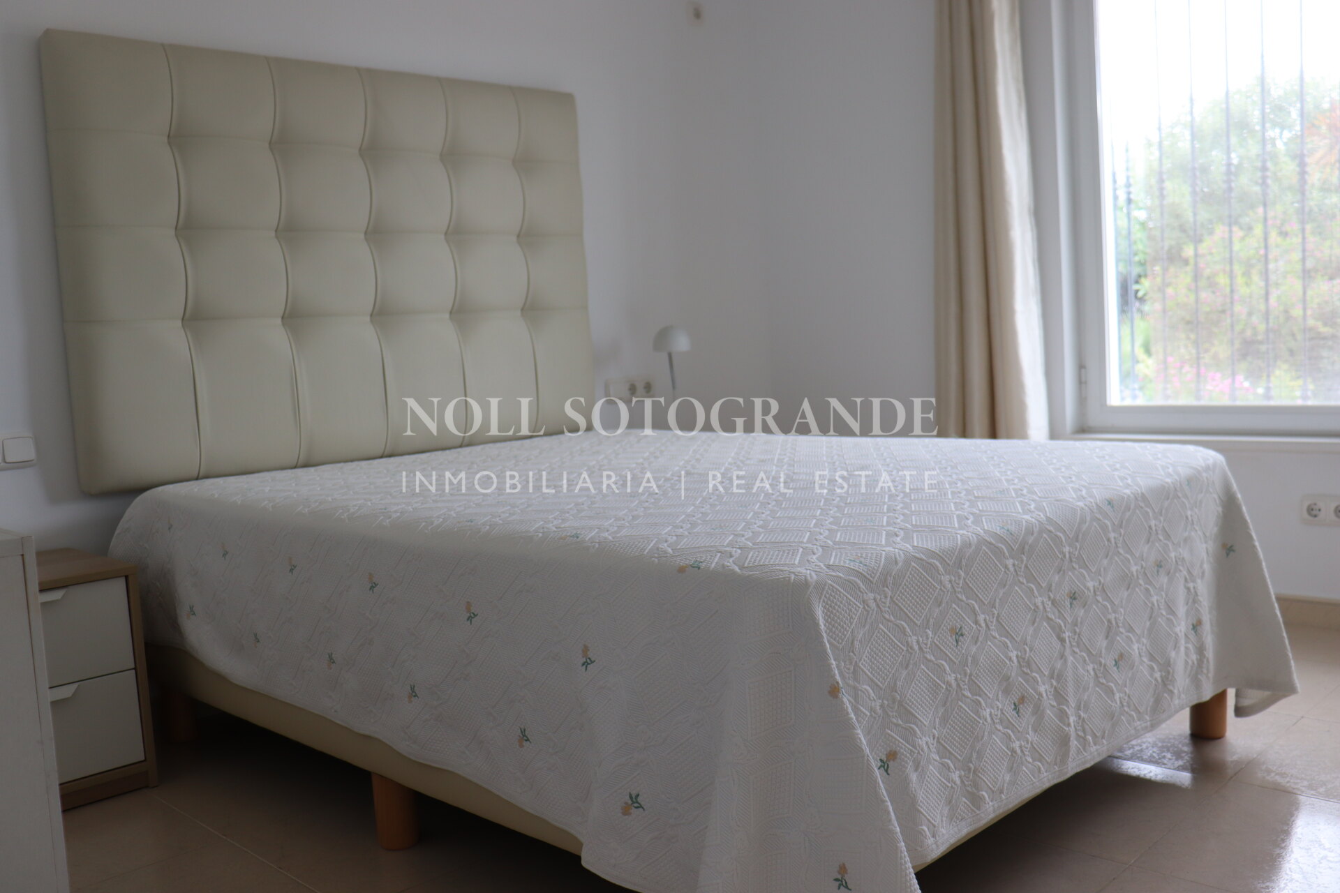 Cozy house in Sotogrande Costa available for holiday rental. The house has 4 bedrooms all with en-suite bathrooms. It is distributed on two floors: on the ground floor there is an entrance hall through the front courtyard, the living room, the dining room and the kitchen. The living room and dining room have access to the covered terrace, which is divided into a sitting area and a summer dining room with a wonderful barbecue. On the ground floor there are also three bedrooms with three bathrooms en suite. Upstairs is the master bedroom with ensuite bathroom and a terrace.