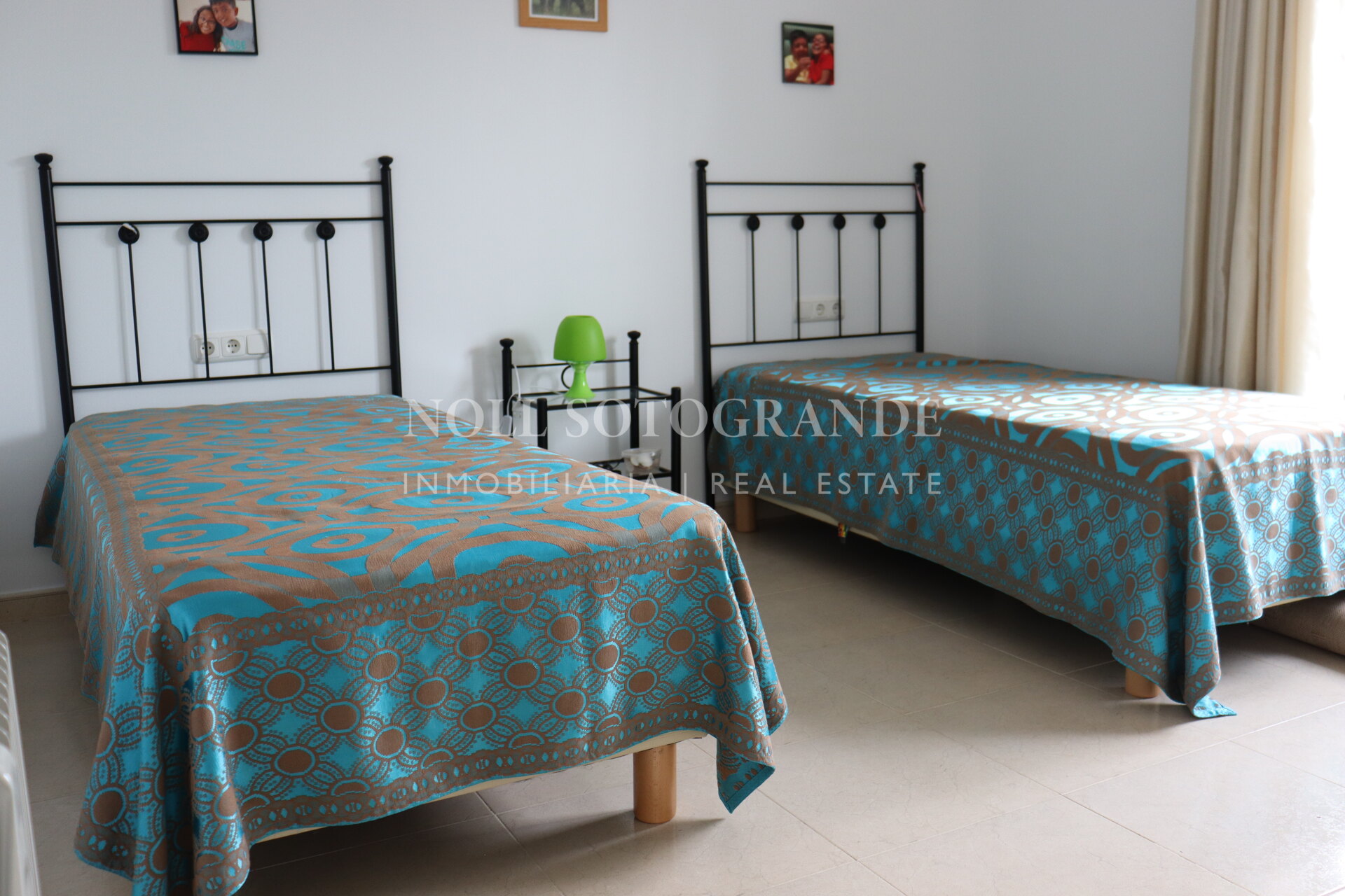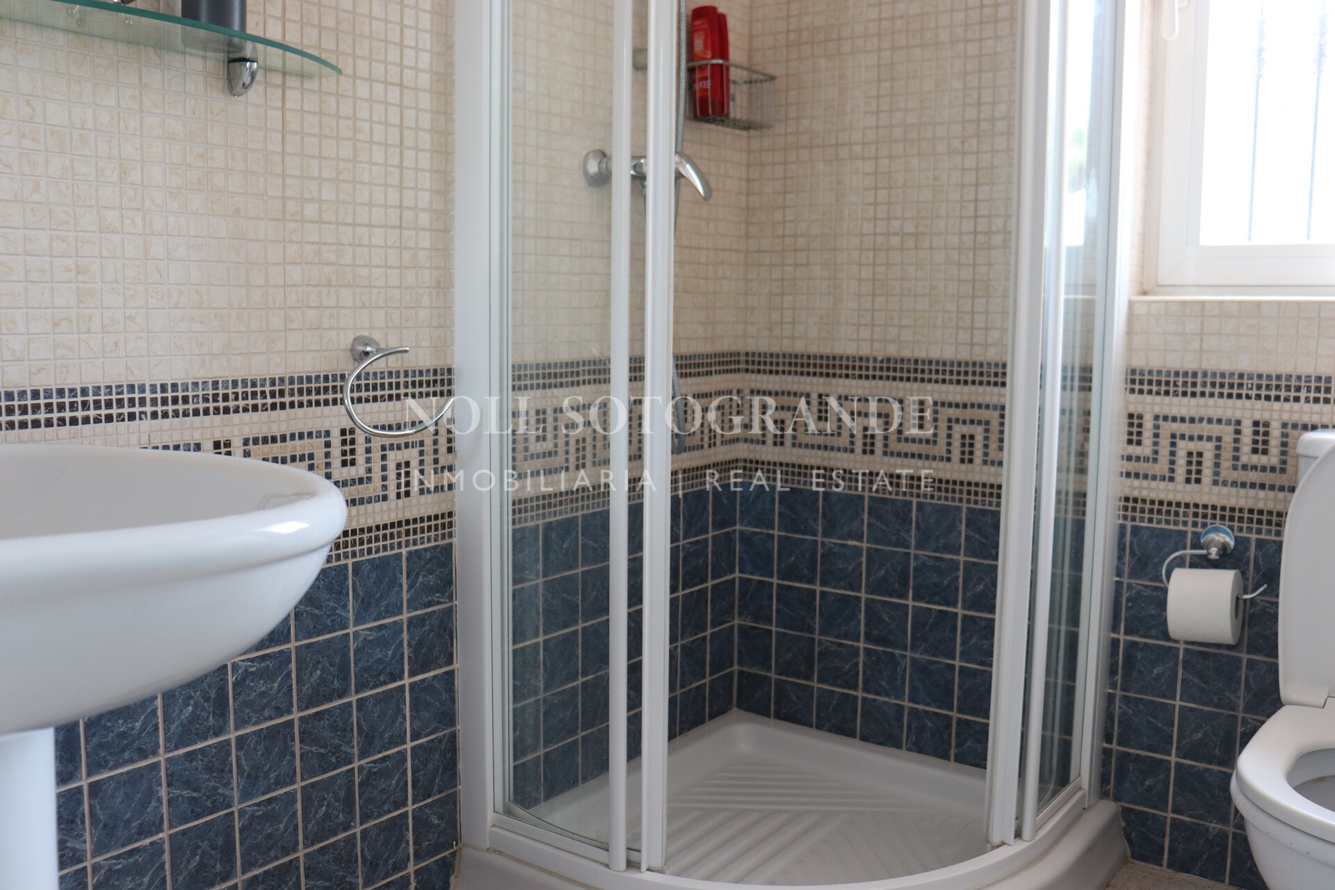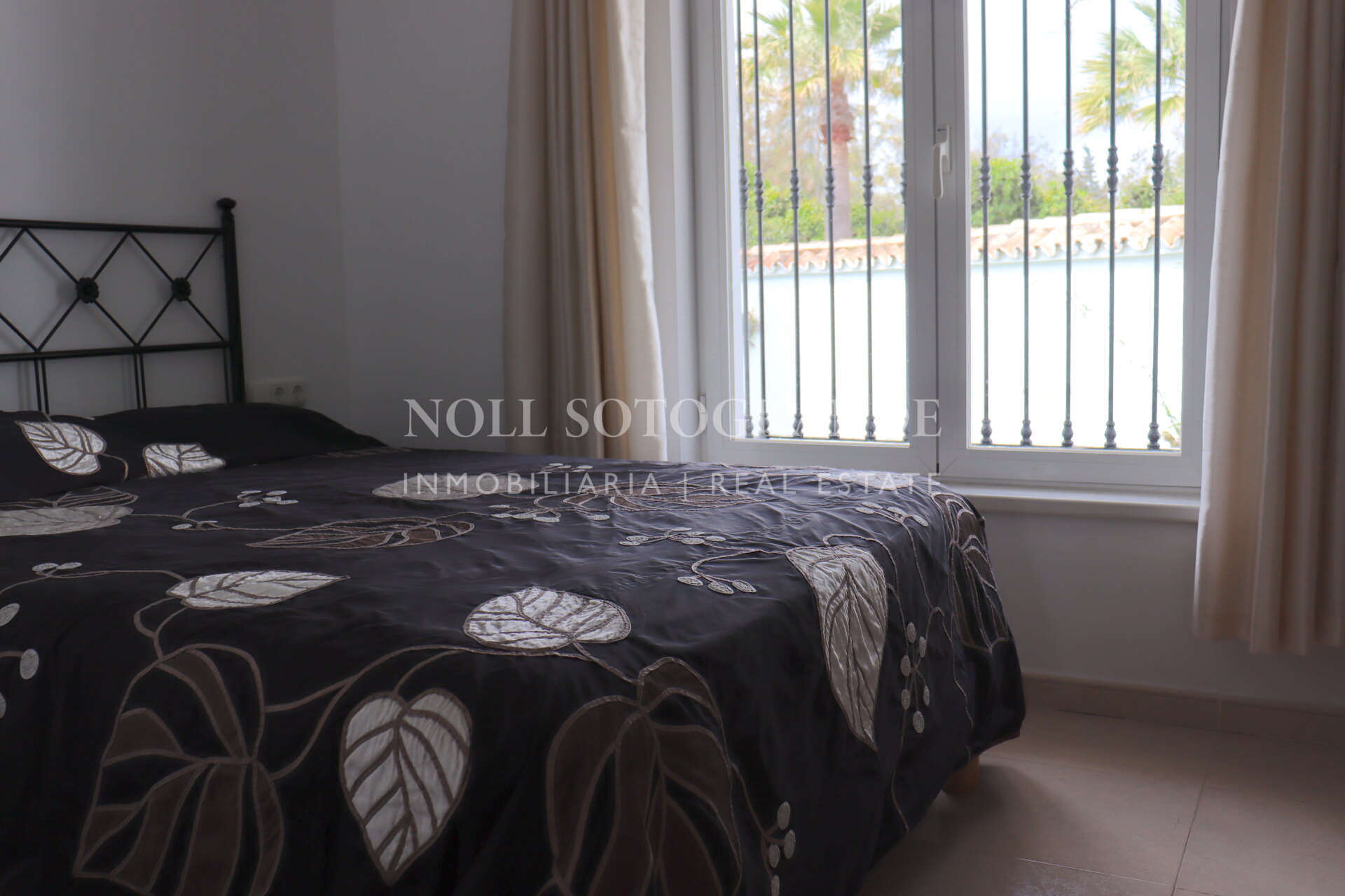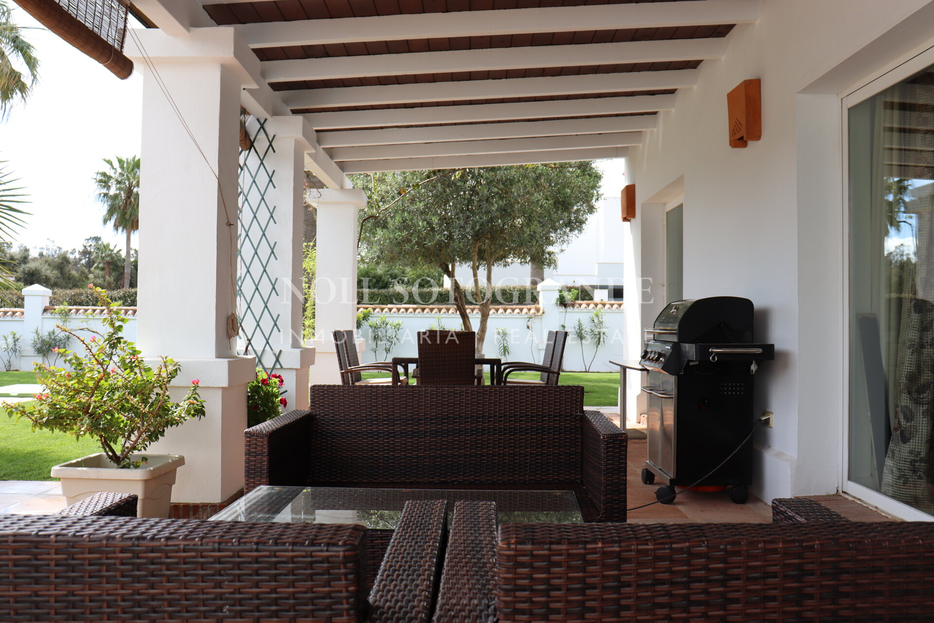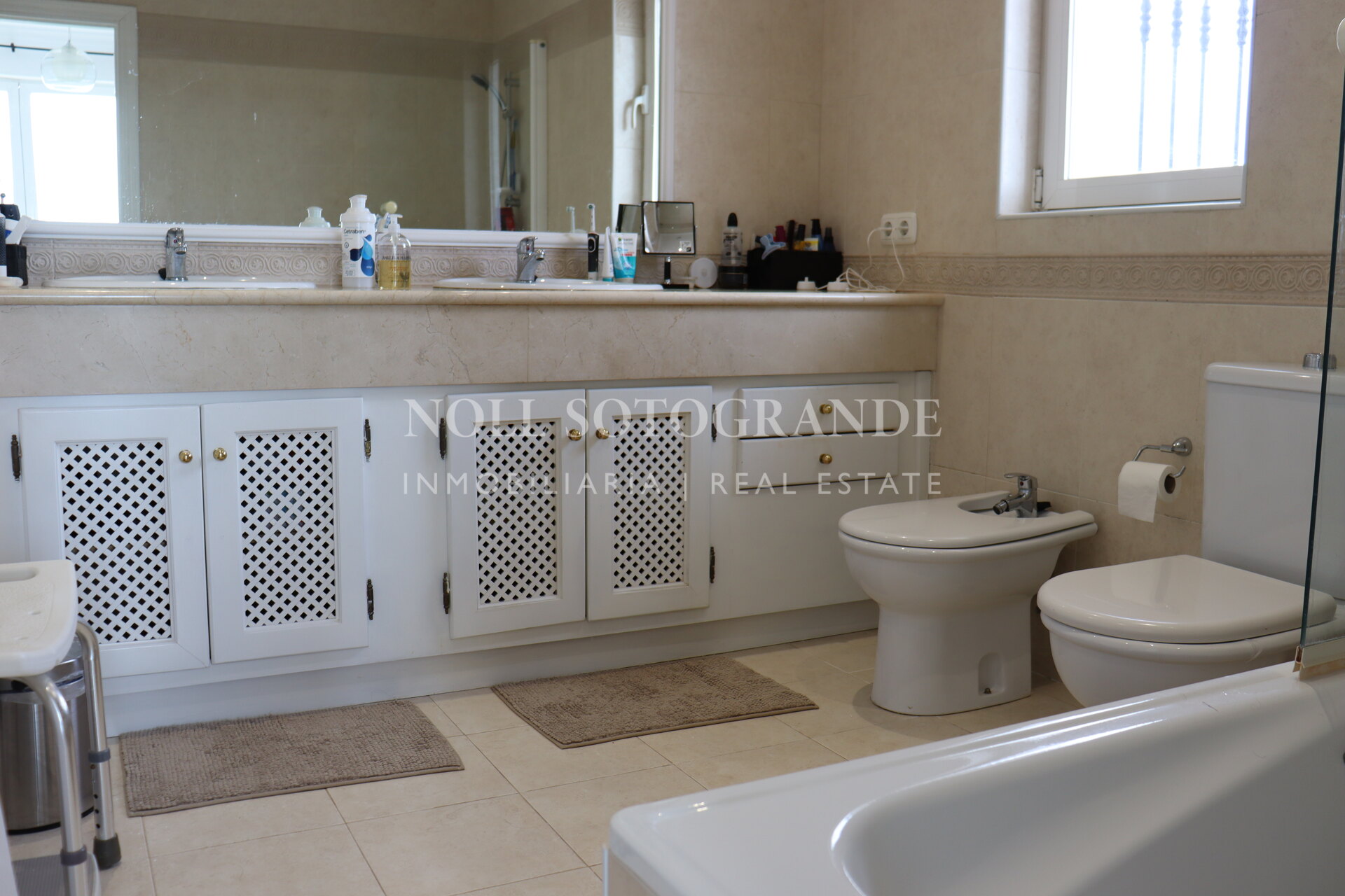 Cozy house in Sotogrande Costa available for holiday rental. The house has 4 bedrooms all with en-suite bathrooms. It is distributed on two floors: on the ground floor there is an entrance hall through the front courtyard, the living room, the dining room and the kitchen. The living room and dining room have access to the covered terrace, which is divided into a sitting area and a summer dining room with a wonderful barbecue. On the ground floor there are also three bedrooms with three bathrooms en suite. Upstairs is the master bedroom with ensuite bathroom and a terrace.