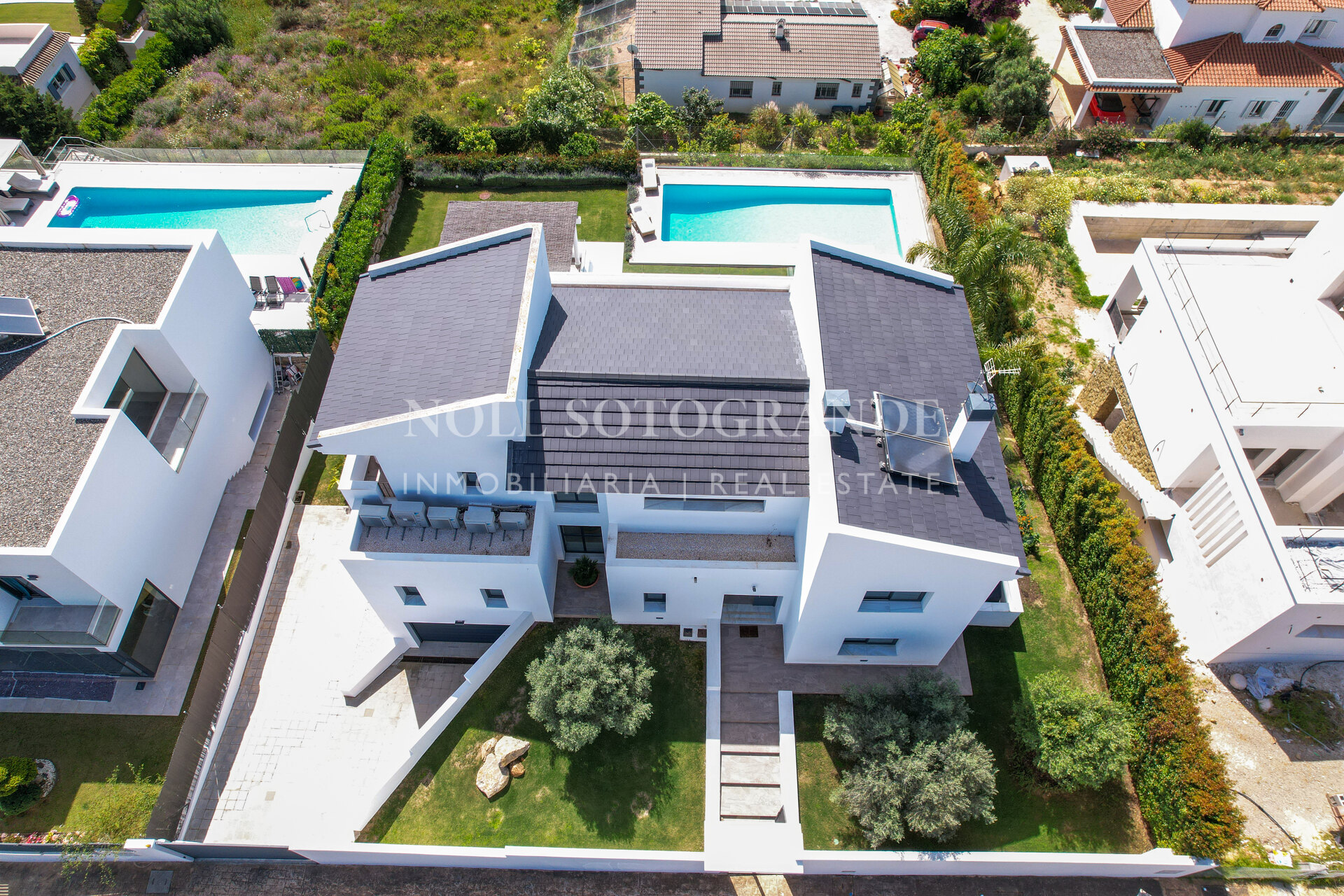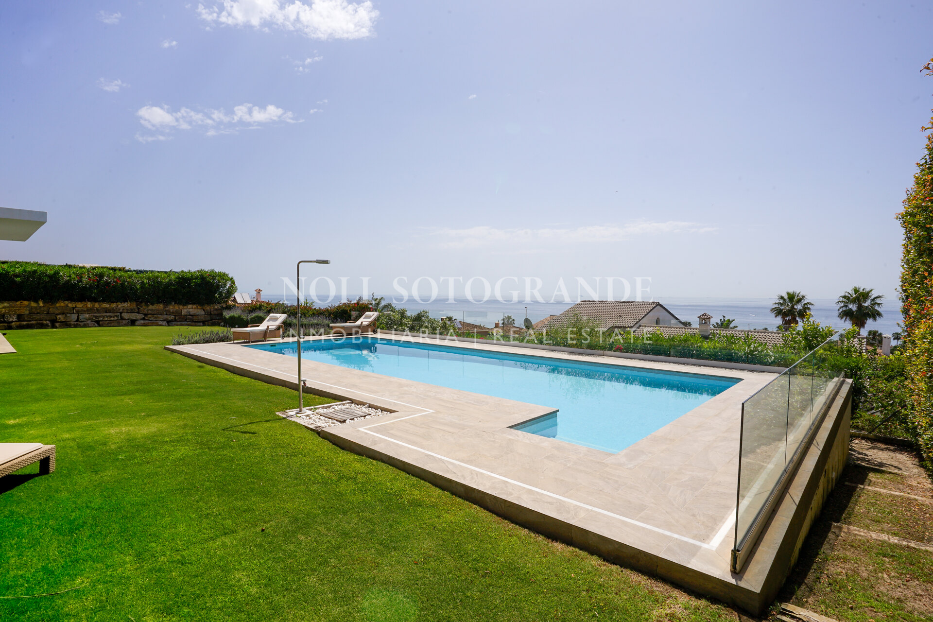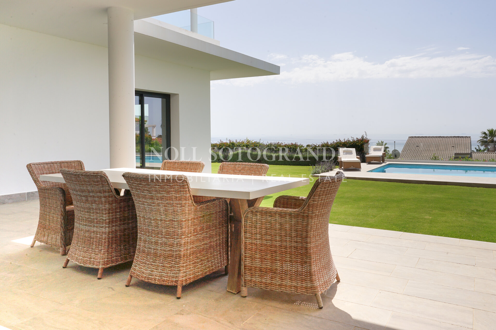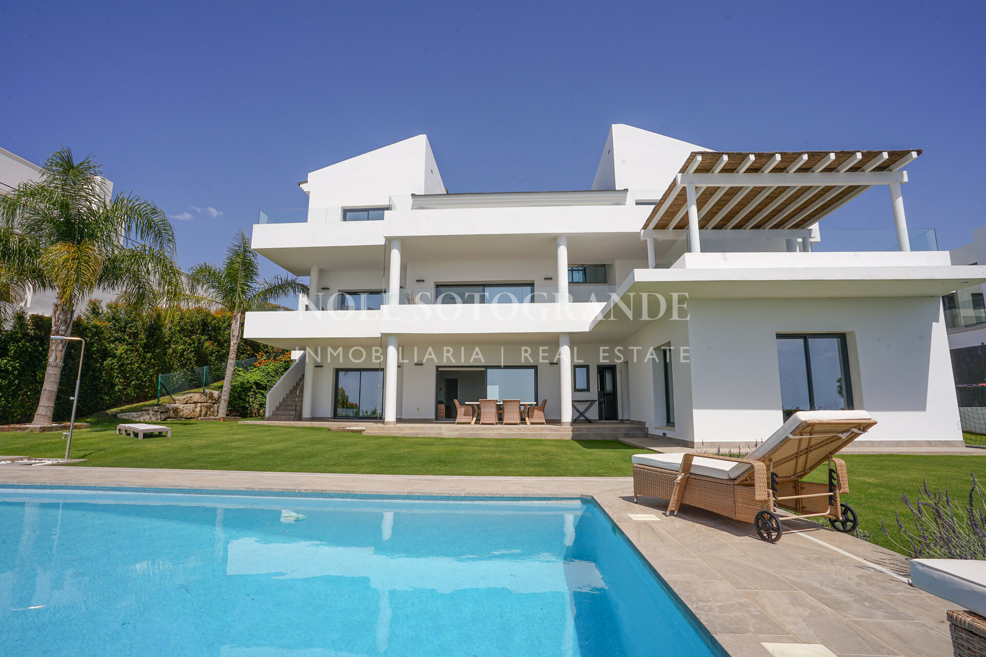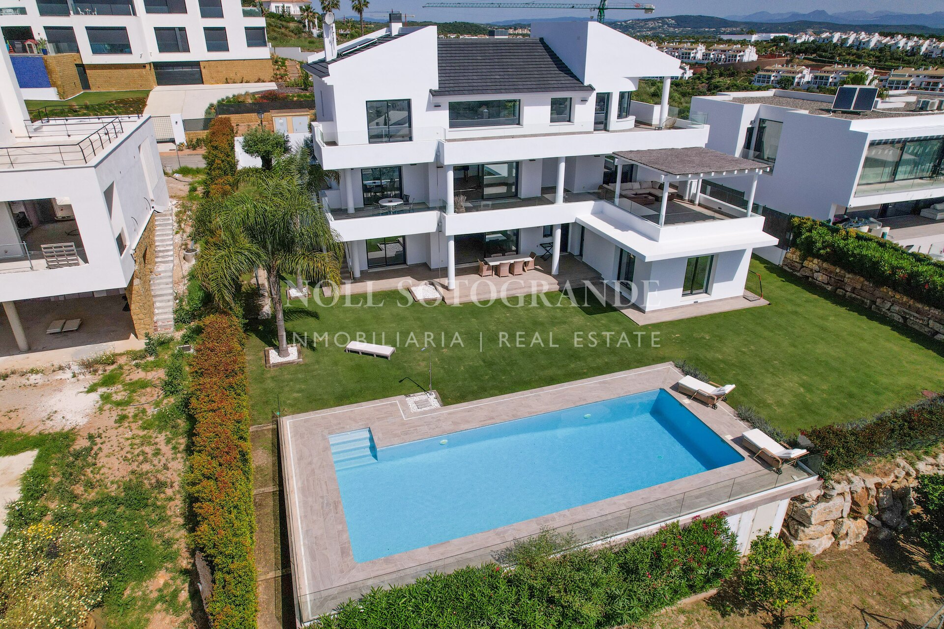 Modern villa with panoramic sea views located in the elevated area of La Alcaidesa, close to Sotogrande and surrounded by several well-known golf courses. The house was completed in 2020 and sits on an elevated plot overlooking the Mediterranean, the Links Golf Course, the beach, Gibraltar and the North African coastline.