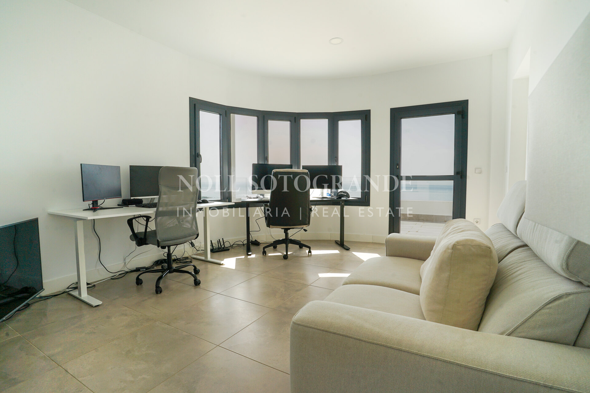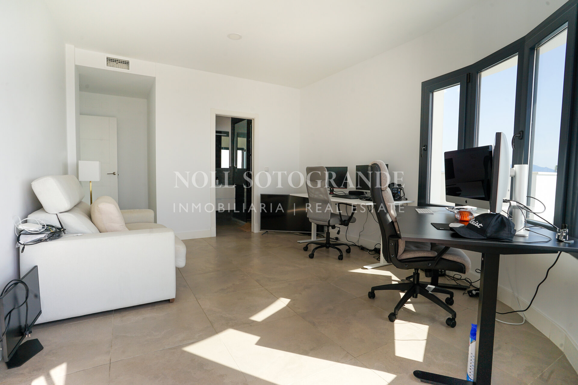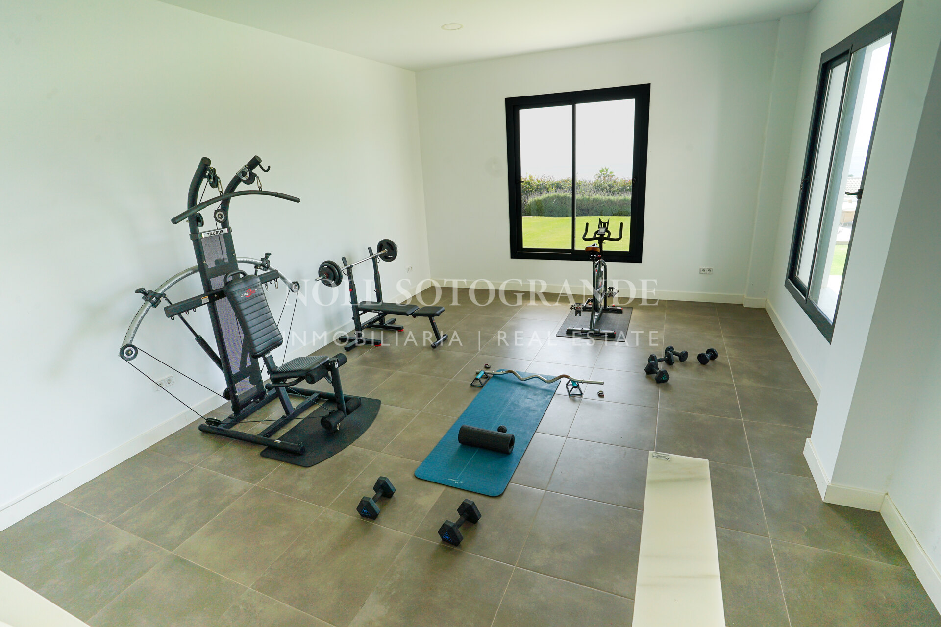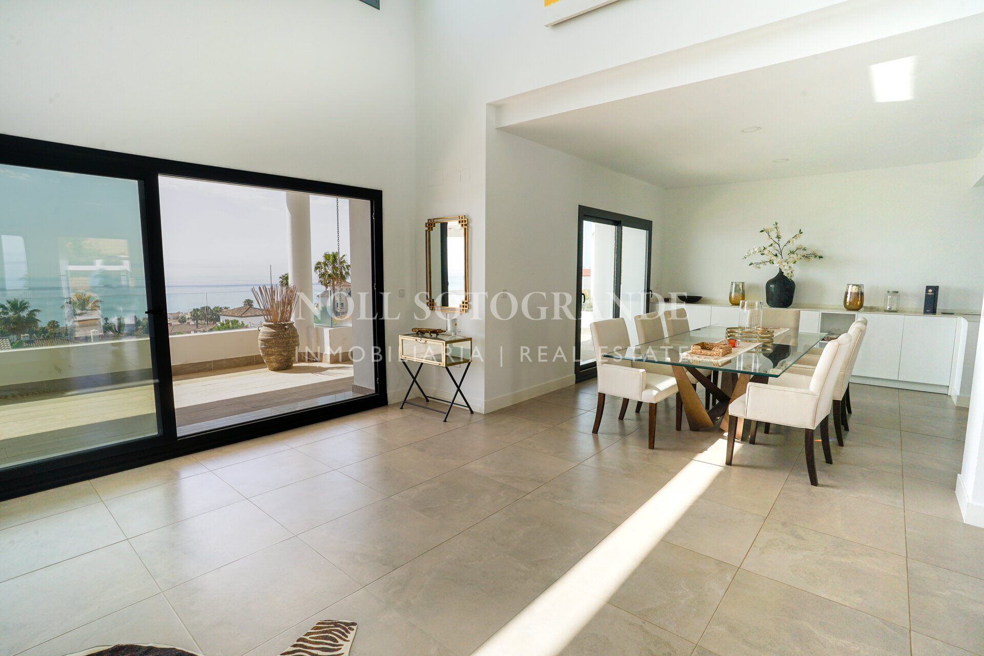 The property offers approximately 500 m² built and is distributed across several levels designed to maximise natural light and views. The villa includes four bedrooms, three with en-suite bathrooms, plus a private office that can be converted into a fifth bedroom with its own bathroom if required. The main living area consists of a spacious open-plan living and dining room with large sliding glass doors connecting to the covered terraces. The kitchen is fully equipped with high-end appliances and provides direct access to the outdoor barbecue area. A separate TV room, private gym and steam room are also part of the layout.
