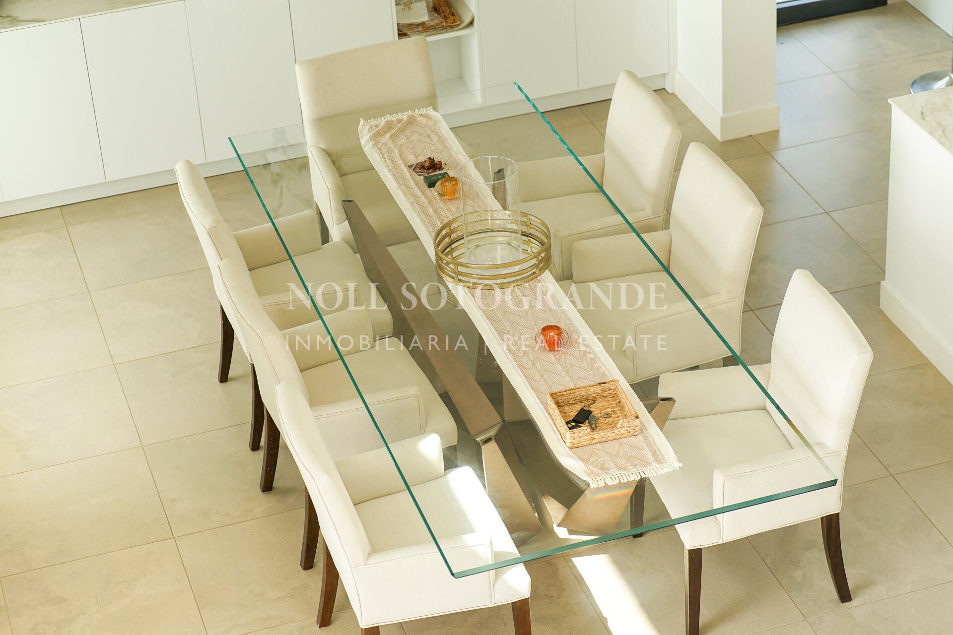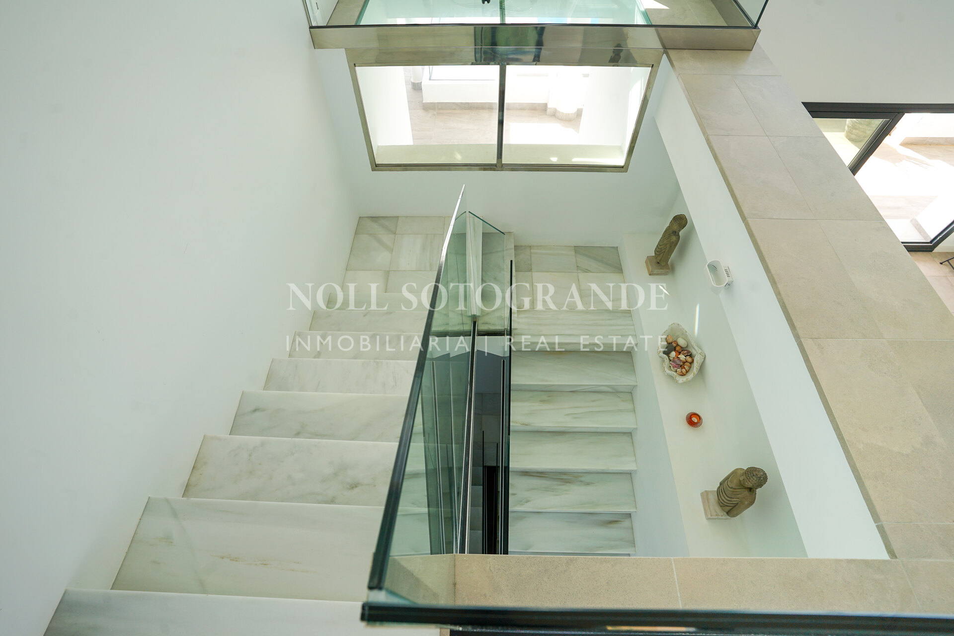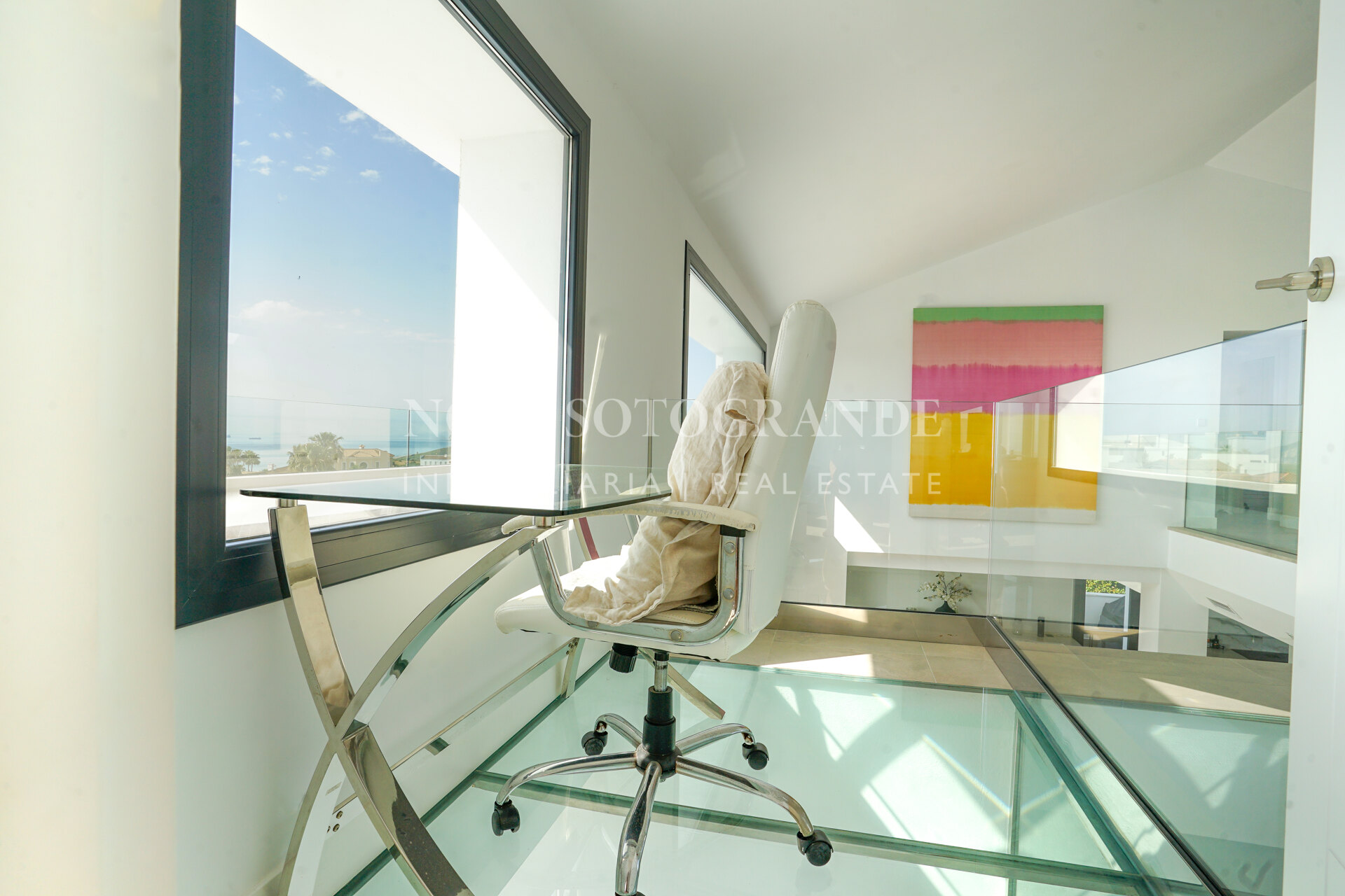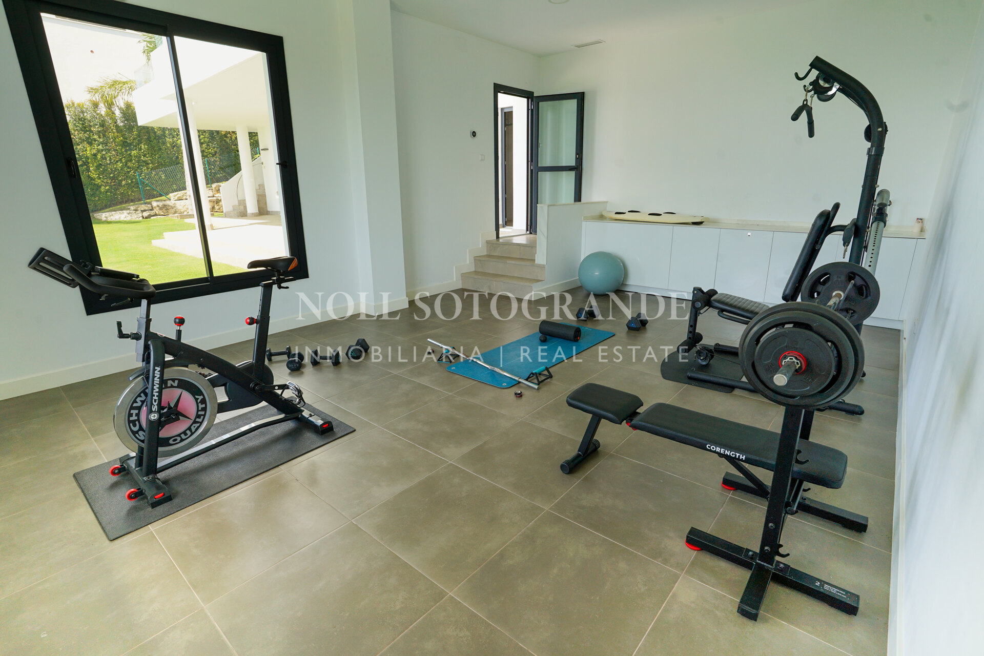 The property offers approximately 500 m² built and is distributed across several levels designed to maximise natural light and views. The villa includes four bedrooms, three with en-suite bathrooms, plus a private office that can be converted into a fifth bedroom with its own bathroom if required. The main living area consists of a spacious open-plan living and dining room with large sliding glass doors connecting to the covered terraces. The kitchen is fully equipped with high-end appliances and provides direct access to the outdoor barbecue area. A separate TV room, private gym and steam room are also part of the layout.