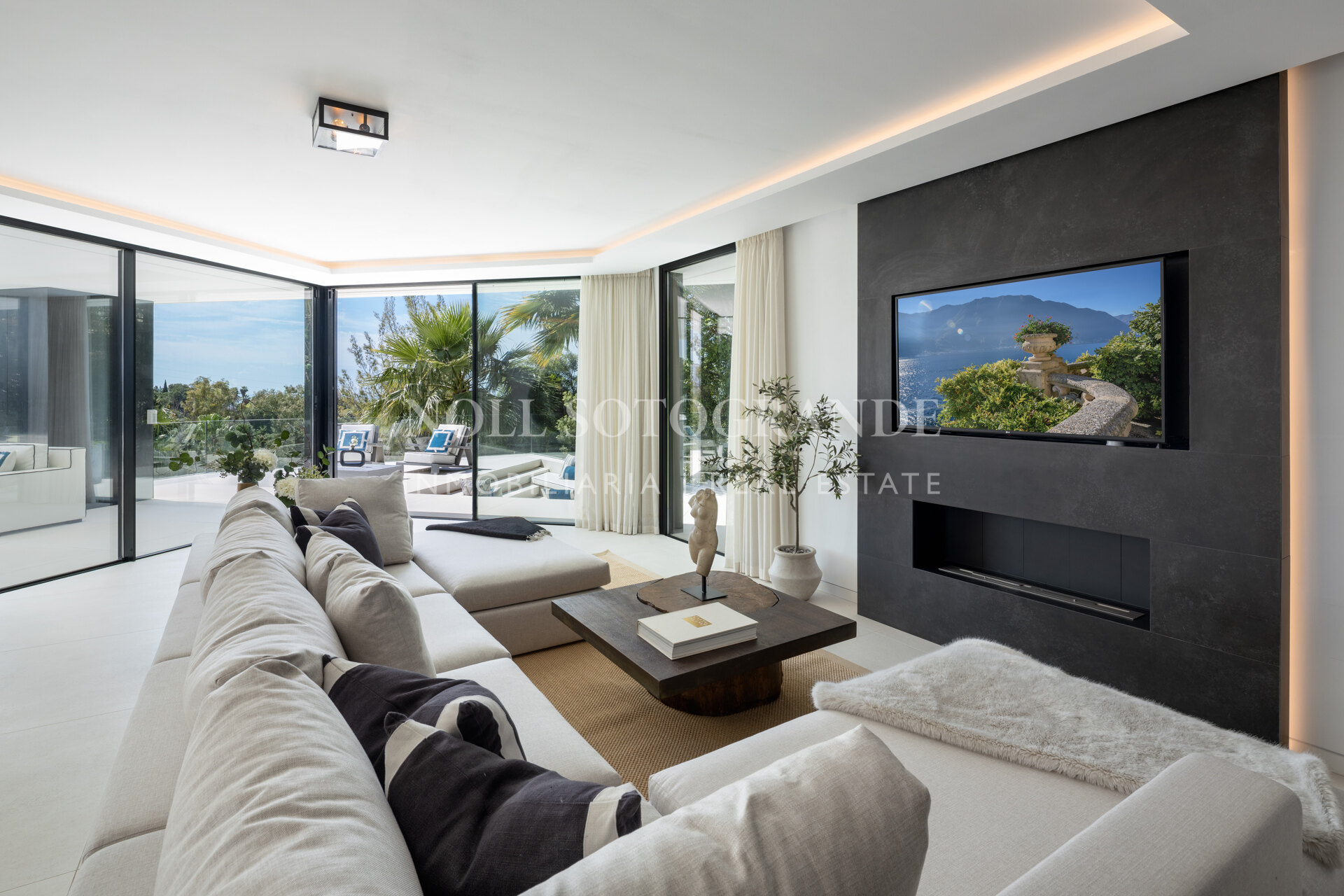 Designed by the renowned architect Antonio Morillo and fully refurbished in 2020, the villa spans 3 levels, offering open-plan living areas full of natural light and providing seamless transitions between indoor and outdoor spaces, with large windows framing unobstructed sea views. Five spacious bedrooms and eight bathrooms, including six en-suite bathrooms and two additional guest toilets. Each room is adorned with bespoke furniture by Omeo Design, creating a cohesive and elegant aesthetic throughout the home. The kitchen is equipped with high-end Snaidero cabinetry, a brand associated with Ferrari designer Paolo Pininfarina, and designed in collaboration with Omeo Design. The lower level includes a cinema room and a custom-built wine cellar. The sculpted terrace leading to an infinity-edge saltwater pool, a jacuzzi, and a chill-out area with a fire pit, and the landscaped garden is equipped with an automatic irrigation system. Other features: home automation system, water-based underfloor heating throughout, solar panels, fireplace in the main living area, 2-car garage.