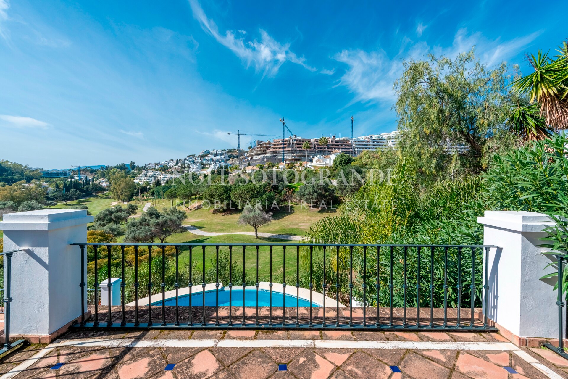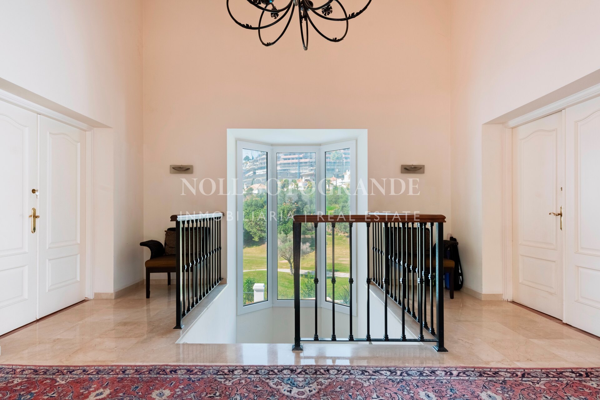 Accessed from street level, the front door leads to a generous entrance hall and a bright living room with vaulted ceiling, fireplace and sliding glass doors framing the incredible views and inviting to the outdoors. The adjacent kitchen offers strong potential for an open-plan layout, and enjoys its own small south-facing terrace for sunny breakfasts. The covered rear porch runs the length of the villa, creating a superb setting for dining and relaxation with elevated views. The master bedroom suite, also enjoying fabulous golf views, and a guest toilet, complete this floor.