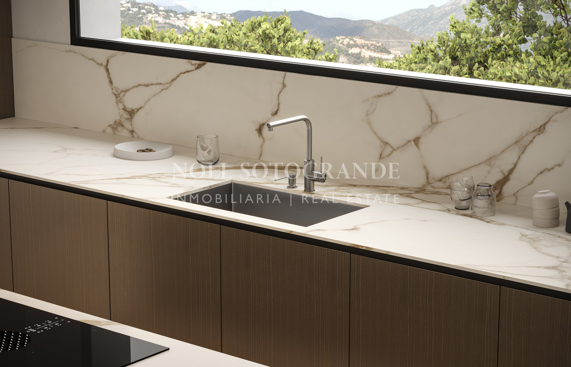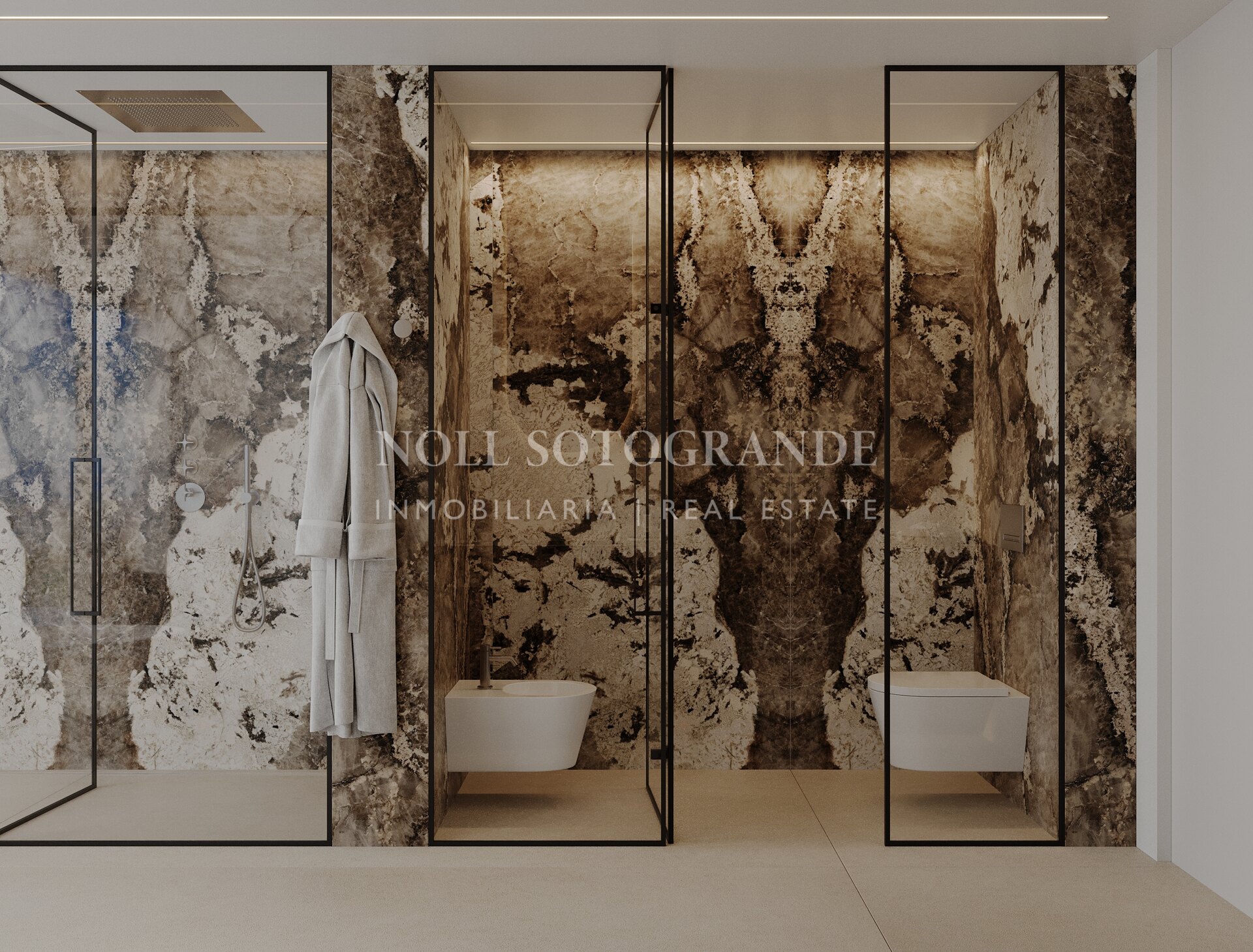 The impressive architectural and interior decoration designed homes will sit within a secure, gated complex at the highest point of the urbanisation, a quiet spot surrounded by nature and offering panoramic views to the bay of Marbella and the Mediterranean Sea and only 10/15minutes from Puerto Banus.