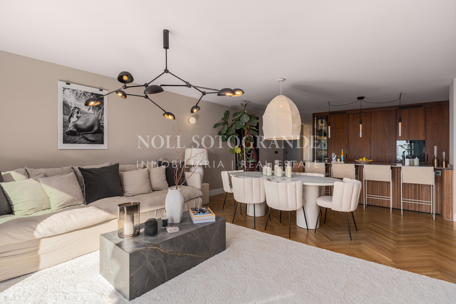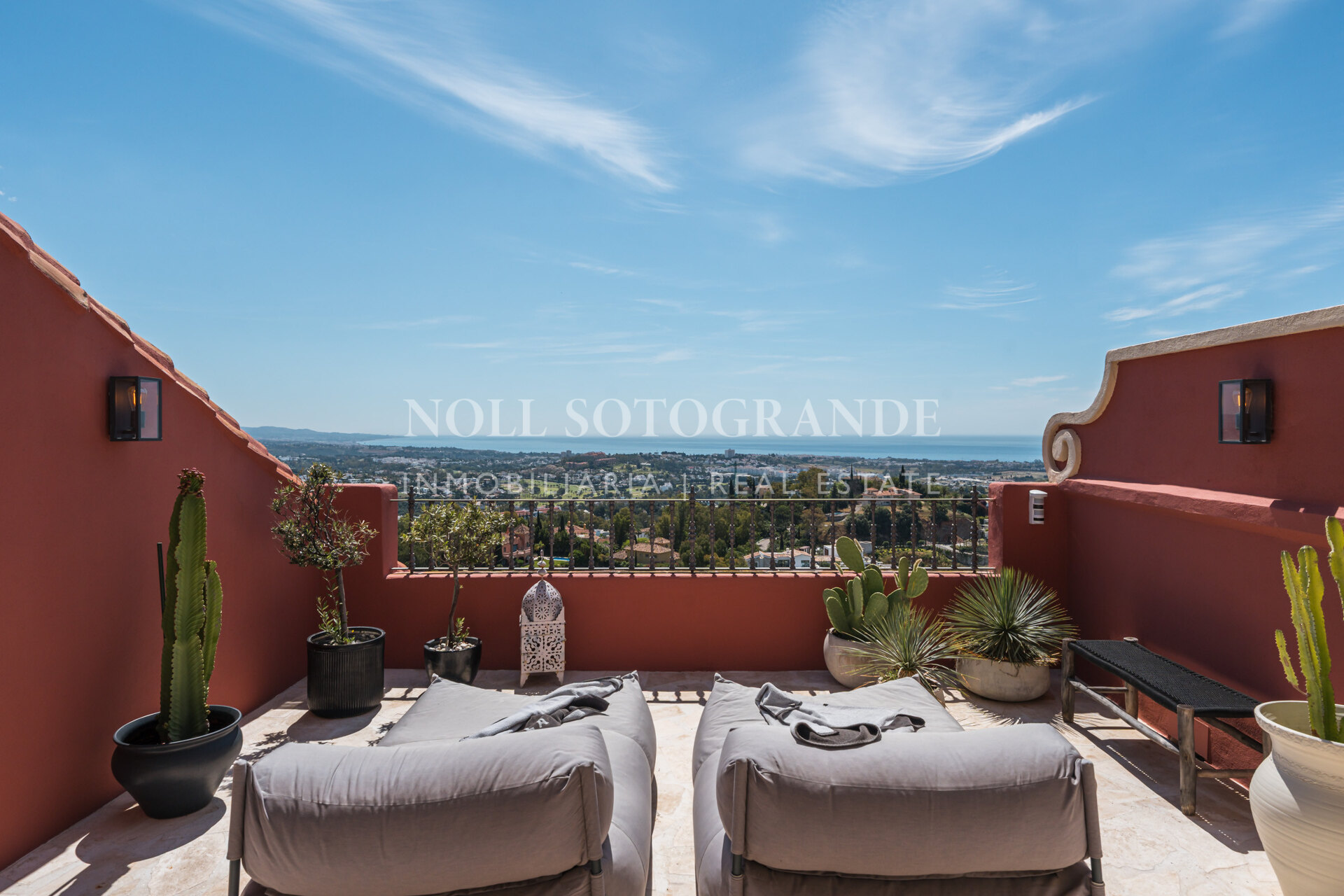 Sophisticated 3-bedroom duplex penthouse boasting stunning panoramic sea, golf and mountain views in Torre Halcones, Benahavis, a 10 min. drive from San Pedro, Nueva Andalucia´s Golf Valley and the beach. Meticulously renovated to a high specification and interior design which emphasizes natural light, openness, elegance and warmth, supported by a south orientation.