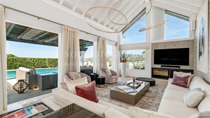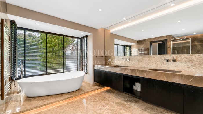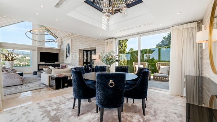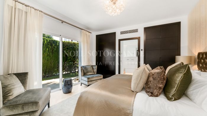 Distributed over 3 floors, accommodation comprises, on the entrance level: grand hallway featuring a double-height ceiling, bright living/dining room with floor-to-ceiling windows leading to the expansive covered terrace and private pool area —ideal for outdoor entertaining and relaxation; modern kitchen with Meile , three generous bedrooms, each with access to private terraces and two of them with en suite bathrooms, plus a separate full bathroom. Upstairs, the luxurious master suite includes a large bedroom, walk-in wardrobe, elegant en-suite bathroom, and a private terrace with spectacular sea and golf views towards Gibraltar and Northern Africa coast. On the lower level, a self-contained guest apartment—with separate garden entrance, including a bedroom and en-suite bathroom —offers complete privacy and convenience for visitors.