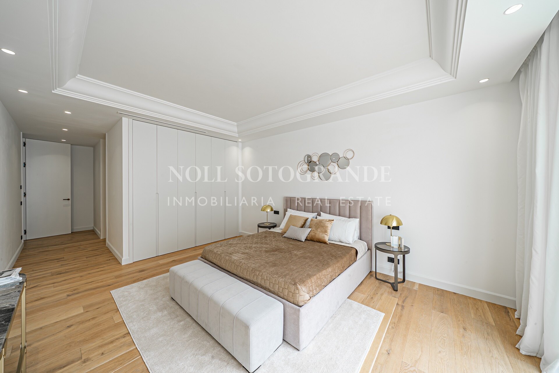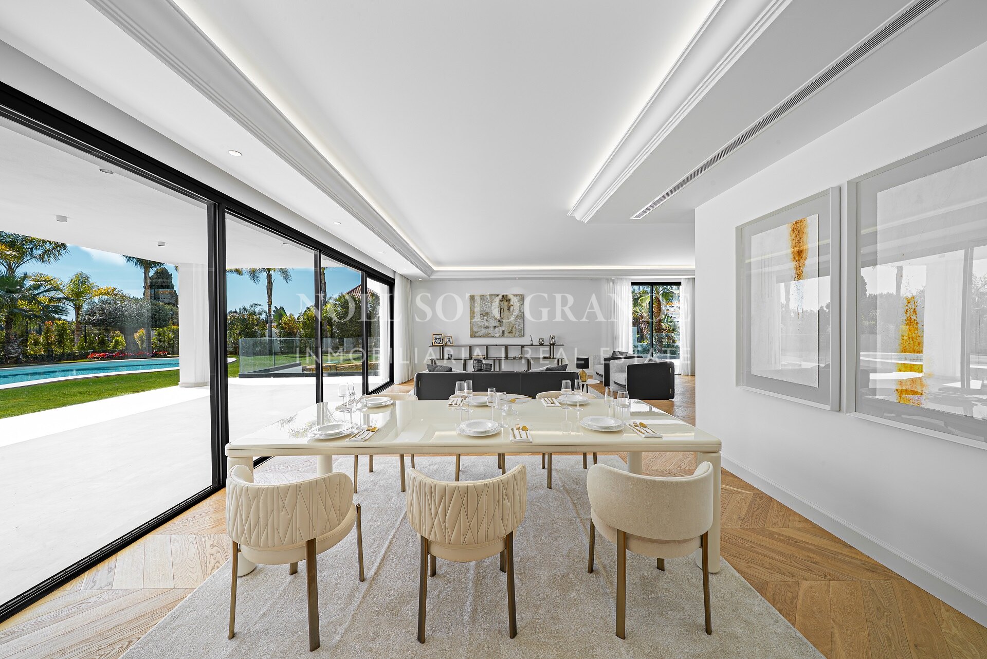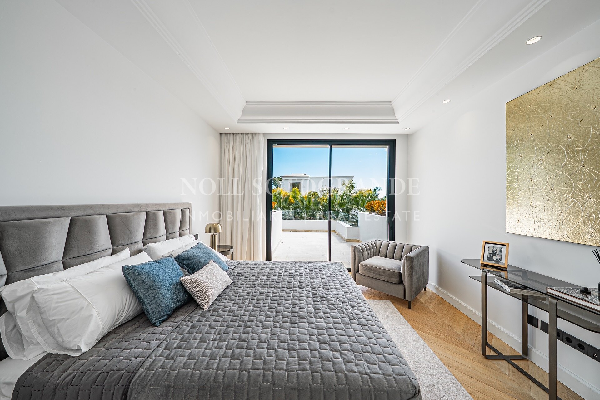 Entering the villa there is a very spacious outdoor parking lot decorated with a water fountain that gives an elegant touch and character to the entrance. There is a garden that surrounds the villa with green areas and decorated with a variety of floral plants and palm trees that give colour and movement. The heated saltwater pool has both a covered and uncovered terrace and a stylish hammock area that invites you to enjoy the good weather of Marbella and also the privacy of the plot.