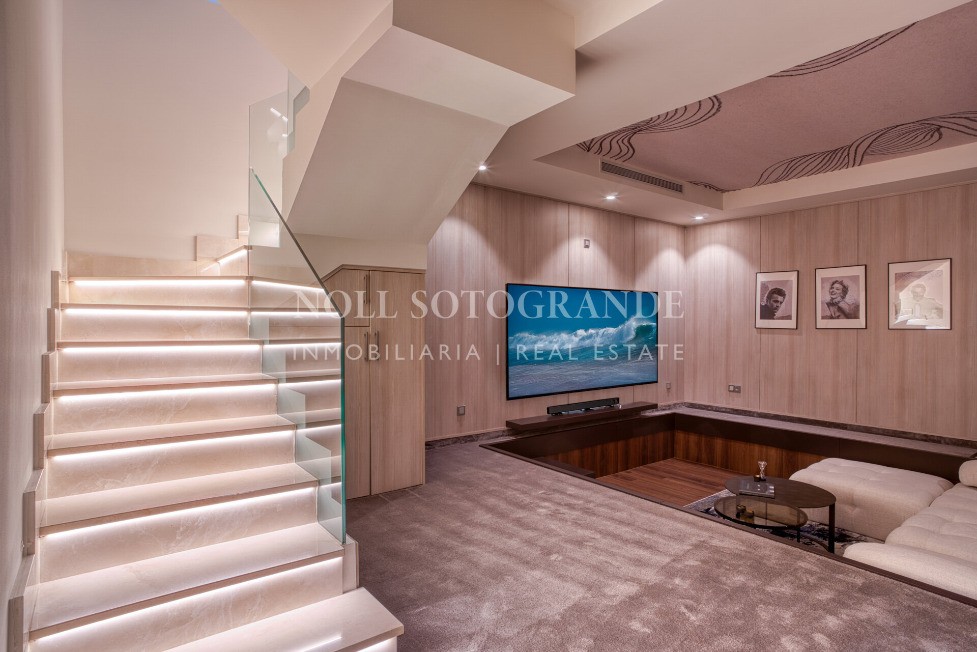 The lower-level leads to an additional bedroom, bathroom, laundry area and a unique cinema area with bar and a relaxing chill out area for entertaining. Other features include three private garage spaces, storeroom, hot and cold air conditioning and underfloor heating throughout and more.