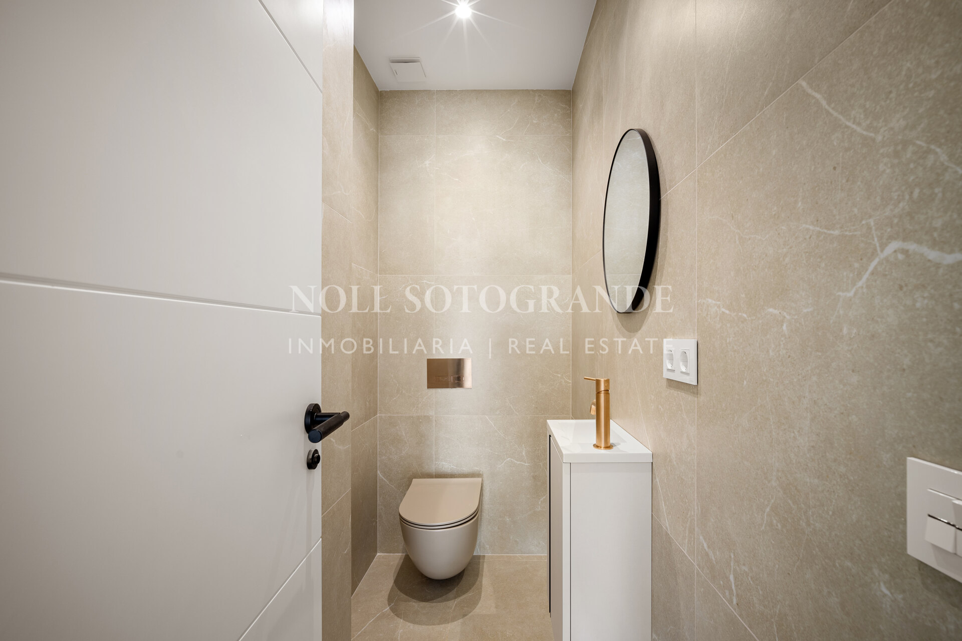 Accommodation comprises: open plan layout that combines a custom made kitchen with a large kitchen island, the dining area, the living room and a spacious mid-level terrace boasting sea and mountain views; guest bedroom with en-suite bathroom, laundry room and guest toilet. Stairs down lead to a second guest bedroom with separate bathroom, an office, and the master bedroom with a walk-in closet, private elegant bathroom plus two sliding doors with direct access to the lush garden level terrace. Spectacular rooftop solarium to enjoy all day sun, from sunrise to sunset and the stunning open sea and mountain views.