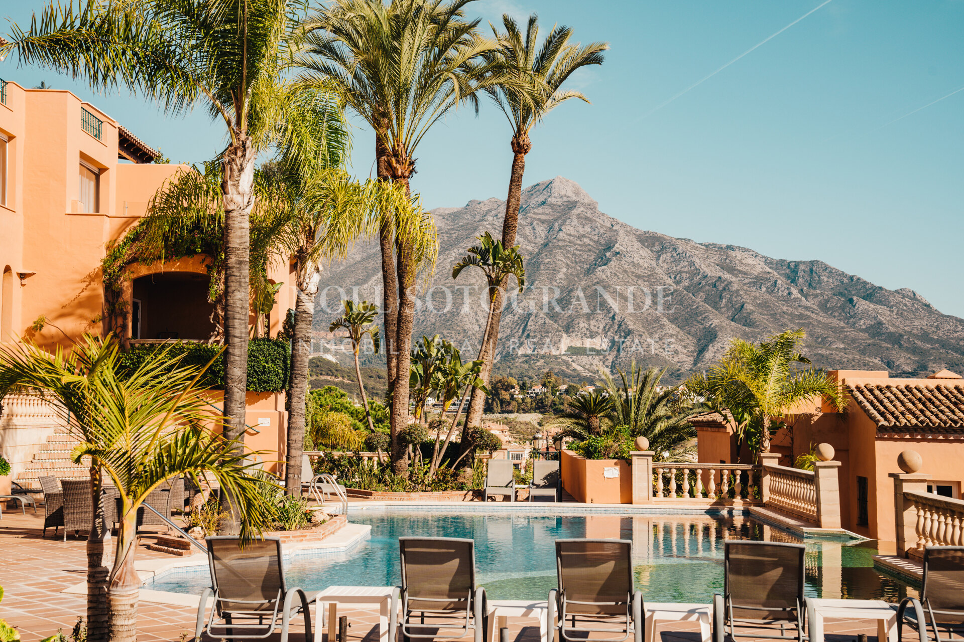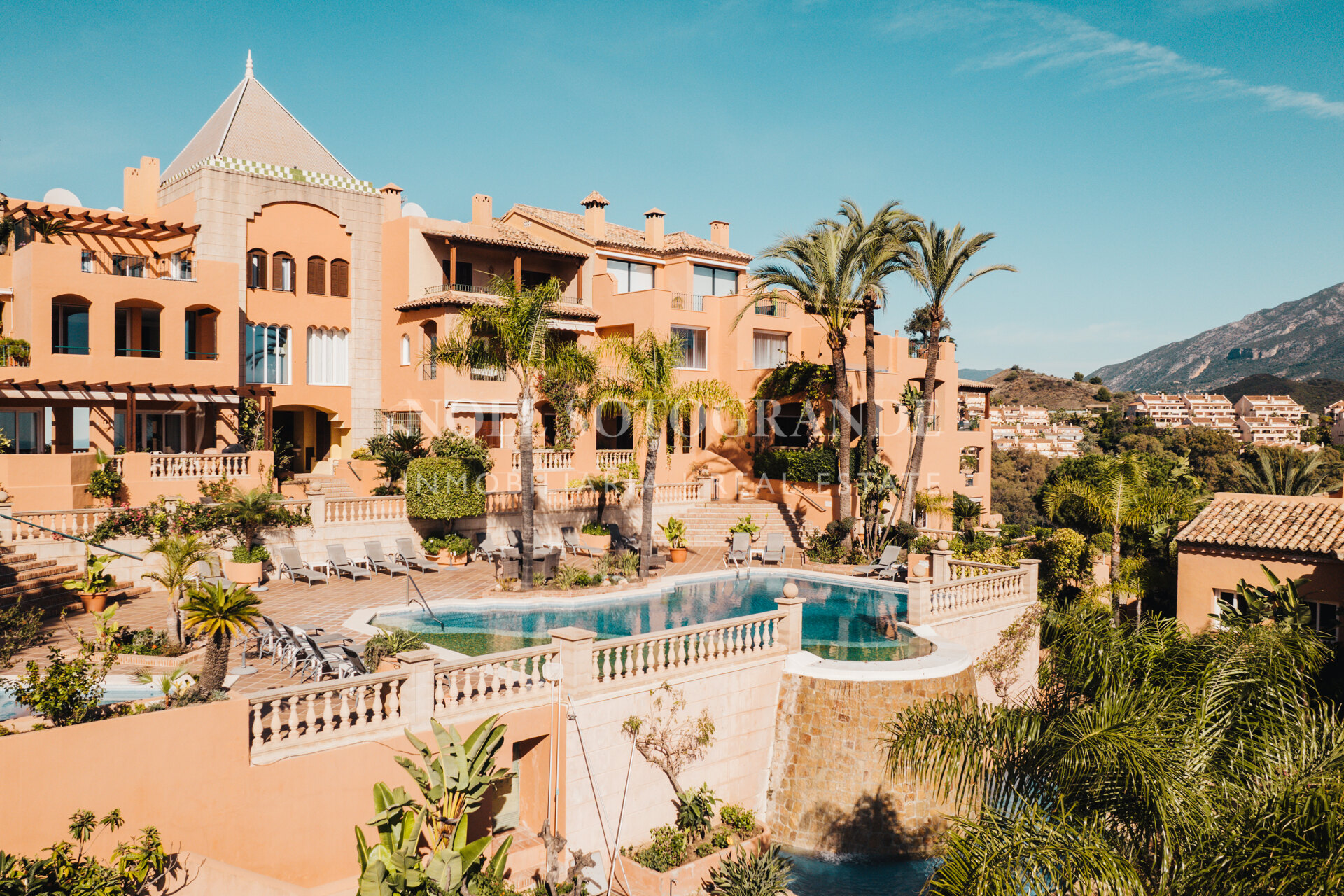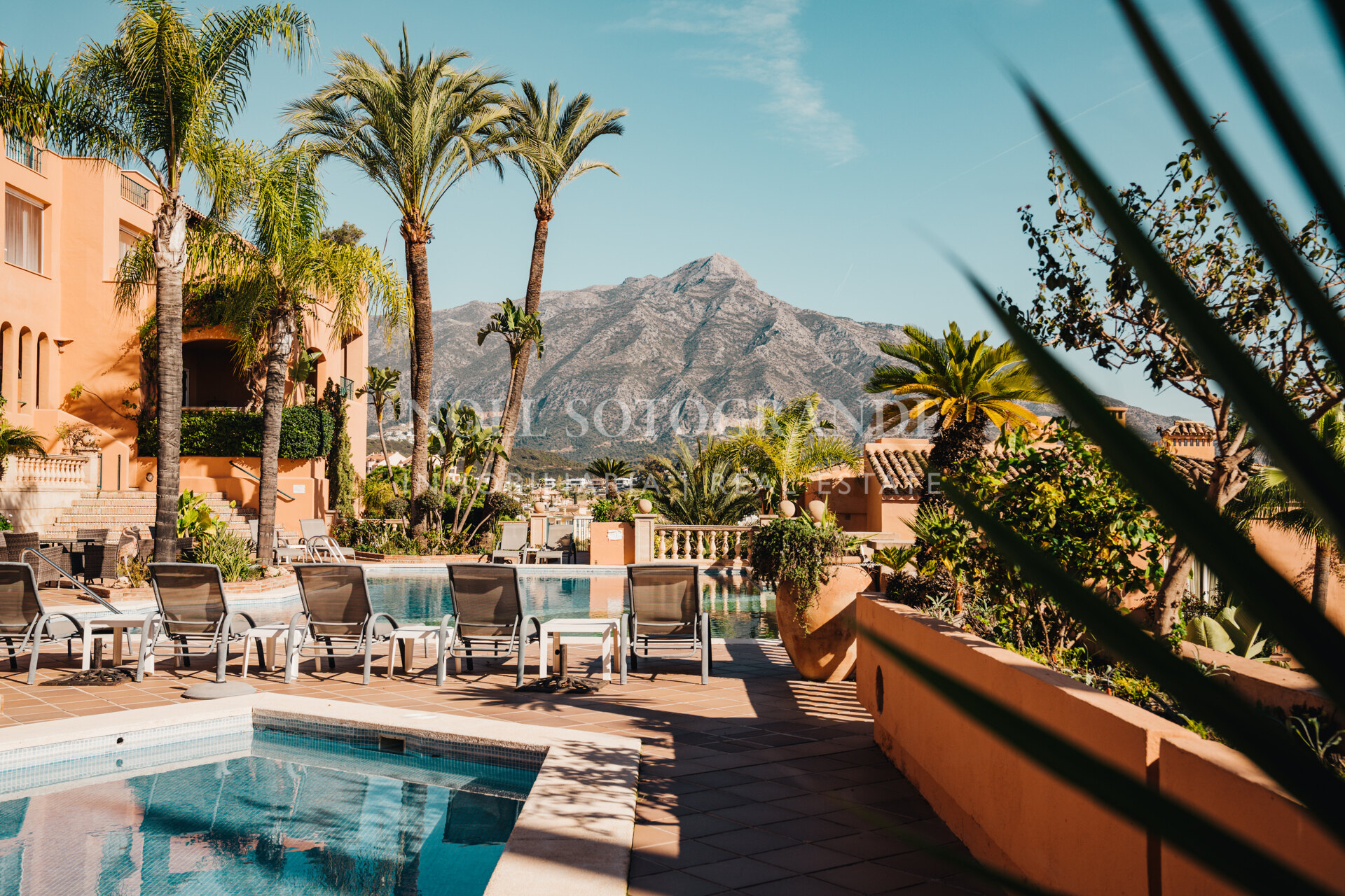 Elegant duplex penthouse in a Mediterranean style gated community in Nueva Andalucía, Marbella, surrounded by golf courses and only a 5-minute drive from Puerto Banús...