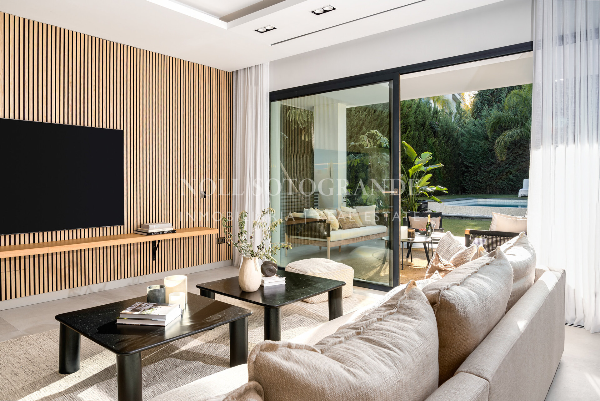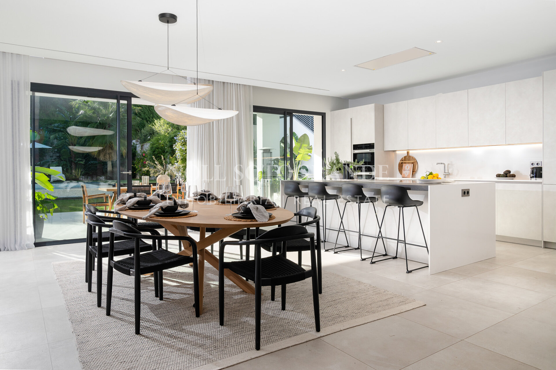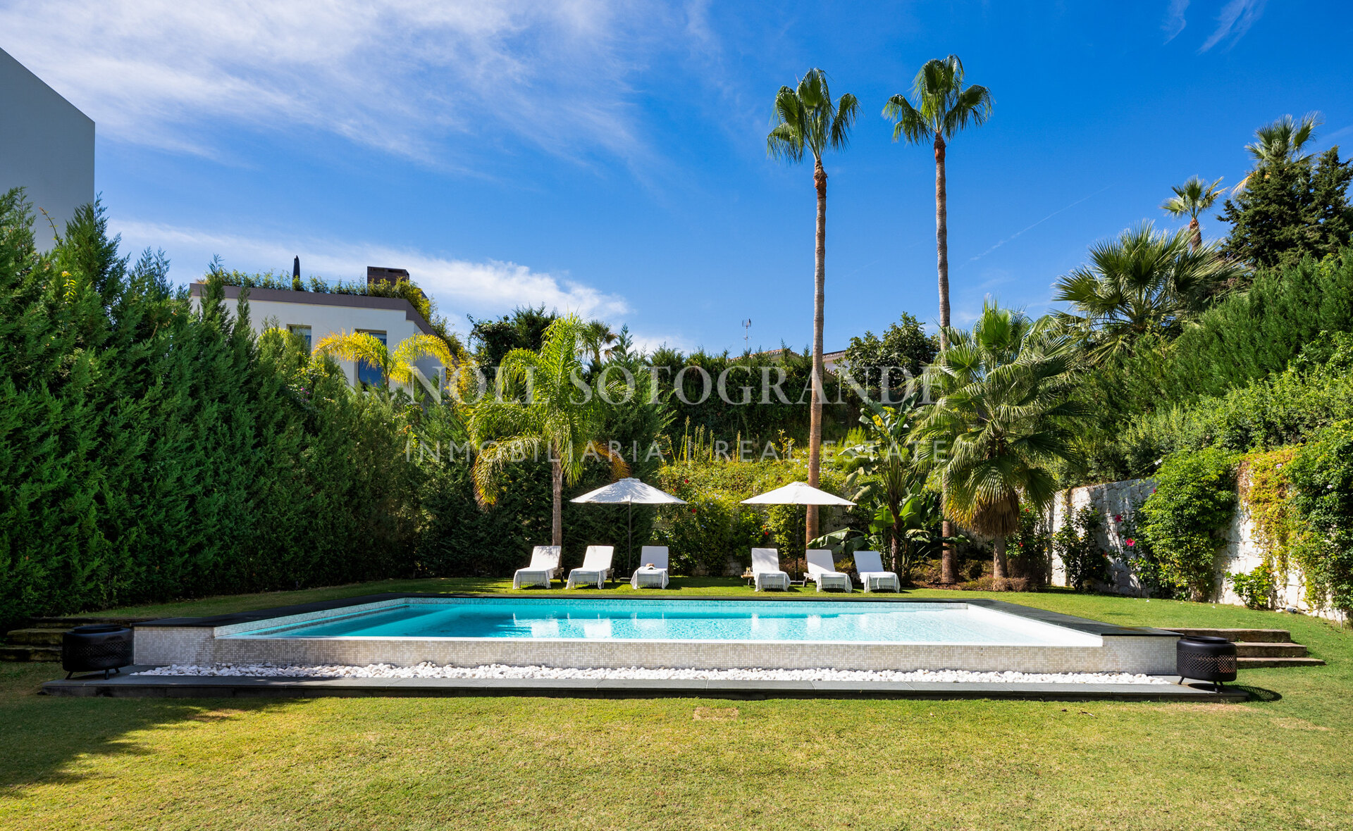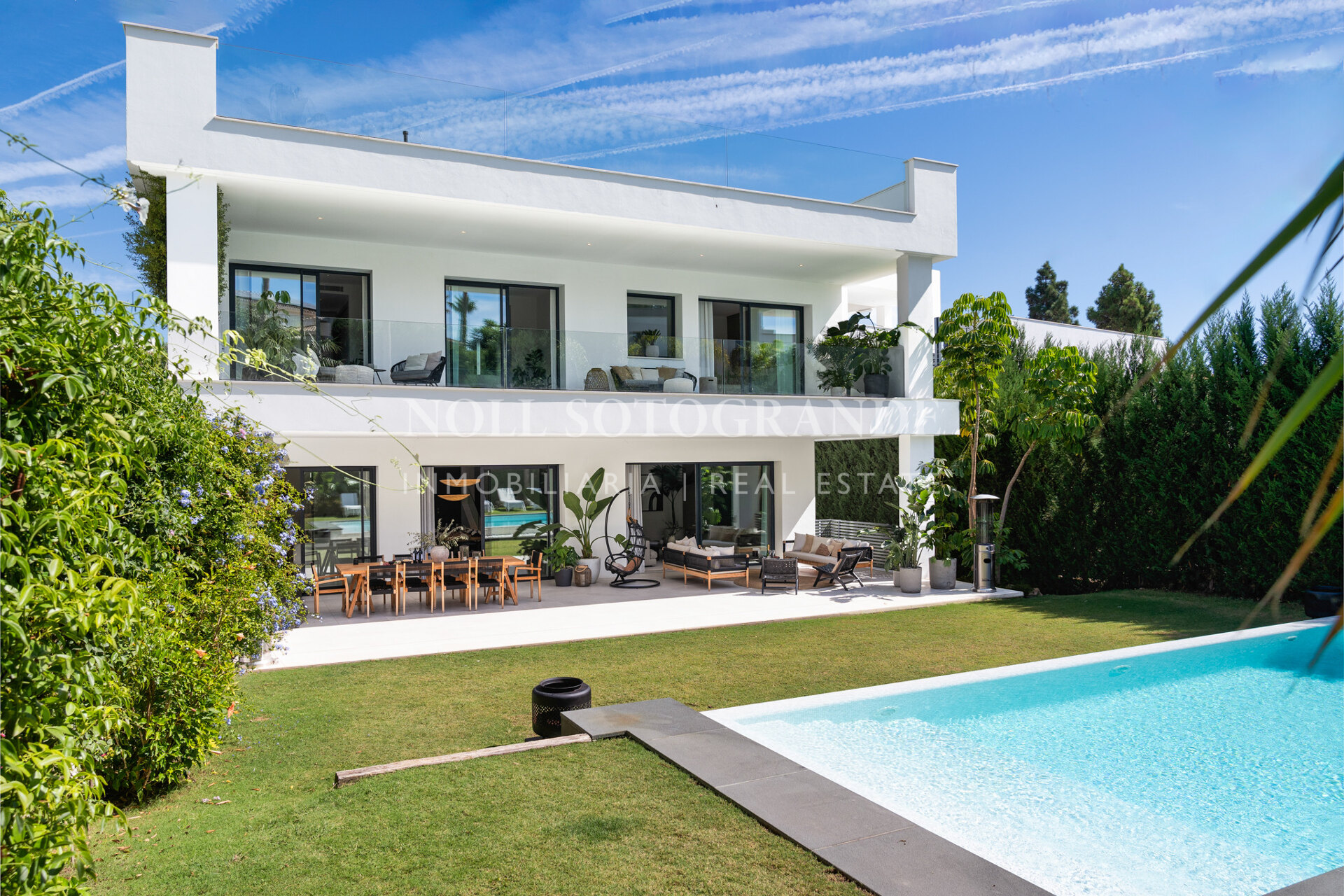 Located on the border between Puerto Banus and Nueva Andalucía, this West-facing 5-bedroom villa offers both luxury and an unrivalled location. This modern property with a built area of 517m2 and a large private and quiet garden with swimming pool, was constructed in 2020 and has since been updated to further enhance its features.