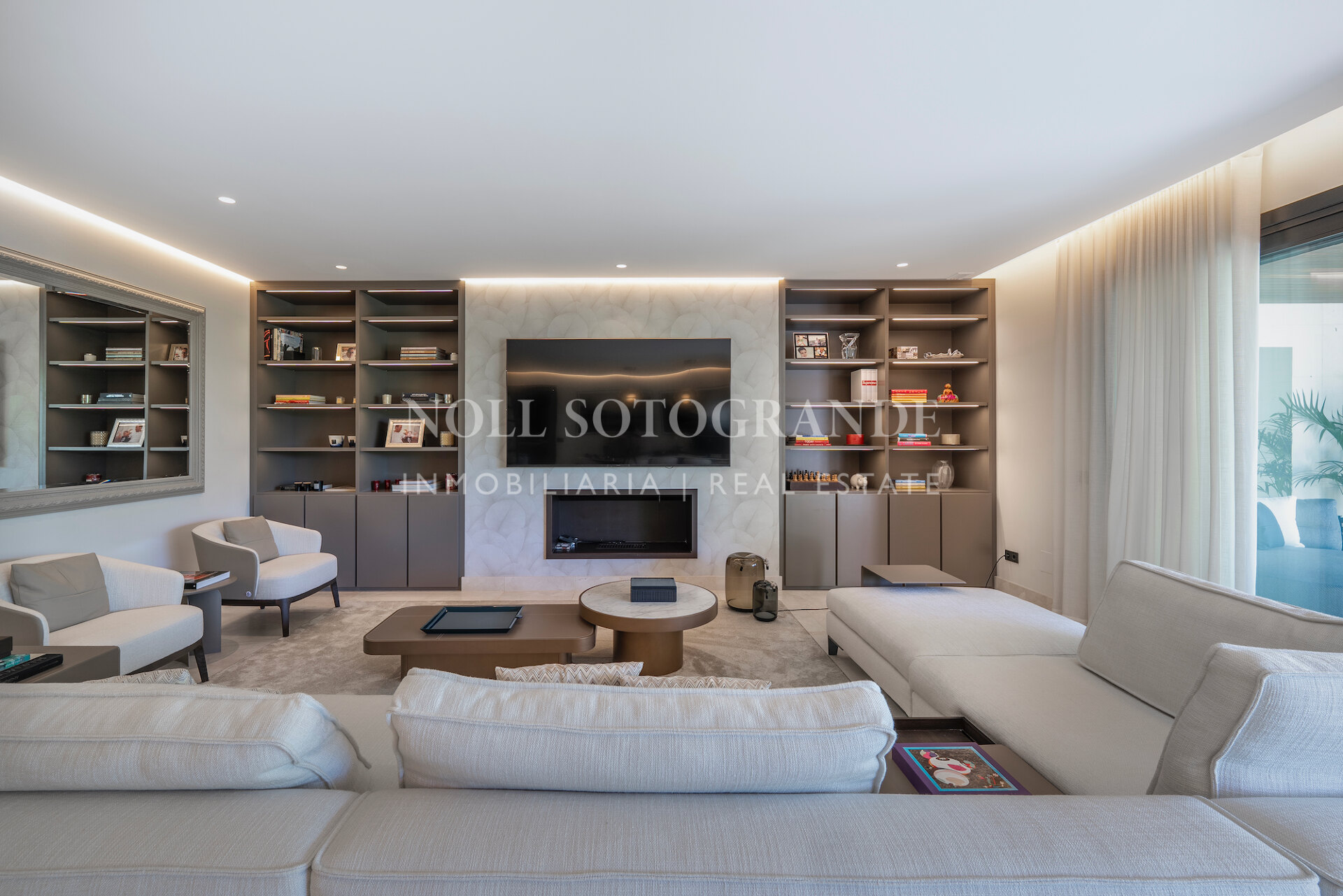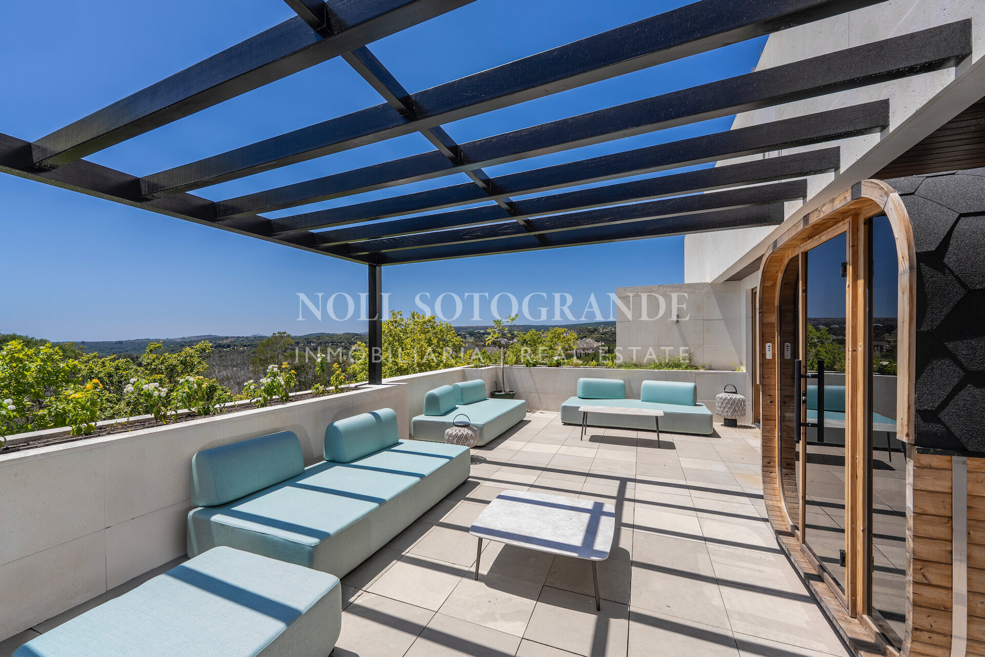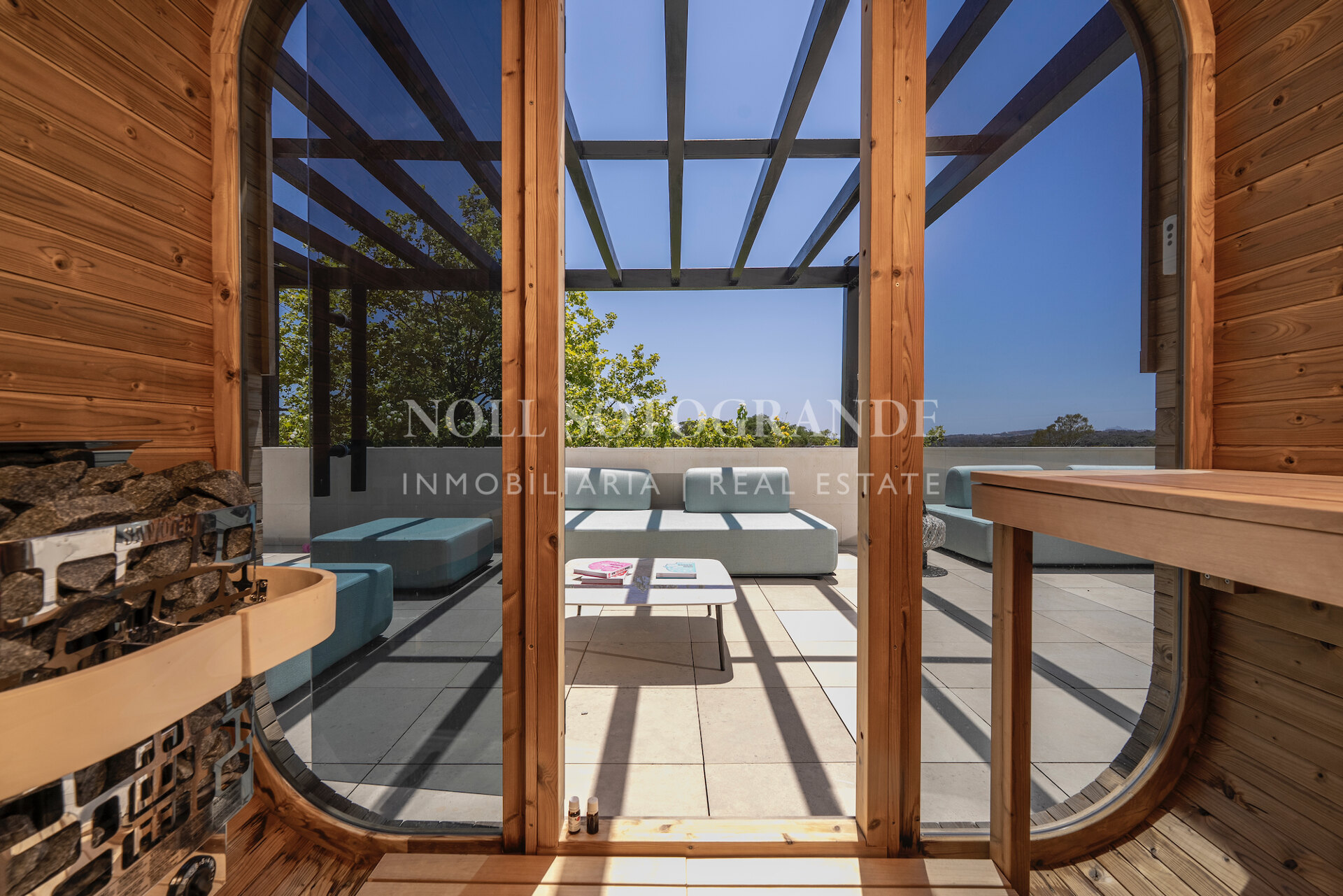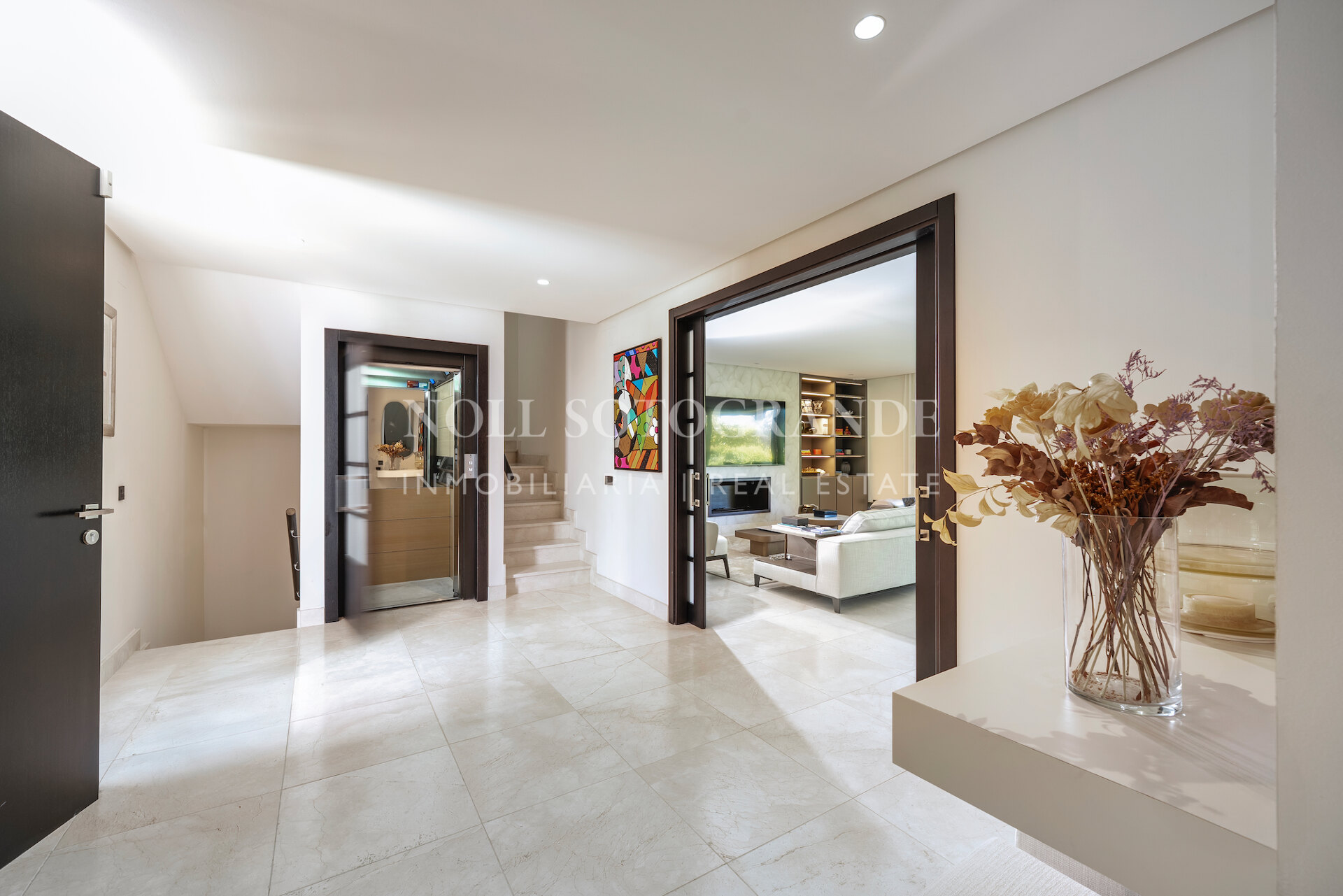 For those who desire a carefree life in a villa without having to worry about maintaining the building, swimming pool, or garden, this “villa apartment” offers pure luxury living. The interior and exterior decoration features the best brands. The ground floor comprises a large, bright living and dining area with access to the covered terrace, an Arclinea kitchen with fossil oak finish designed by Antonio Citterio and Gaggenau appliances, a guest toilet, and a spacious office. On the first floor are three bedroom suites that share a spacious south-facing terrace. Upstairs is the master suite with bathroom, dressing room, and work area, as well as a magnificent private solarium terrace.