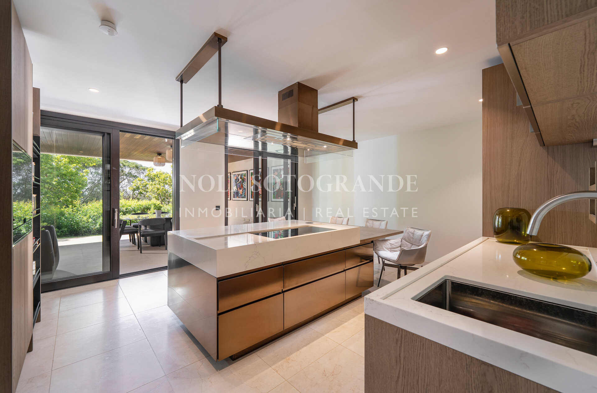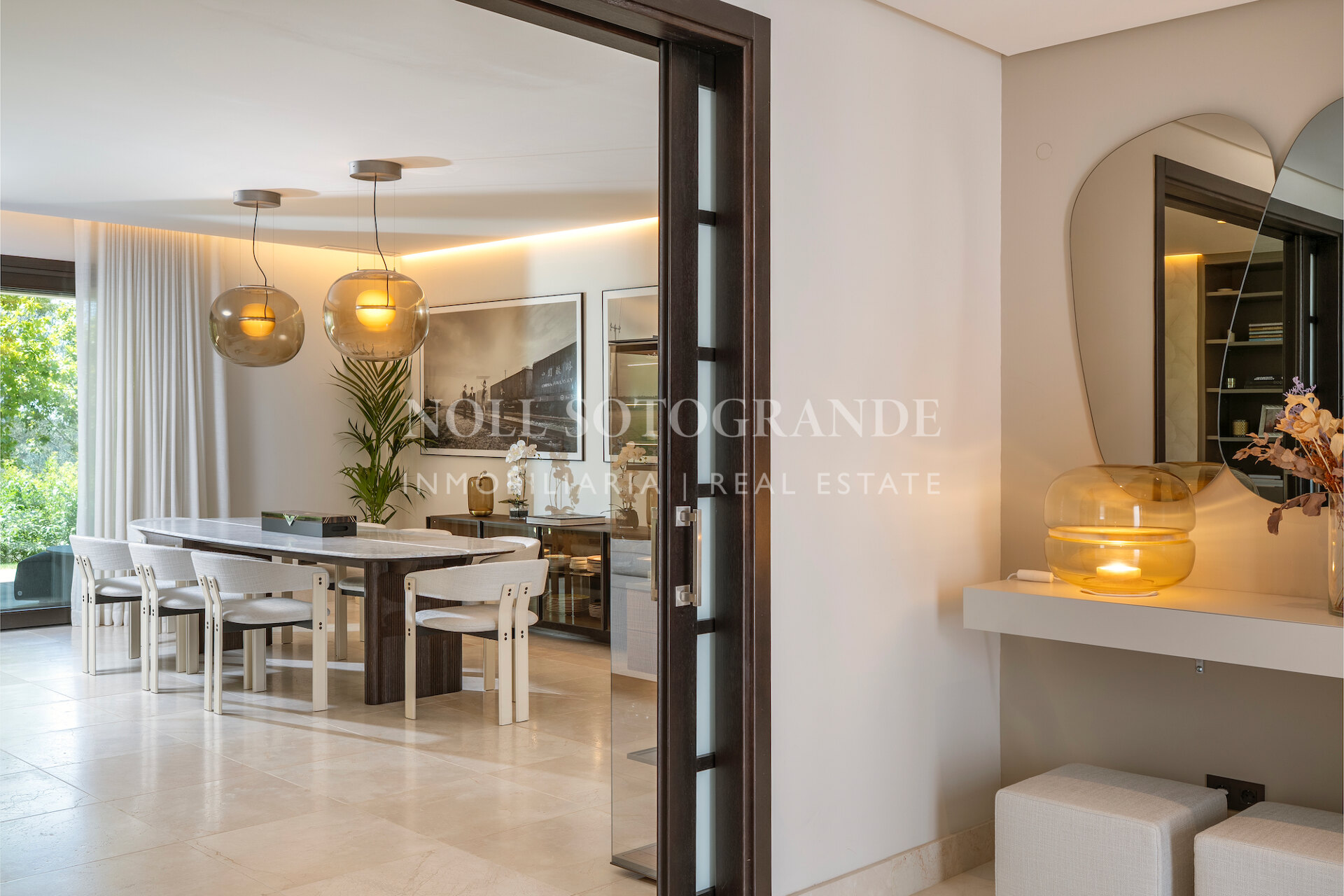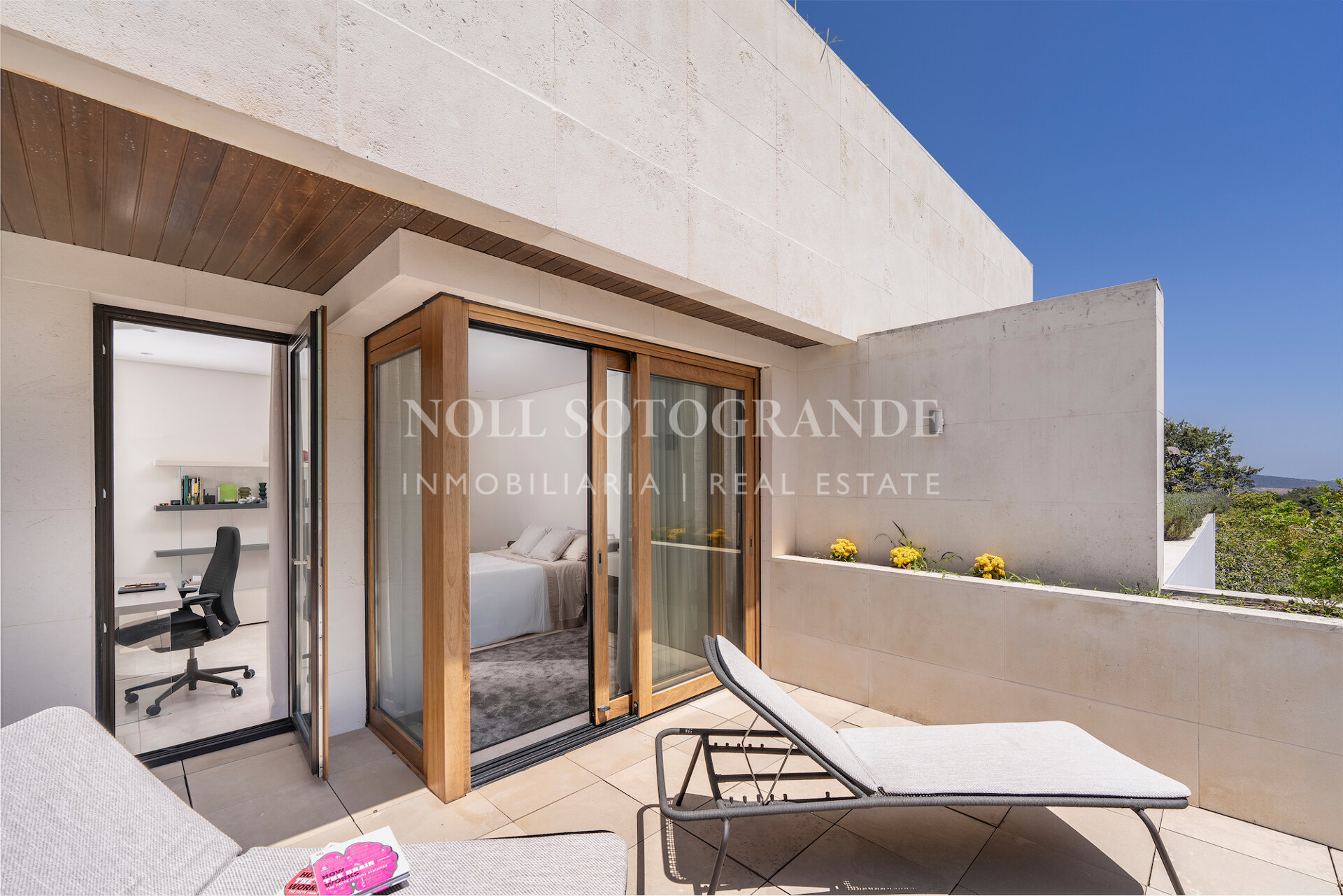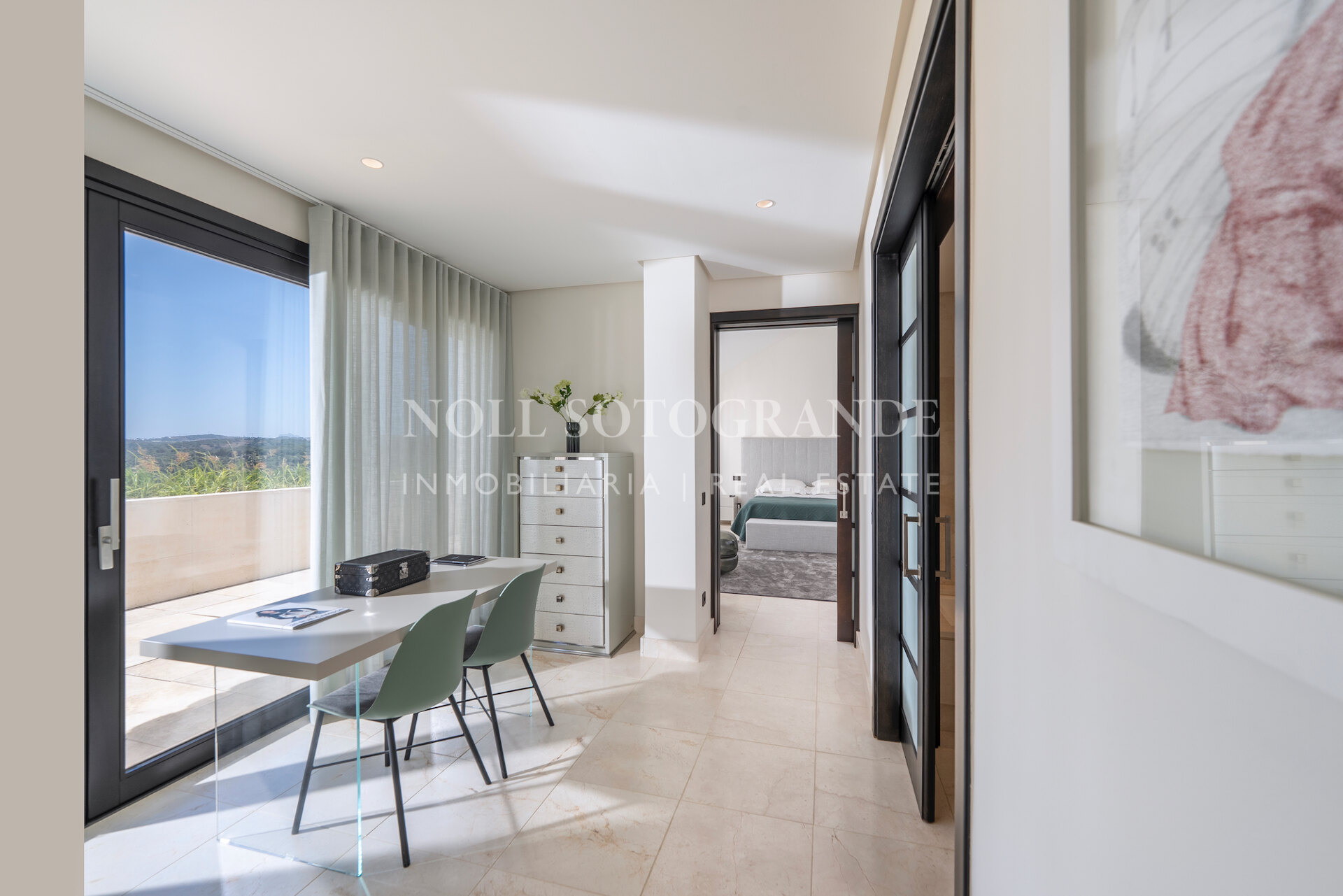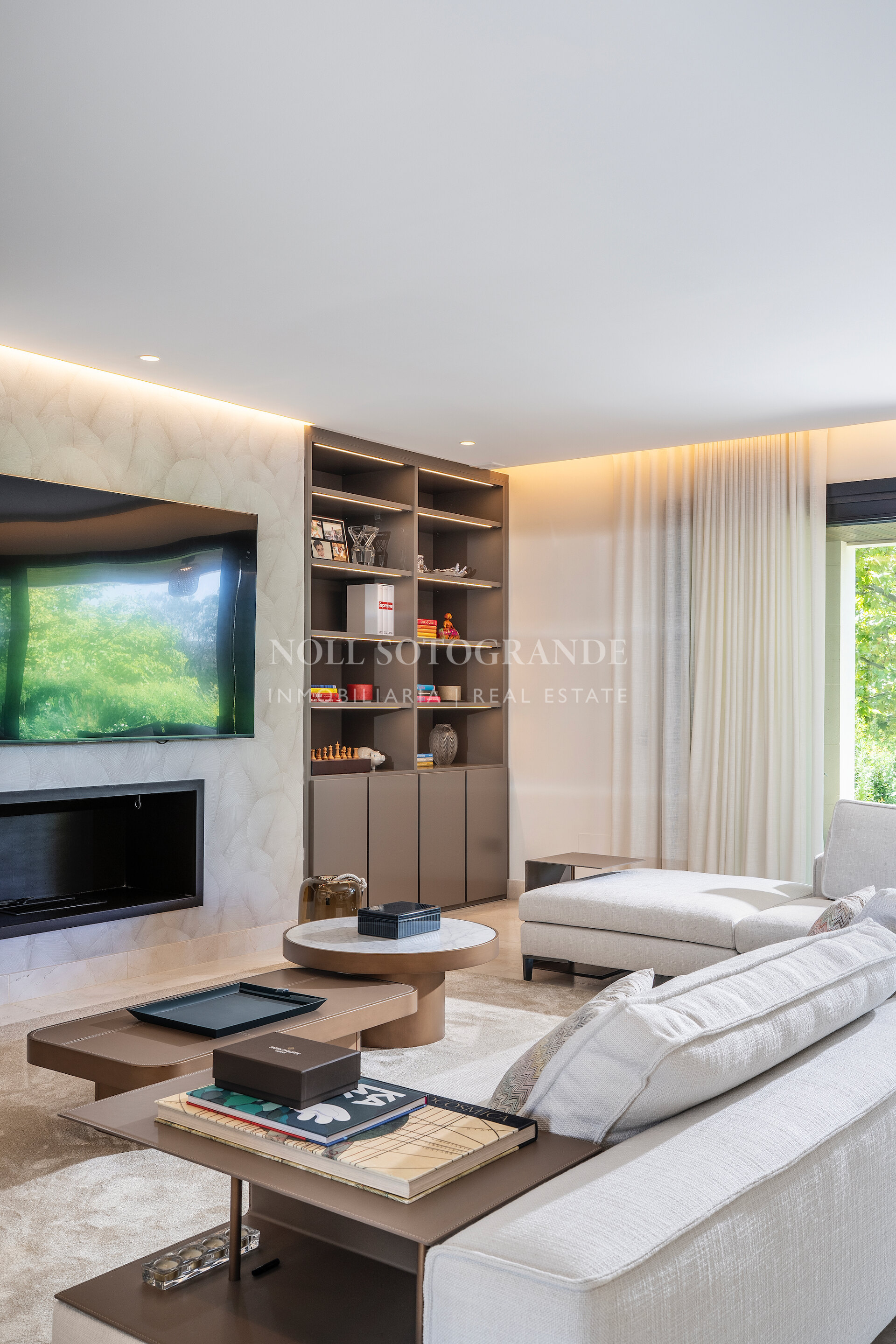 For those who desire a carefree life in a villa without having to worry about maintaining the building, swimming pool, or garden, this “villa apartment” offers pure luxury living. The interior and exterior decoration features the best brands. The ground floor comprises a large, bright living and dining area with access to the covered terrace, an Arclinea kitchen with fossil oak finish designed by Antonio Citterio and Gaggenau appliances, a guest toilet, and a spacious office. On the first floor are three bedroom suites that share a spacious south-facing terrace. Upstairs is the master suite with bathroom, dressing room, and work area, as well as a magnificent private solarium terrace.