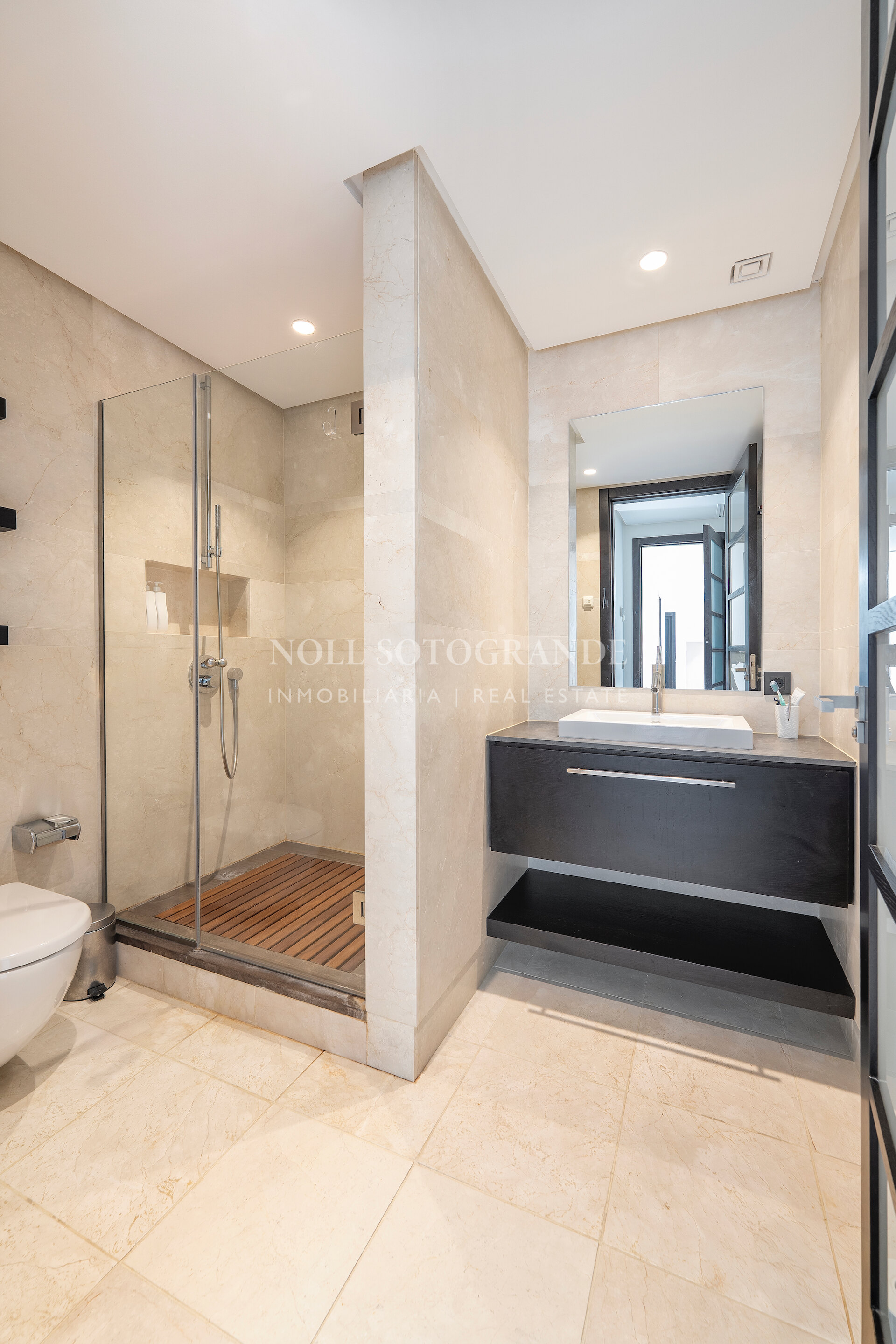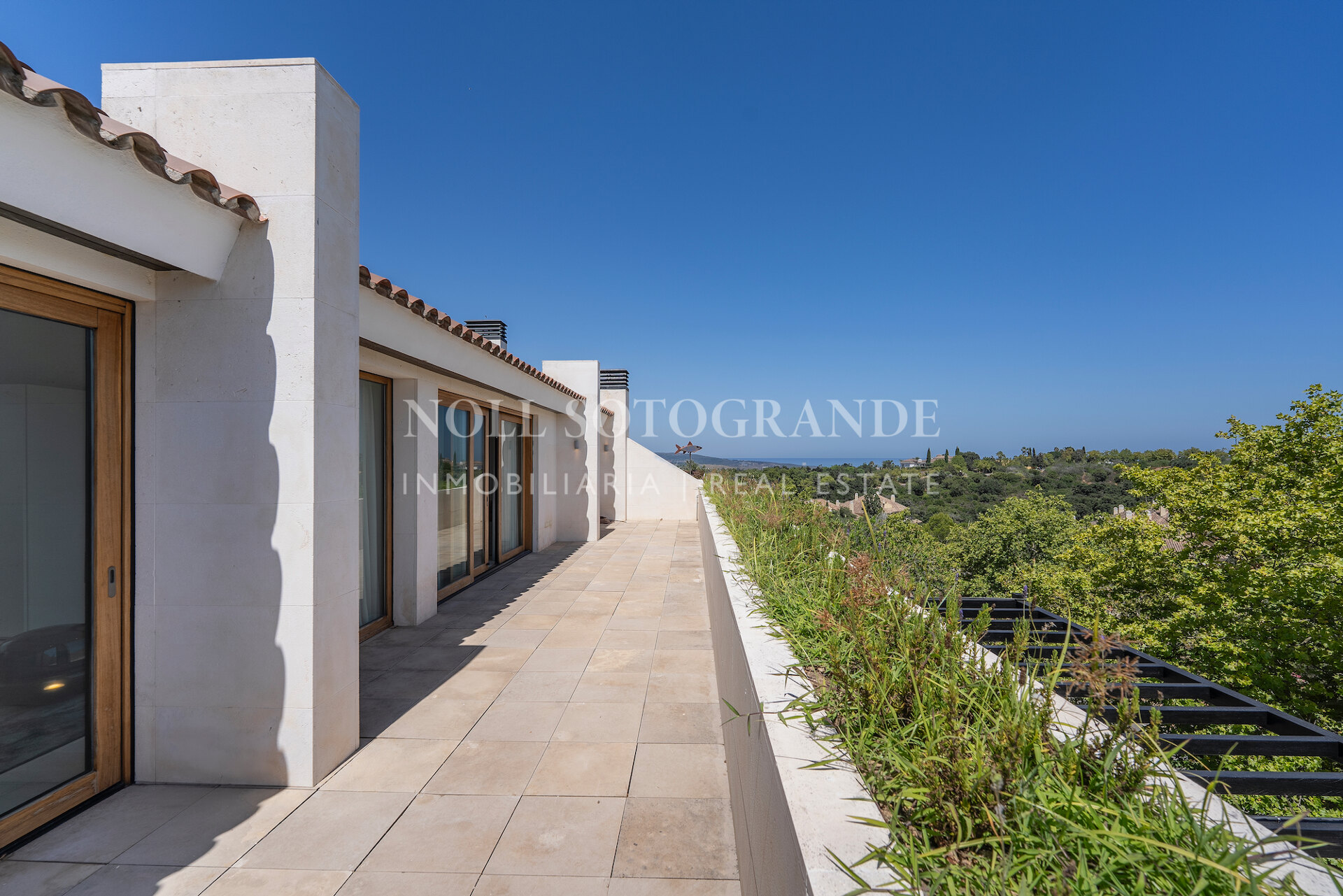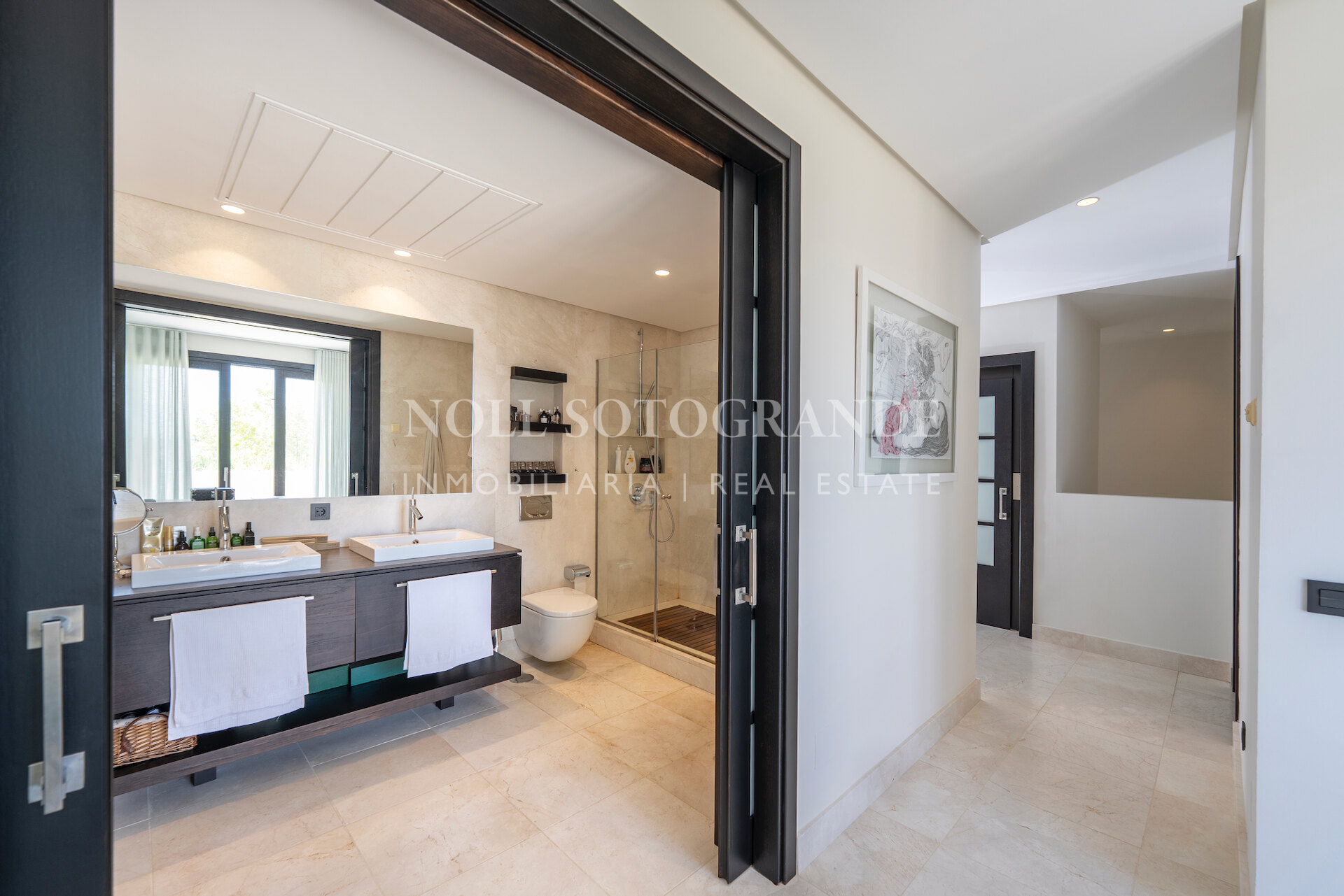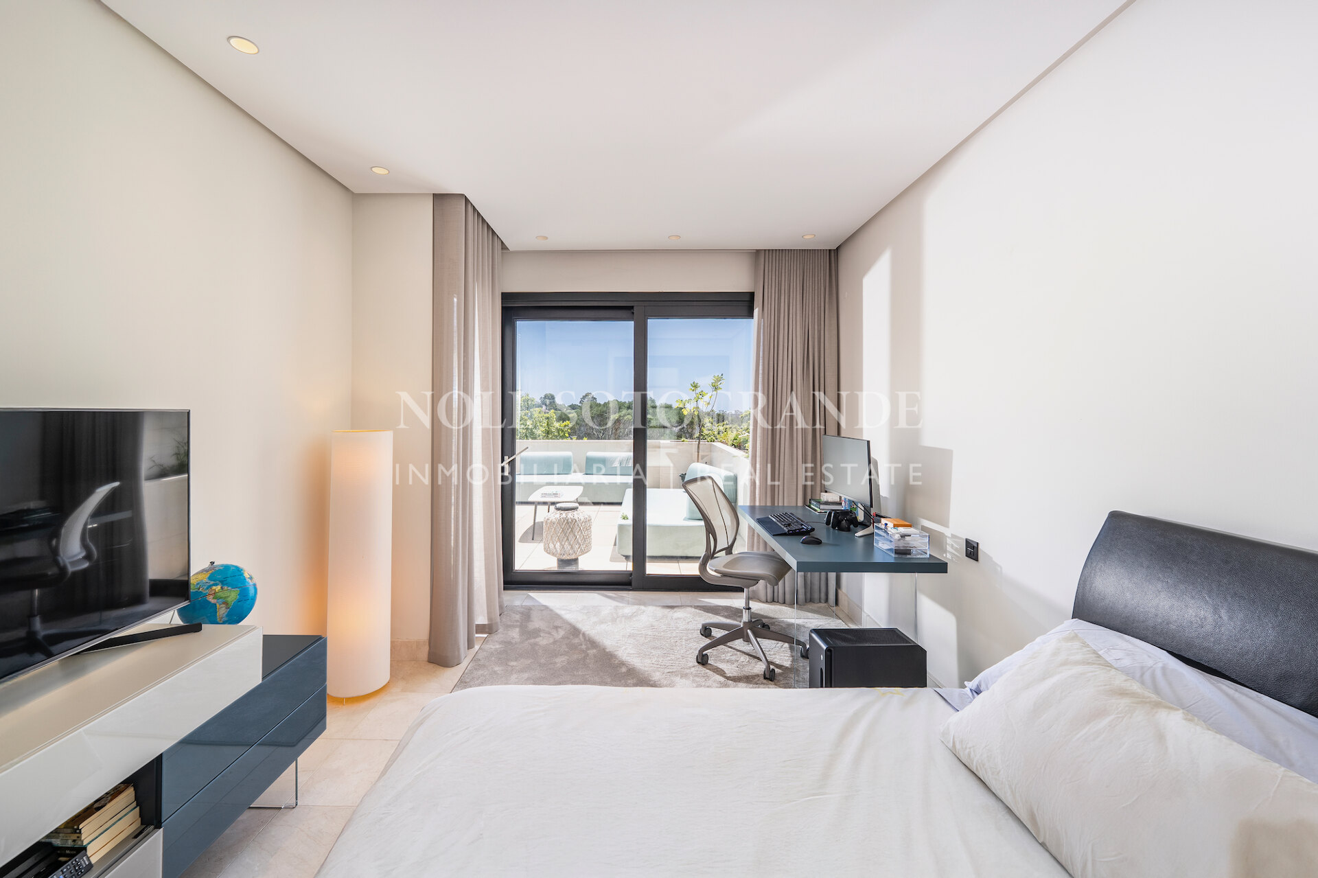 For those who desire a carefree life in a villa without having to worry about maintaining the building, swimming pool, or garden, this “villa apartment” offers pure luxury living. The interior and exterior decoration features the best brands. The ground floor comprises a large, bright living and dining area with access to the covered terrace, an Arclinea kitchen with fossil oak finish designed by Antonio Citterio and Gaggenau appliances, a guest toilet, and a spacious office. On the first floor are three bedroom suites that share a spacious south-facing terrace. Upstairs is the master suite with bathroom, dressing room, and work area, as well as a magnificent private solarium terrace.