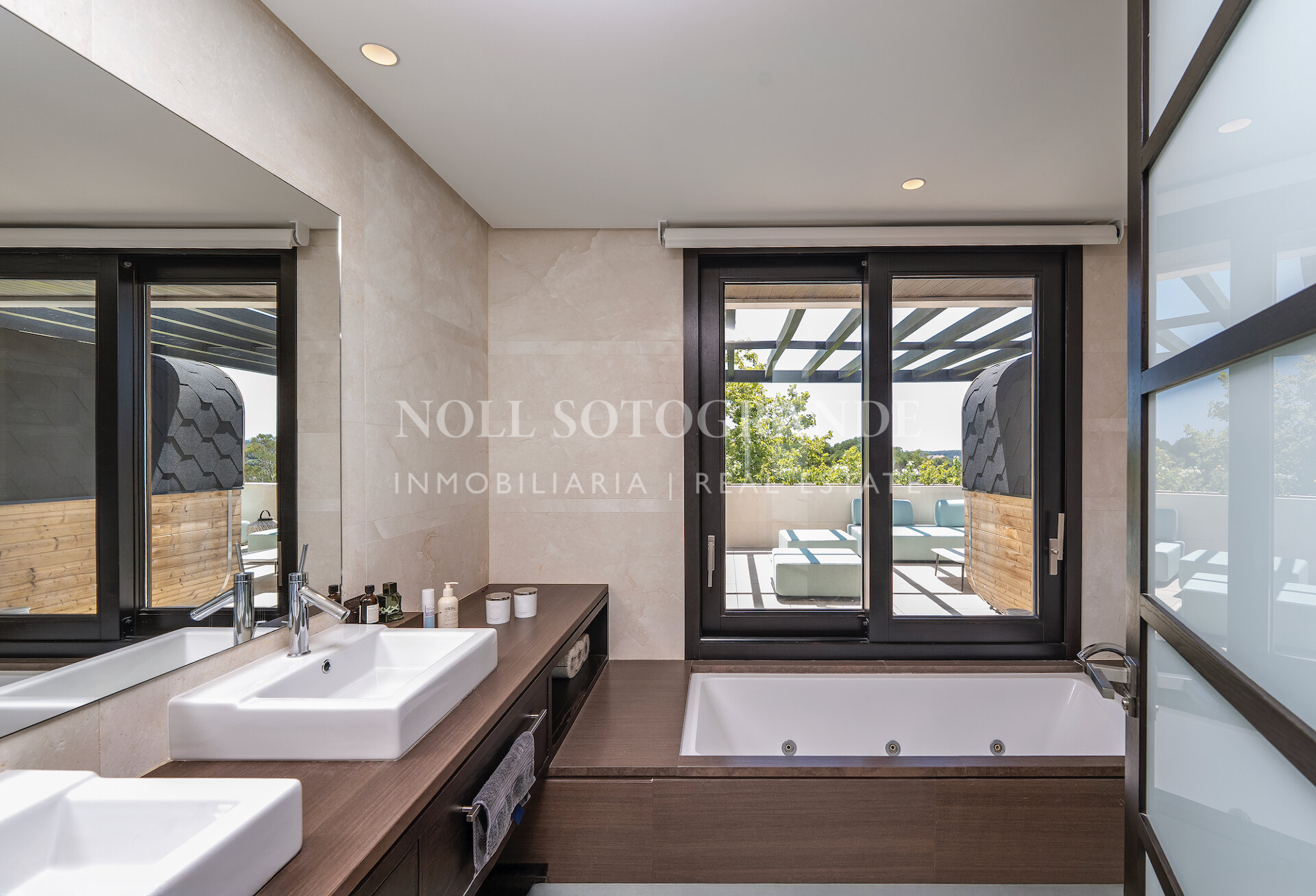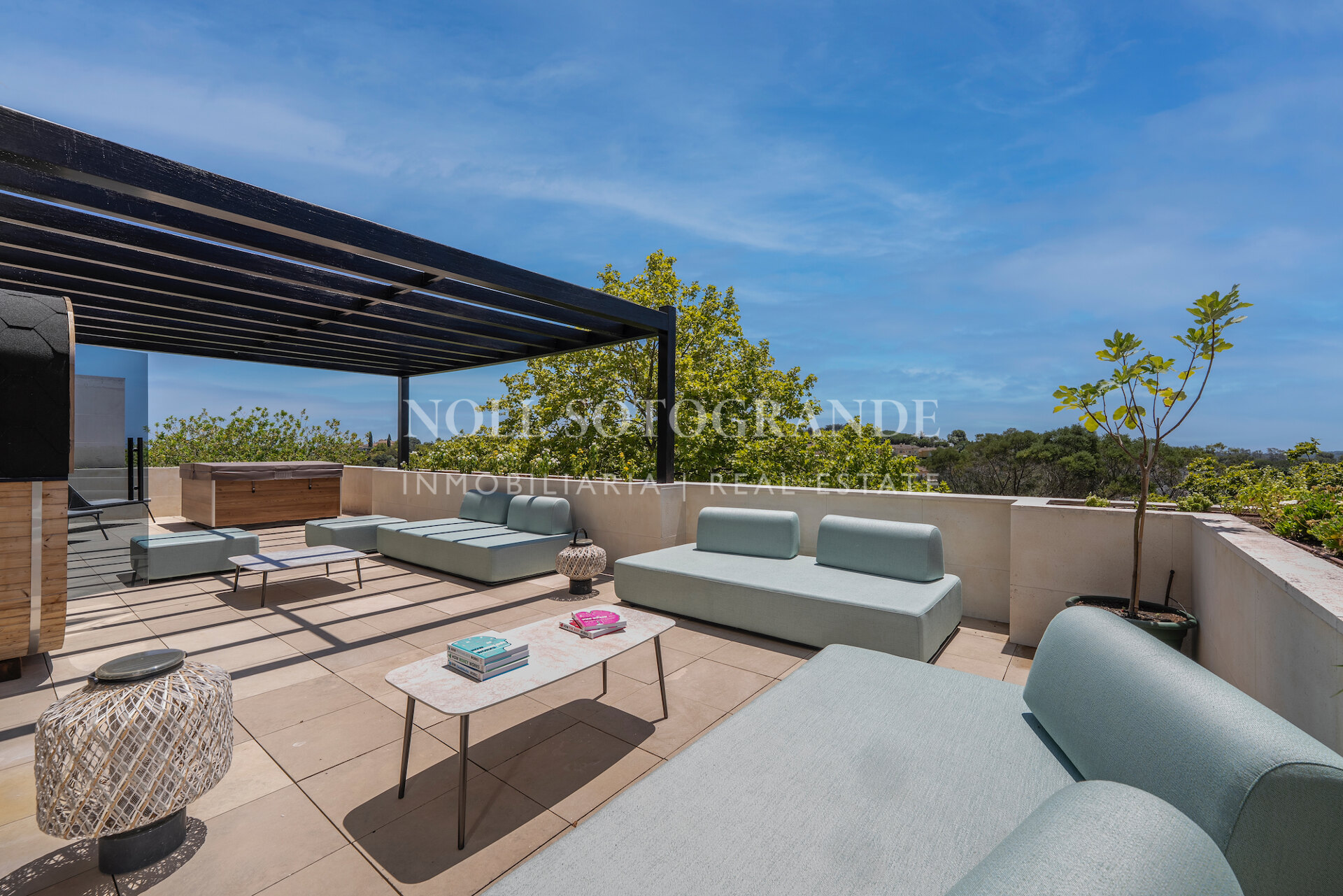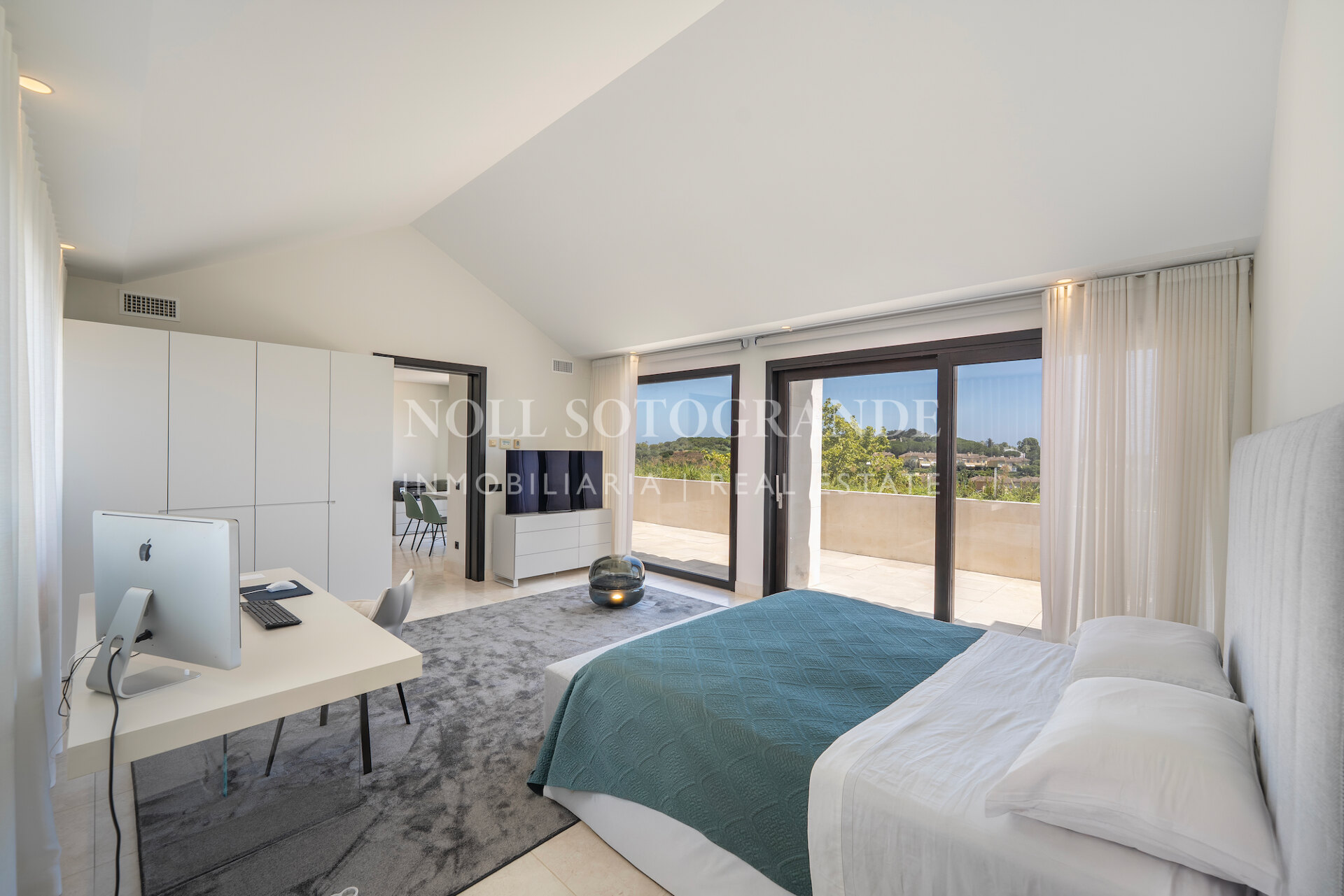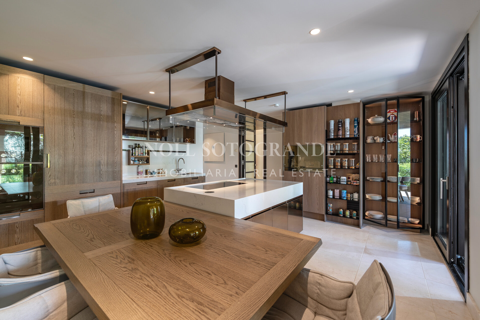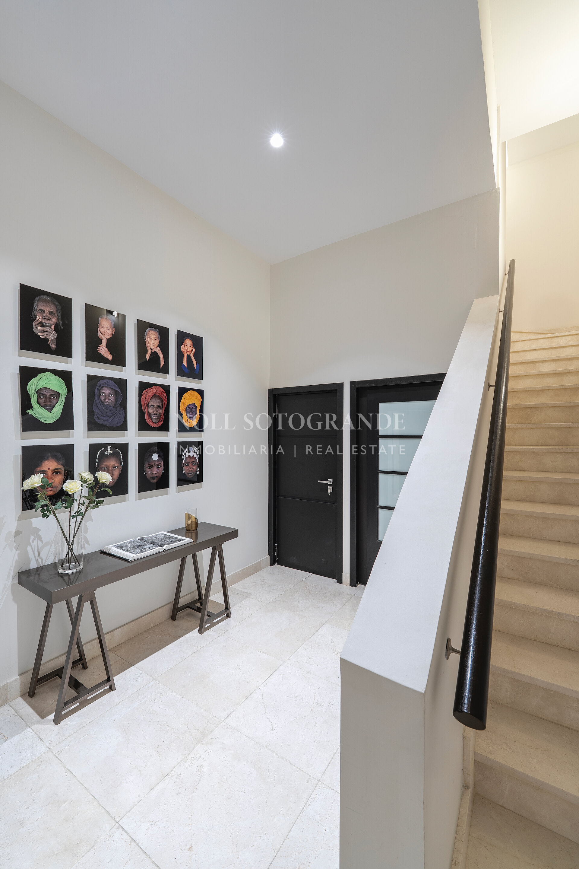 For those who desire a carefree life in a villa without having to worry about maintaining the building, swimming pool, or garden, this “villa apartment” offers pure luxury living. The interior and exterior decoration features the best brands. The ground floor comprises a large, bright living and dining area with access to the covered terrace, an Arclinea kitchen with fossil oak finish designed by Antonio Citterio and Gaggenau appliances, a guest toilet, and a spacious office. On the first floor are three bedroom suites that share a spacious south-facing terrace. Upstairs is the master suite with bathroom, dressing room, and work area, as well as a magnificent private solarium terrace.