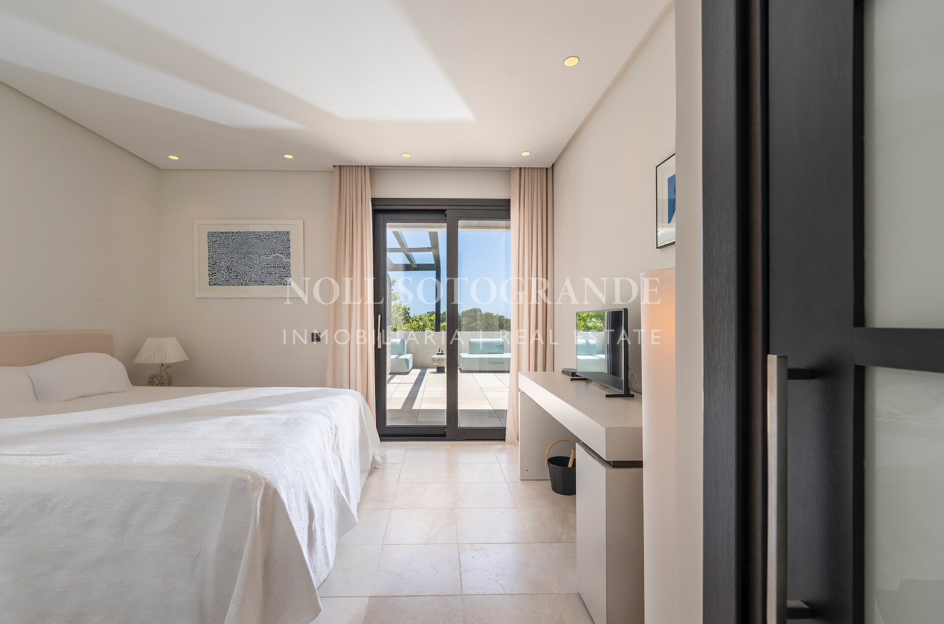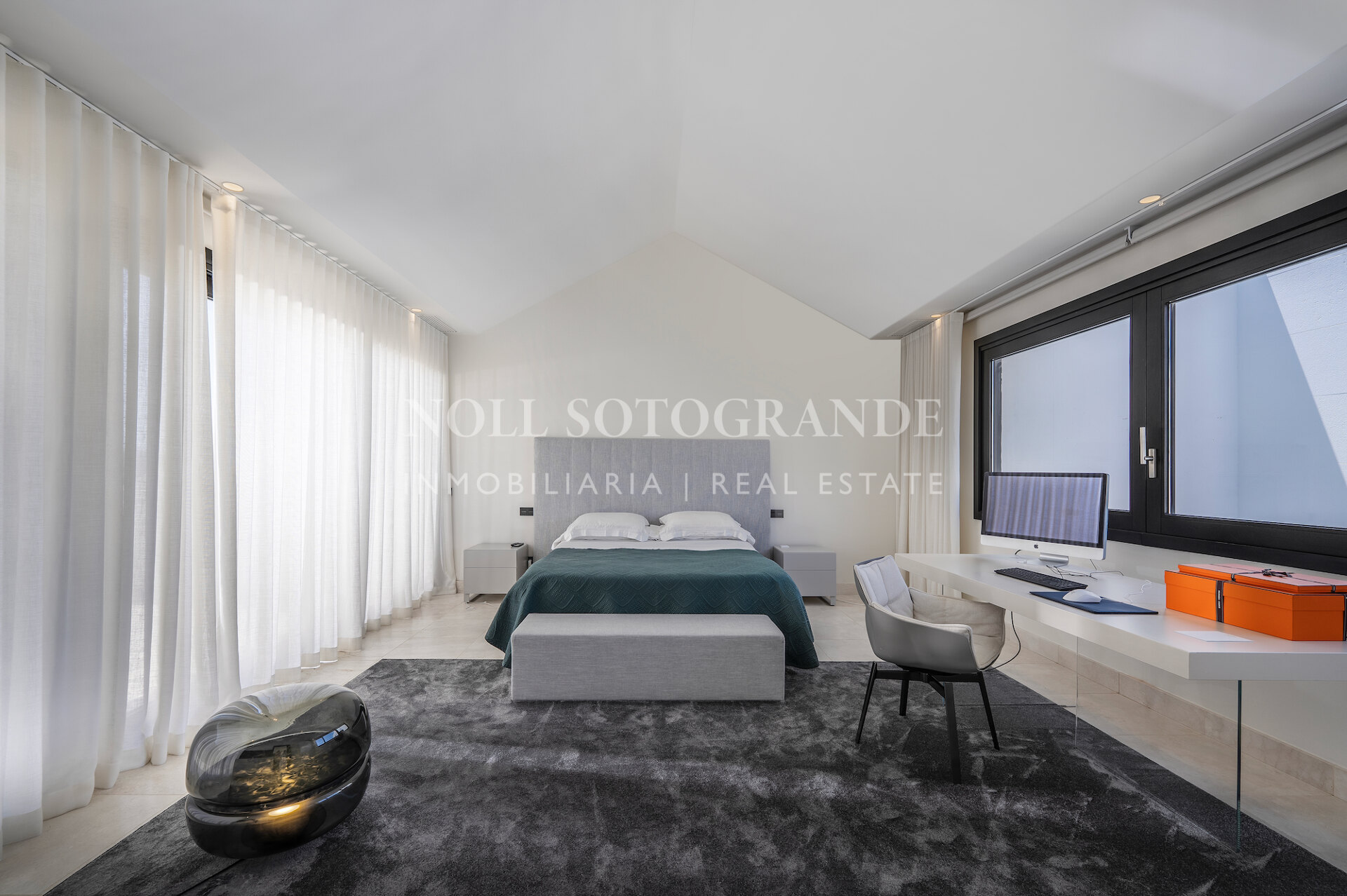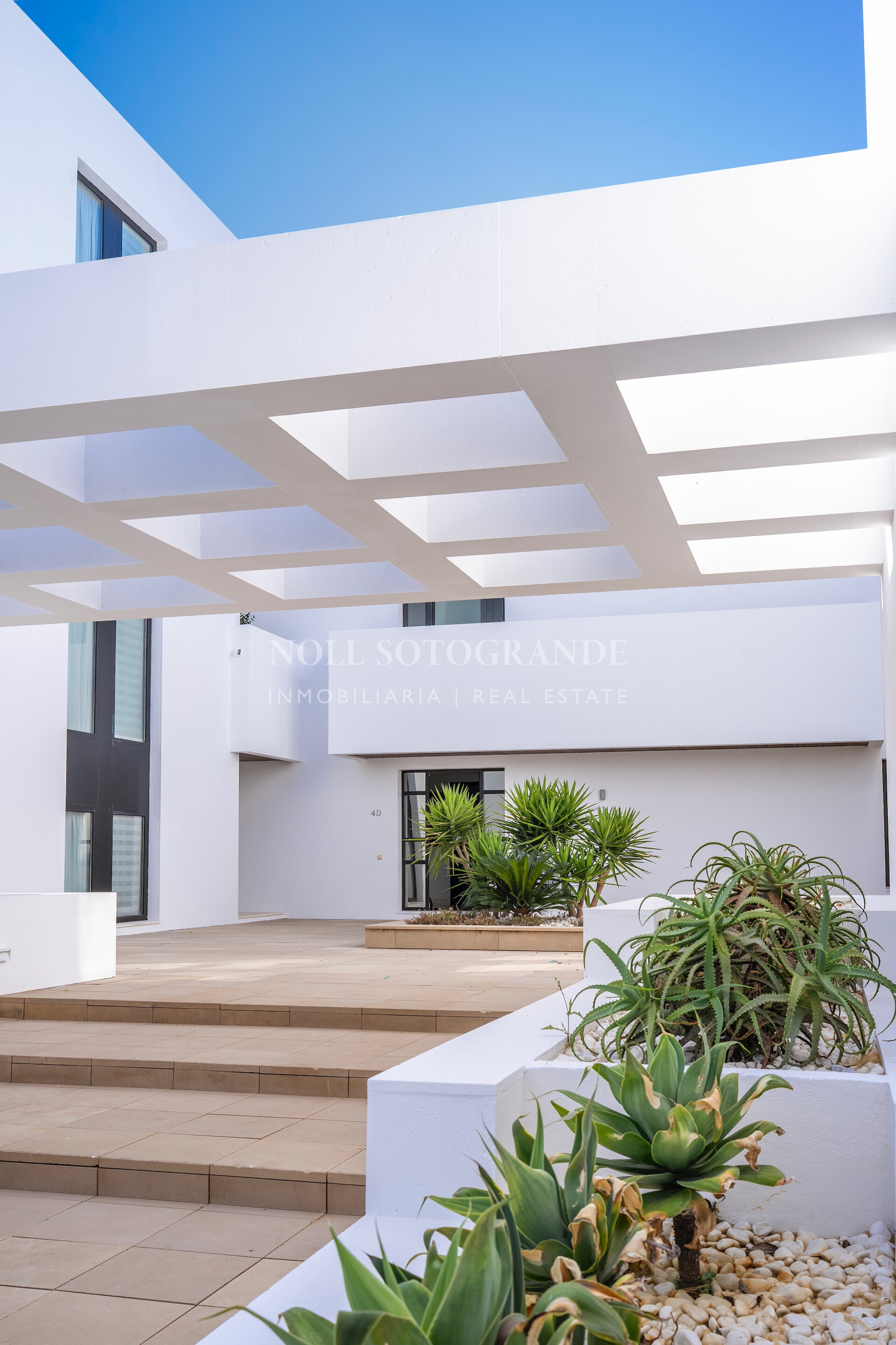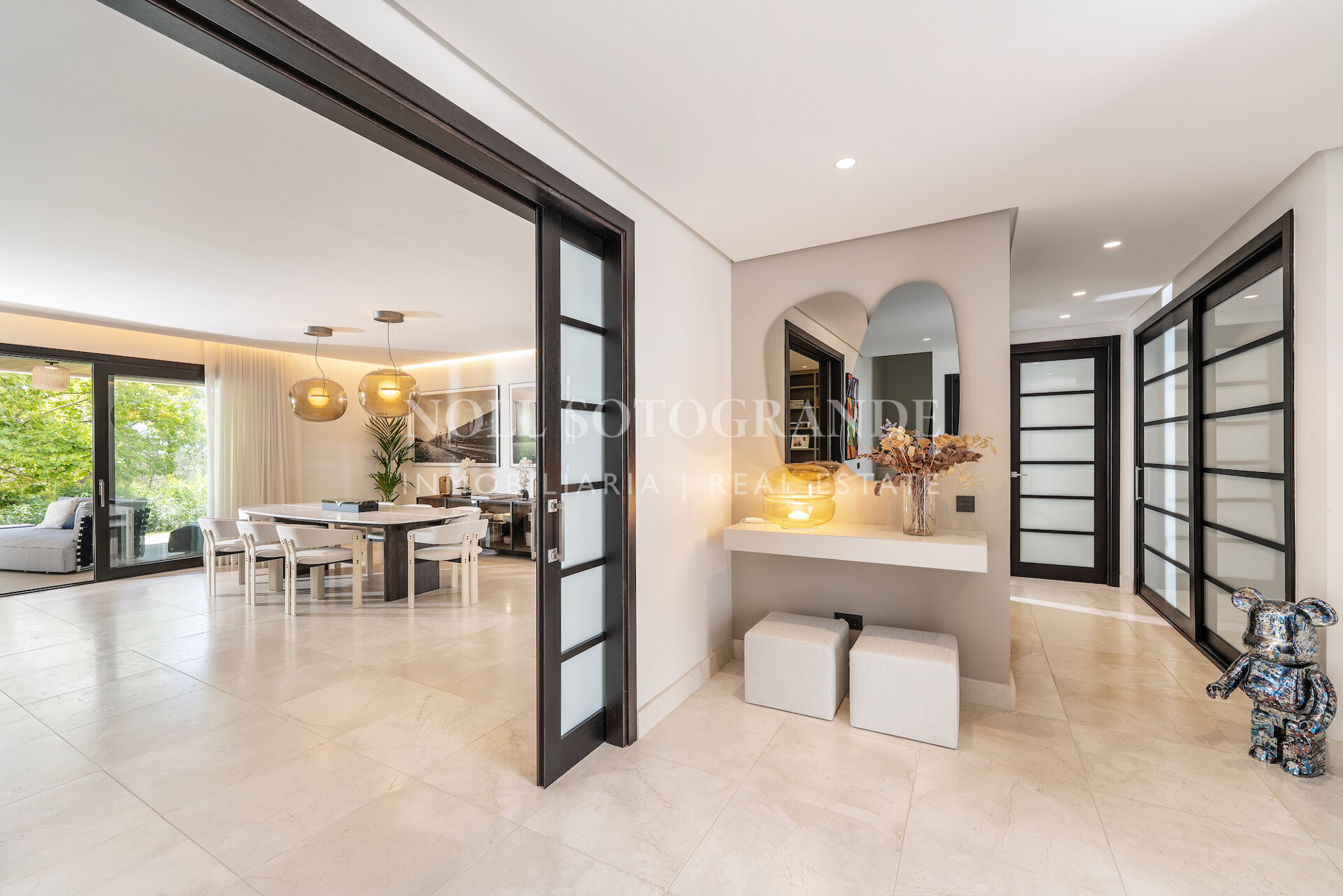 For those who desire a carefree life in a villa without having to worry about maintaining the building, swimming pool, or garden, this “villa apartment” offers pure luxury living. The interior and exterior decoration features the best brands. The ground floor comprises a large, bright living and dining area with access to the covered terrace, an Arclinea kitchen with fossil oak finish designed by Antonio Citterio and Gaggenau appliances, a guest toilet, and a spacious office. On the first floor are three bedroom suites that share a spacious south-facing terrace. Upstairs is the master suite with bathroom, dressing room, and work area, as well as a magnificent private solarium terrace.